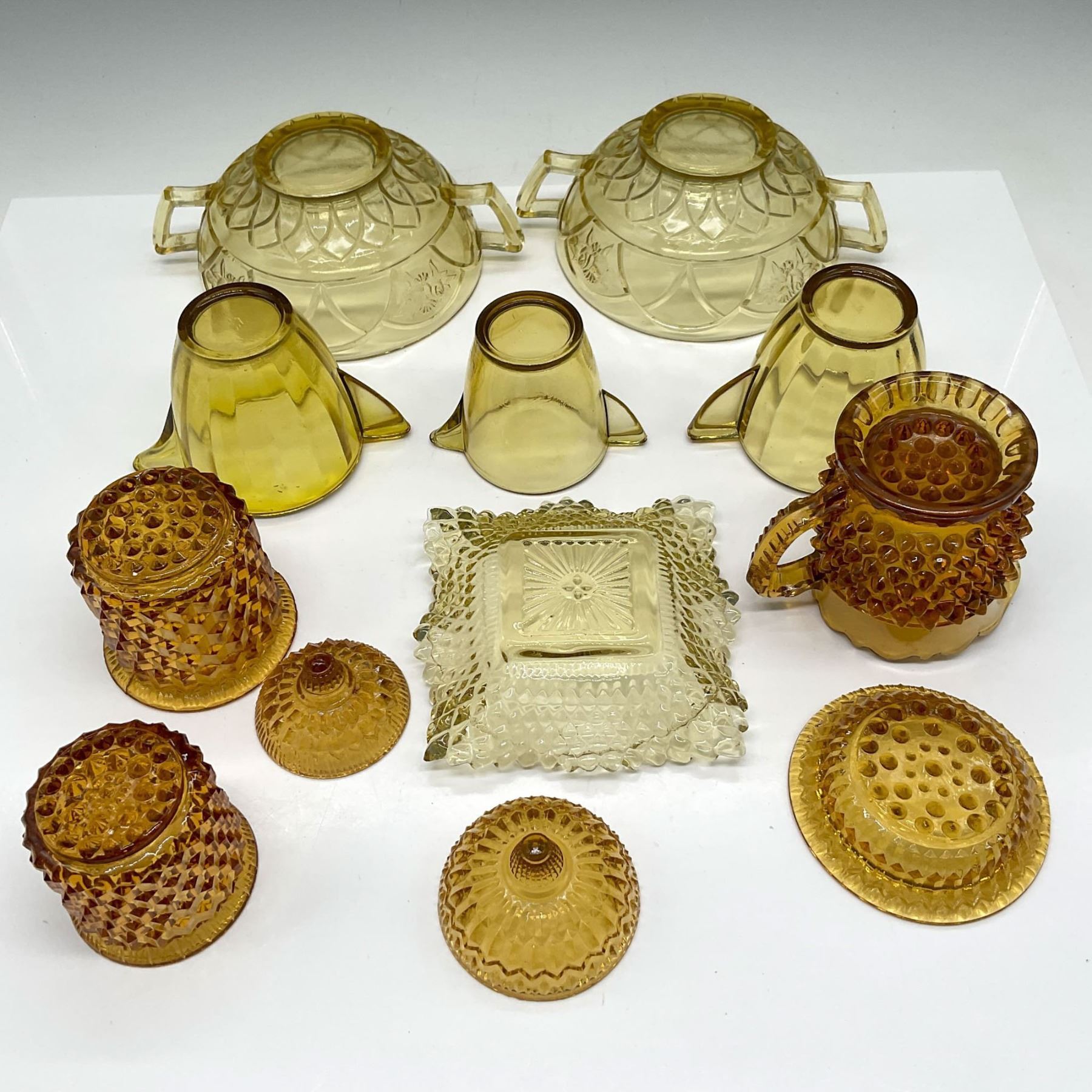 Lot includes to handled soup bowls with embossed design; 2 paneled creamers; small creamer; honeycomb ashtray; and 4 piece Doyle Honeycomb creamer, sugar bowl with lid, butter dish with lid and holder. Largest piece 6.25"L x 5"W x 2.25"H.
