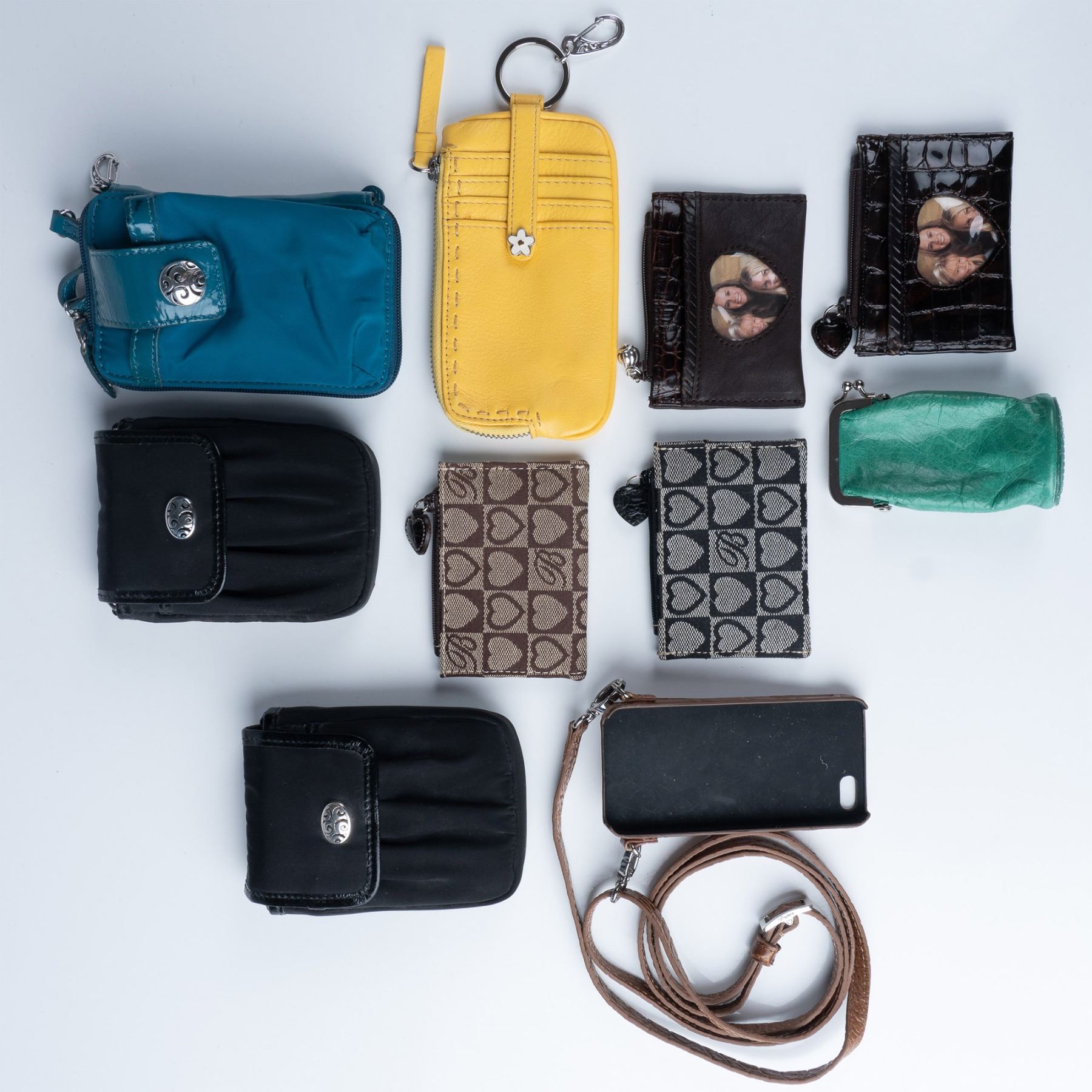 A mix of 9 Brighton compact crossbody bags, wristlets, pouches, and cellphone holder, featuring signature Brighton details such as embossed patterns, heart motifs, and high-quality leather craftsmanship. The bags showcase a variety of colors and designs, from casual chic to sophisticated elegance. 1 HOBO coin purse, a charming green leather coin purse with a classic kiss-lock closure, adding a pop of color to the collection. Known for its premium craftsmanship, HOBO is celebrated for its timeless and functional leather goods. Brighton, and HOBO marked. The largest piece measueres: 3.5"L x 6.5"H.