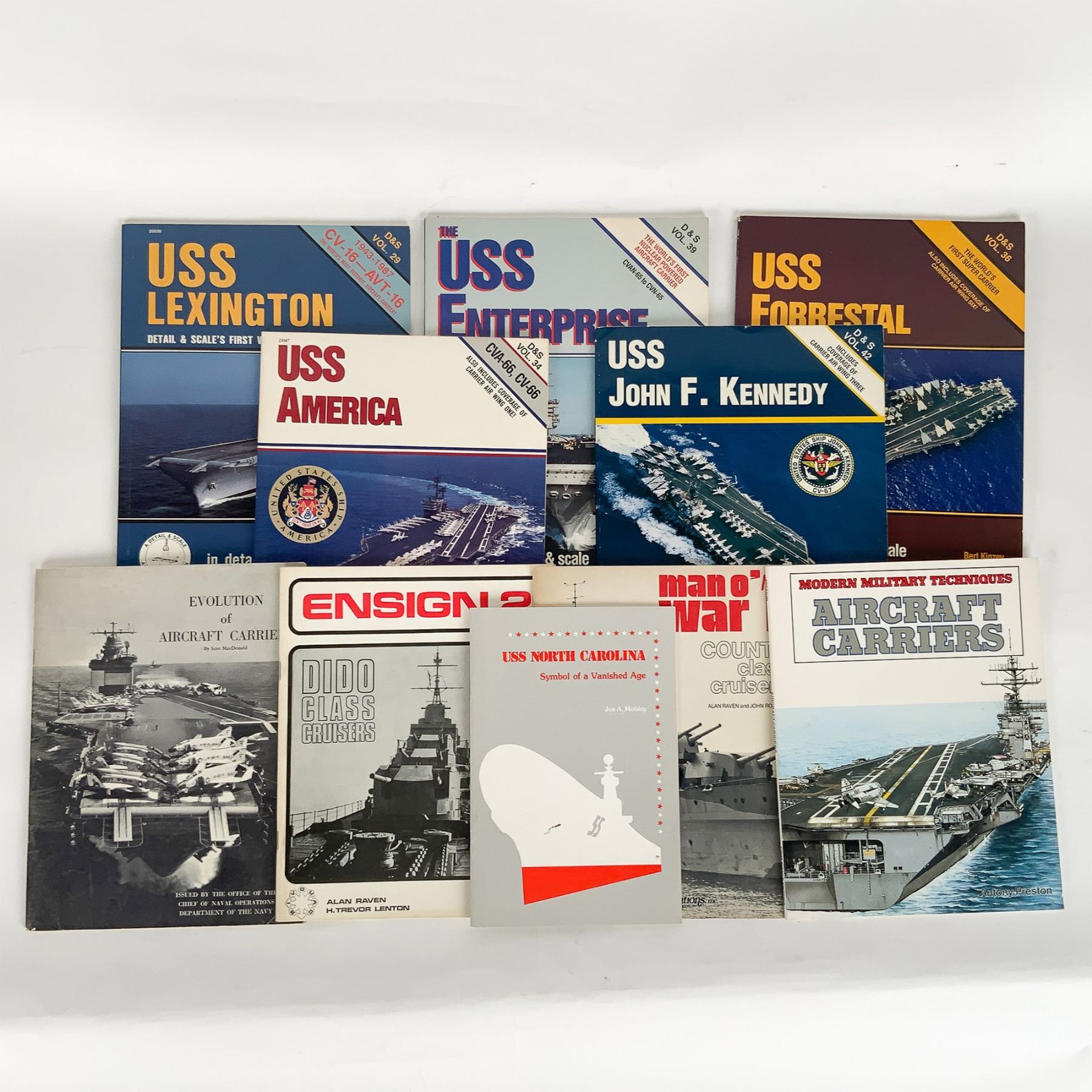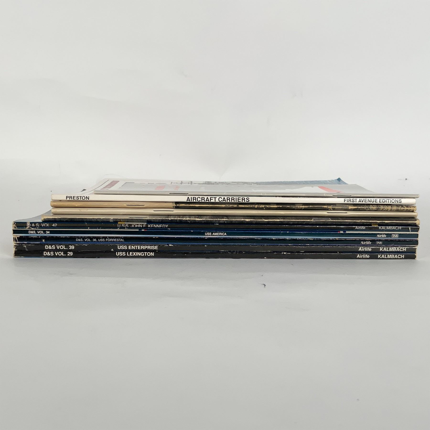 A collection of ten softcover books focusing on naval and military history, with an emphasis on aircraft carriers and warships. The lot includes detailed volumes on U.S. Navy aircraft carriers such as USS Lexington, USS Enterprise, USS Forrestal, USS America, and USS John F. Kennedy, along with books covering topics like the evolution of aircraft carriers, Dido-class cruisers, County-class cruisers, and modern military aircraft carriers. These books contain valuable historical insights, photographs, and technical details, making them an excellent addition to any naval enthusiast’s library. Largest book measures 11"H.