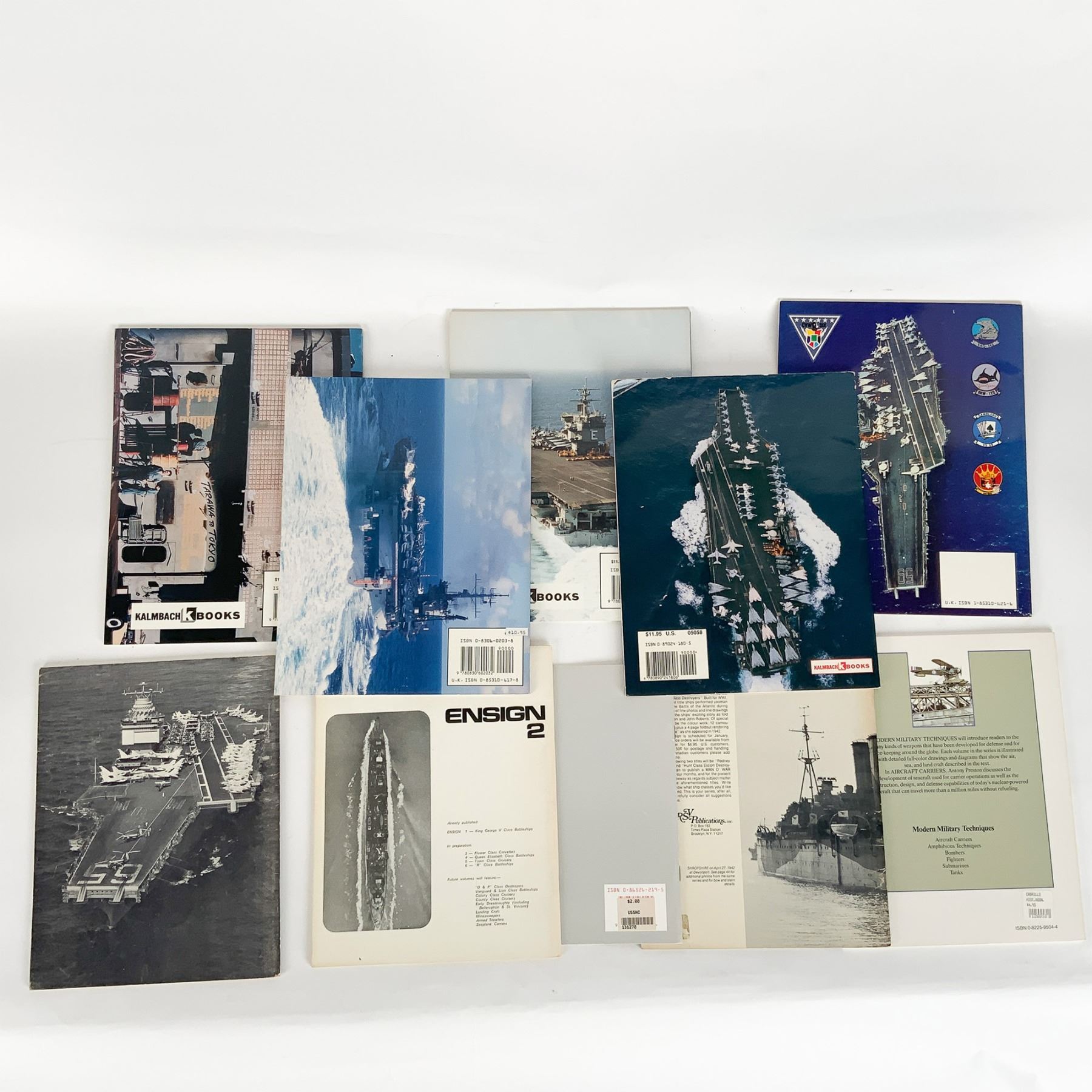 A collection of ten softcover books focusing on naval and military history, with an emphasis on aircraft carriers and warships. The lot includes detailed volumes on U.S. Navy aircraft carriers such as USS Lexington, USS Enterprise, USS Forrestal, USS America, and USS John F. Kennedy, along with books covering topics like the evolution of aircraft carriers, Dido-class cruisers, County-class cruisers, and modern military aircraft carriers. These books contain valuable historical insights, photographs, and technical details, making them an excellent addition to any naval enthusiast’s library. Largest book measures 11"H.