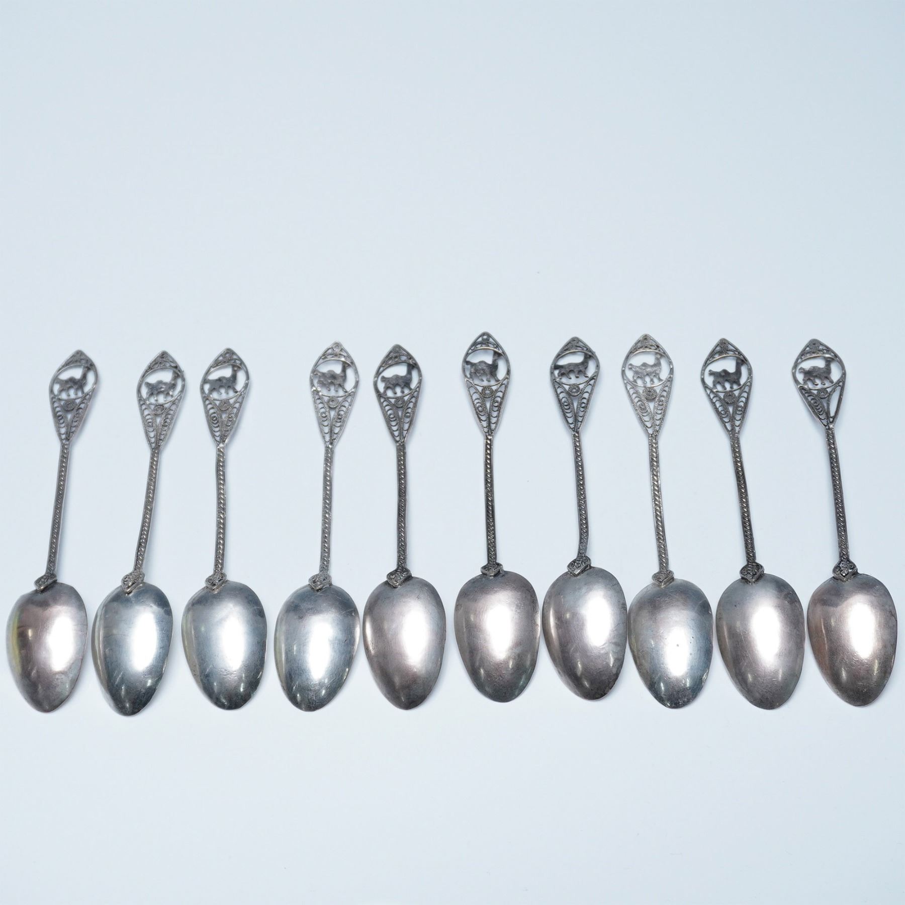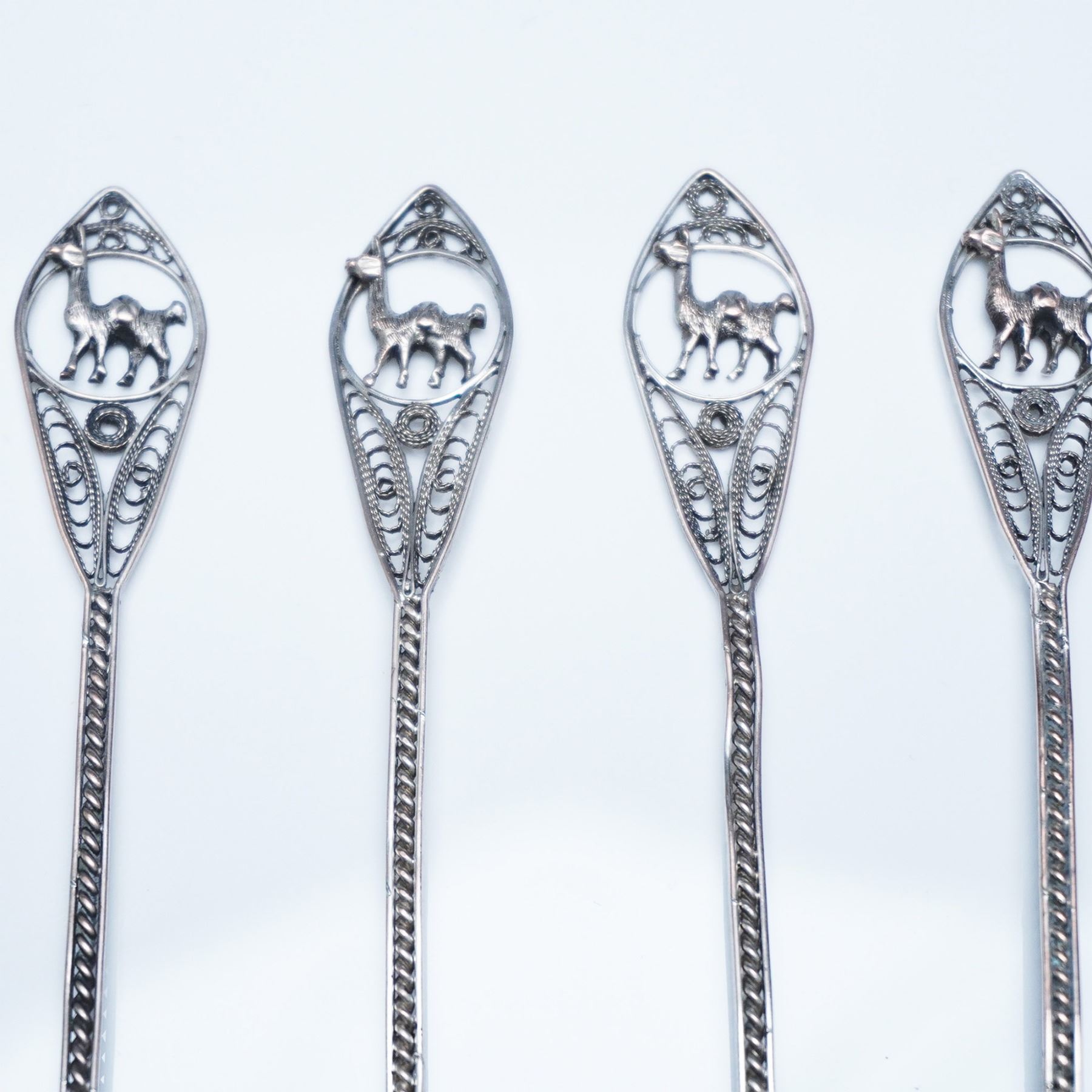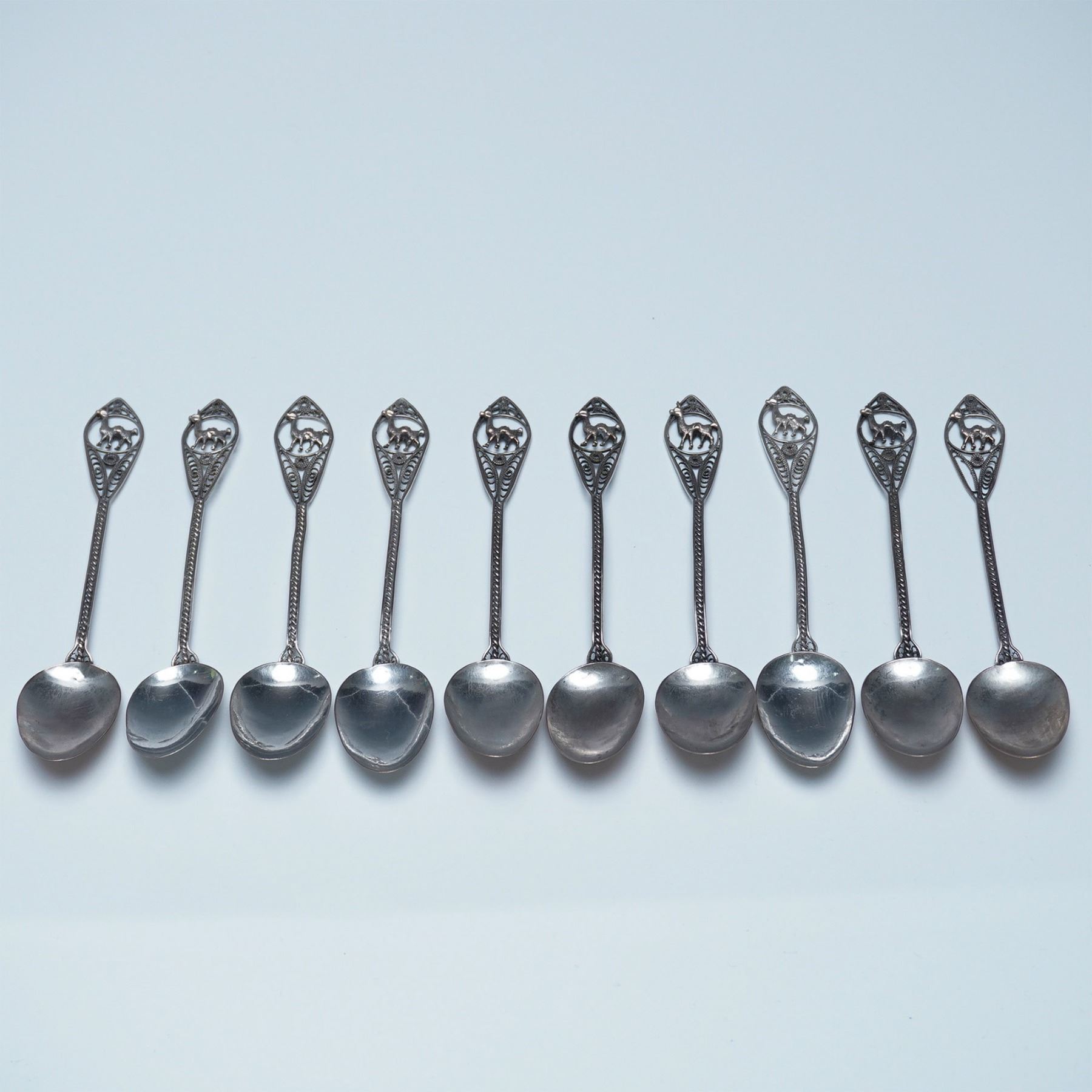 A finely crafted set of 10 filigree metal spoons, each showcasing an intricate openwork handle adorned with a detailed llama motif. The delicate craftsmanship is evident in the braided stem and ornate design, leading to smoothly polished oval bowls. These spoons exhibit a vintage patina, adding to their character and appeal. A striking addition to any collection of decorative metalware or artisan-crafted utensils. Each spoon measures 5"L.