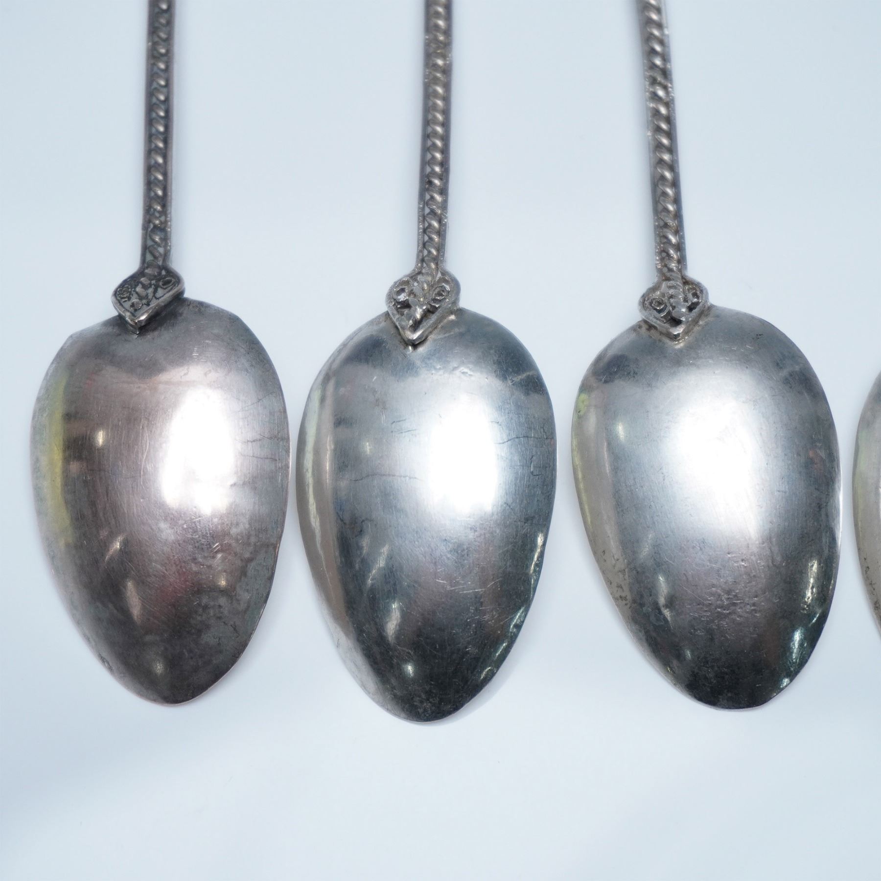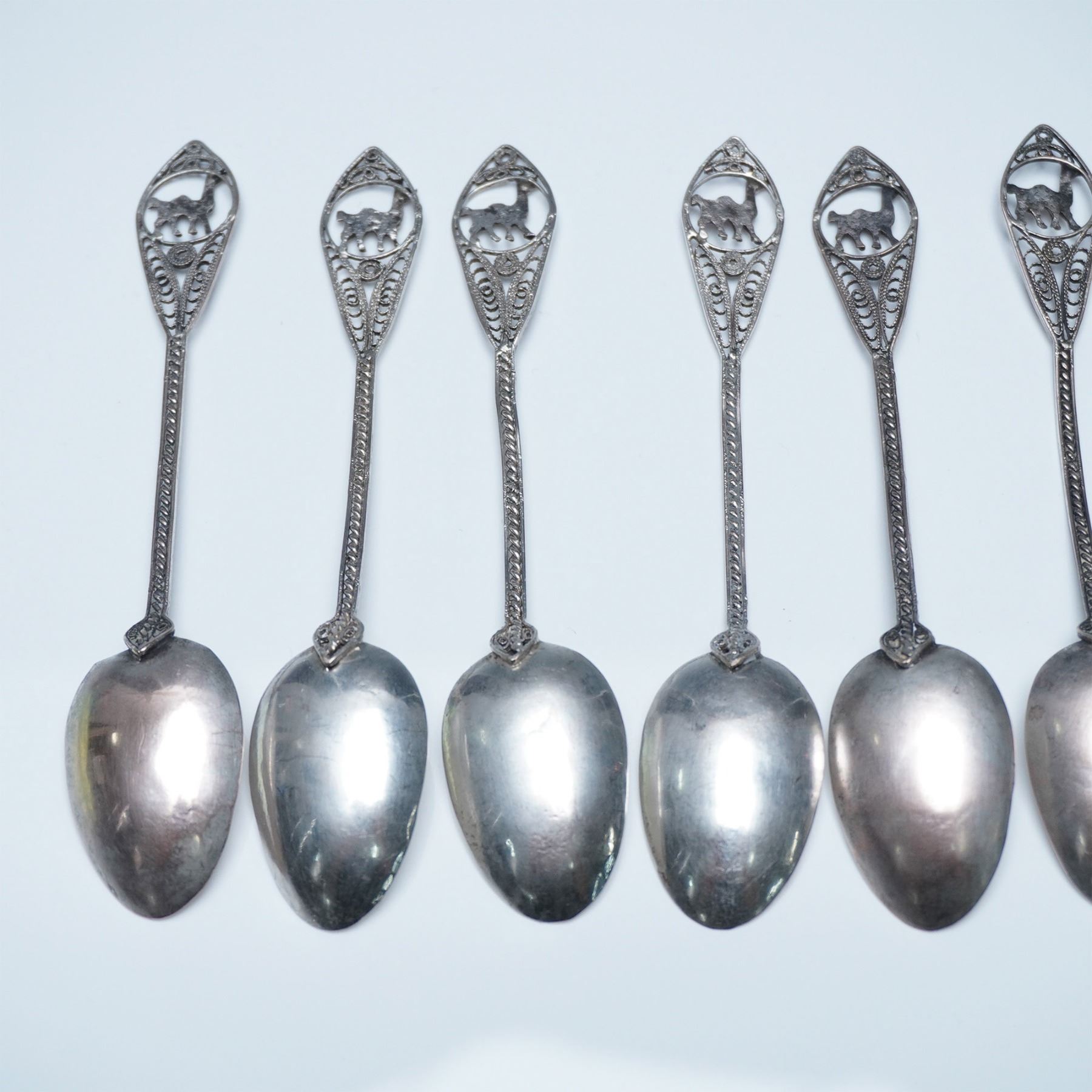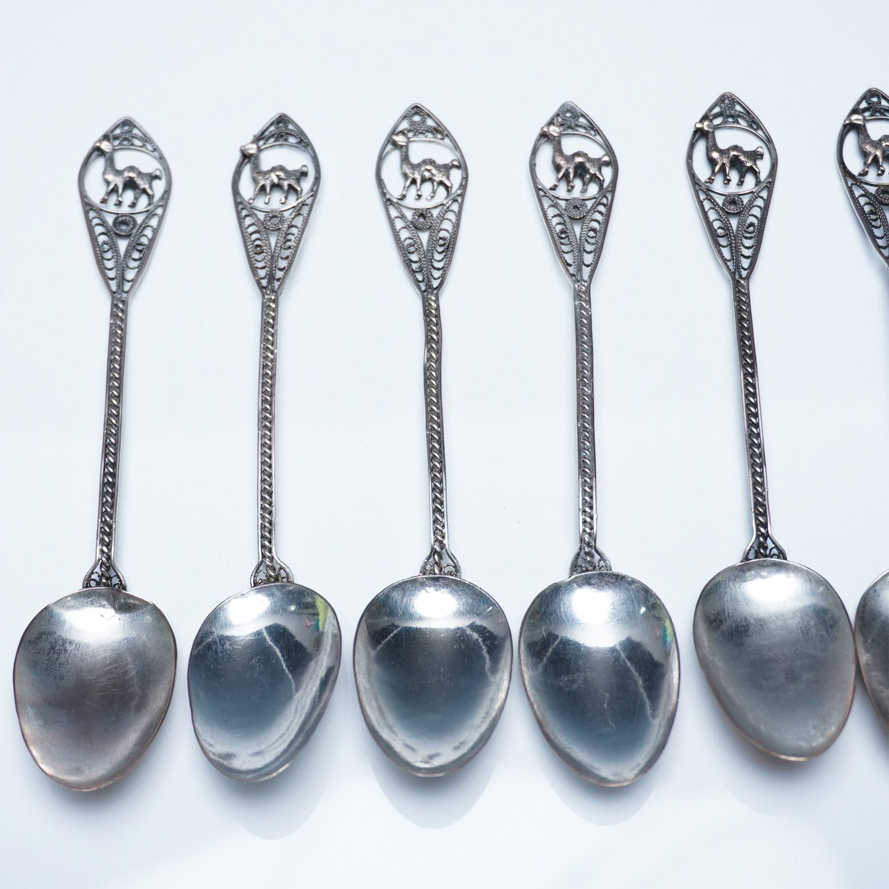 A finely crafted set of 10 filigree metal spoons, each showcasing an intricate openwork handle adorned with a detailed llama motif. The delicate craftsmanship is evident in the braided stem and ornate design, leading to smoothly polished oval bowls. These spoons exhibit a vintage patina, adding to their character and appeal. A striking addition to any collection of decorative metalware or artisan-crafted utensils. Each spoon measures 5"L.