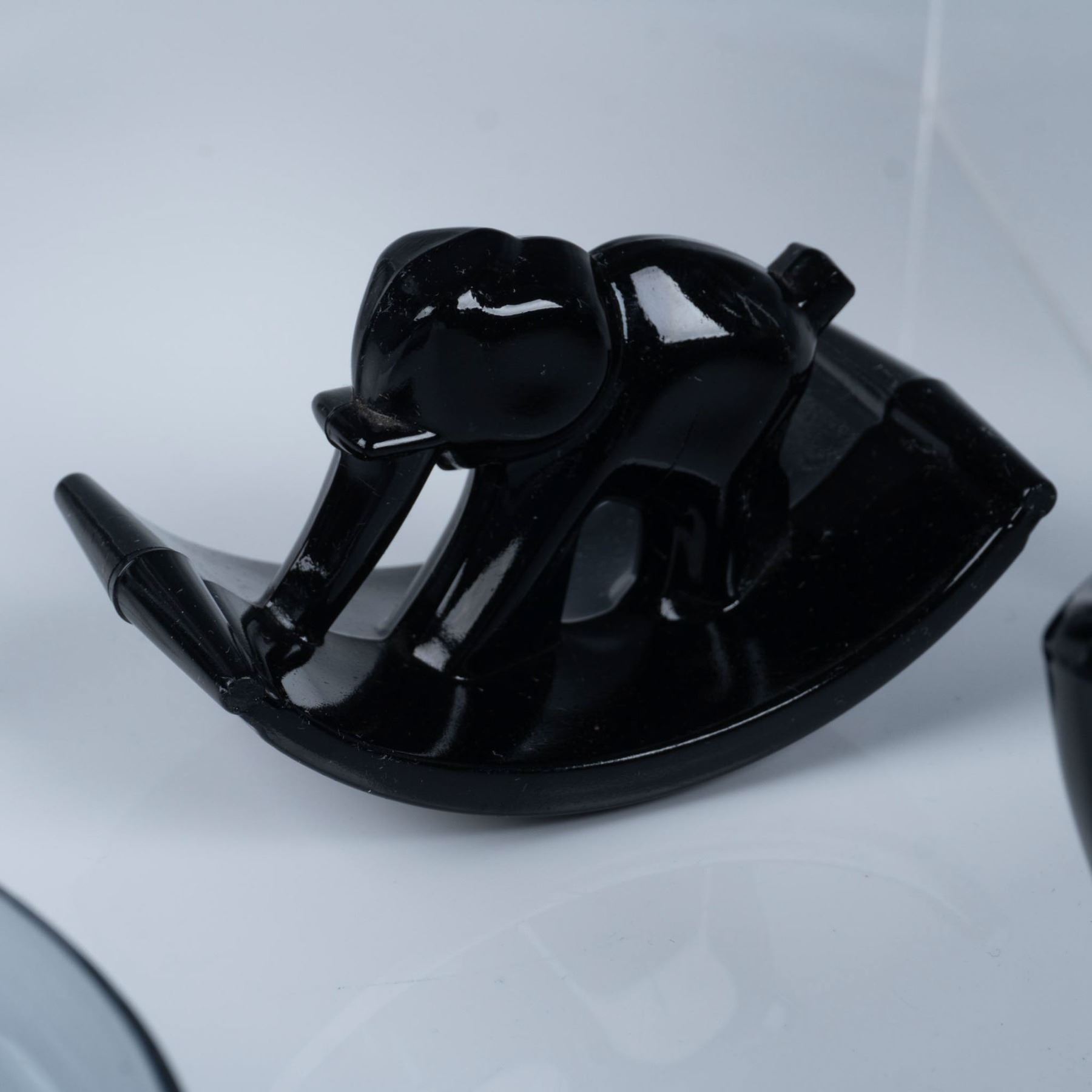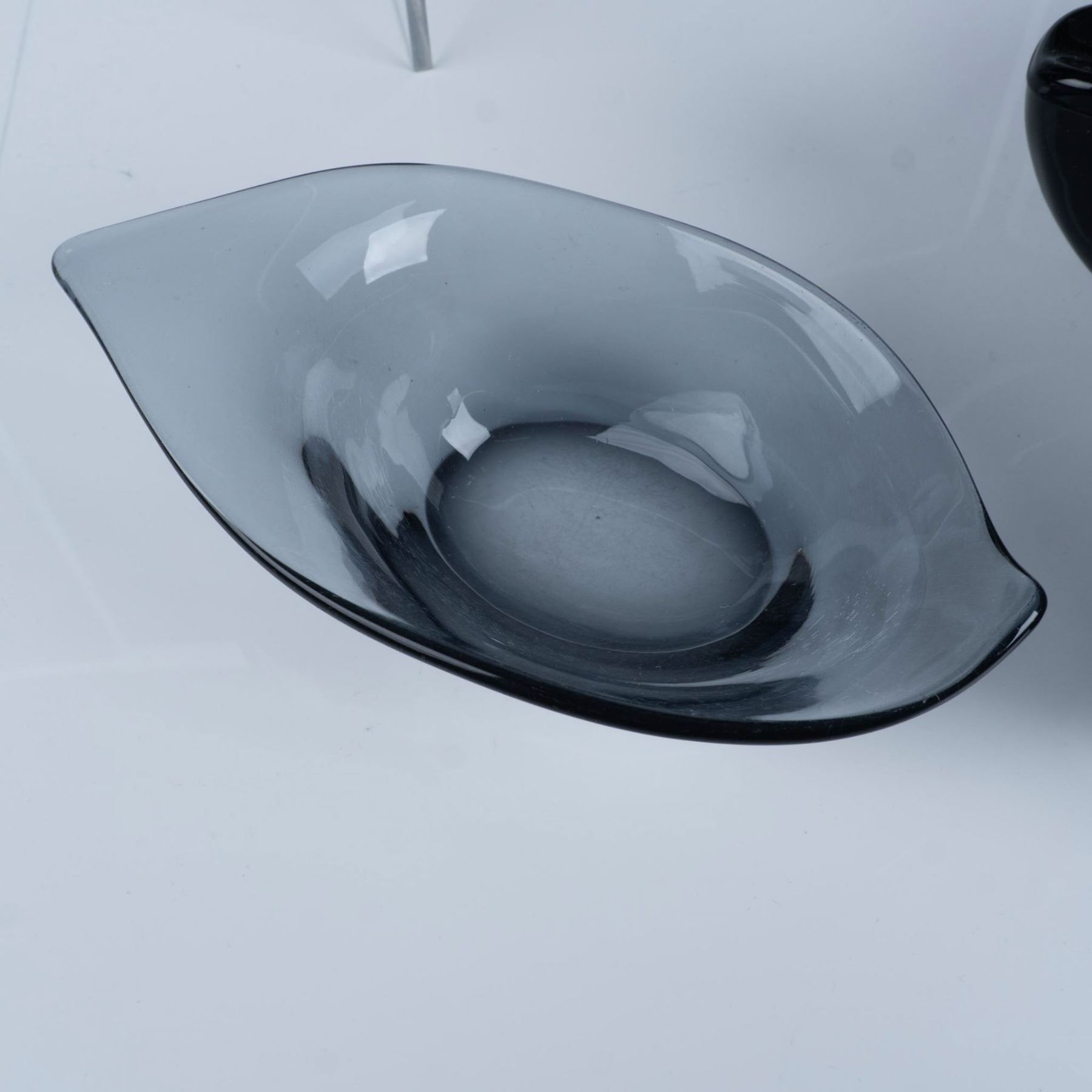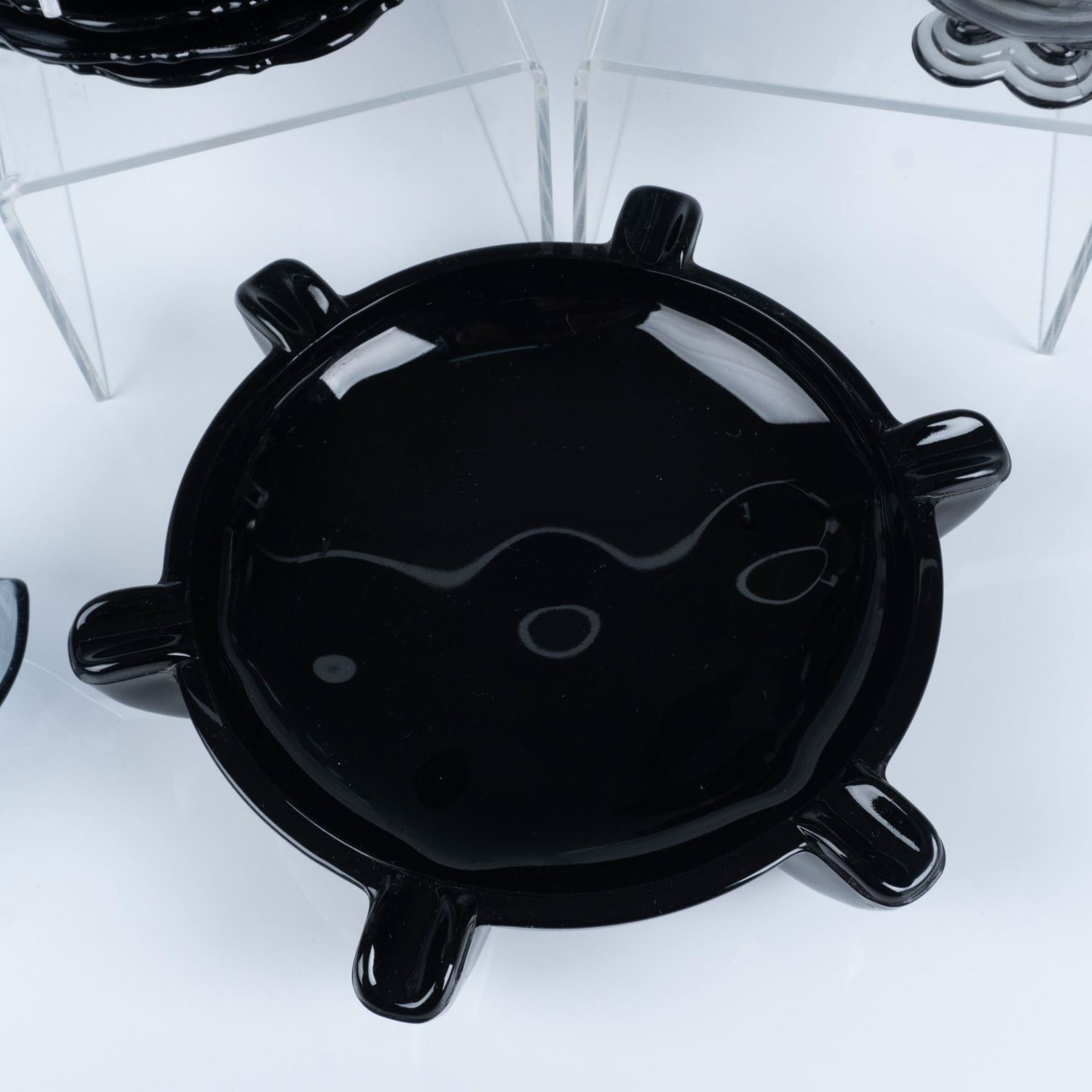 Art deco glassware with black and smokey coloring that consists of a Heisey leaf relish dish, a pair of Heisey smokey flower footed sherbets, a New Martinsville pilot black ashtray, five Smith Glass luncheon plates, and a Houze Glass Company black rocking elephant. Heisey H backstamp. Largest item measures 2.25"H x 10" dia.