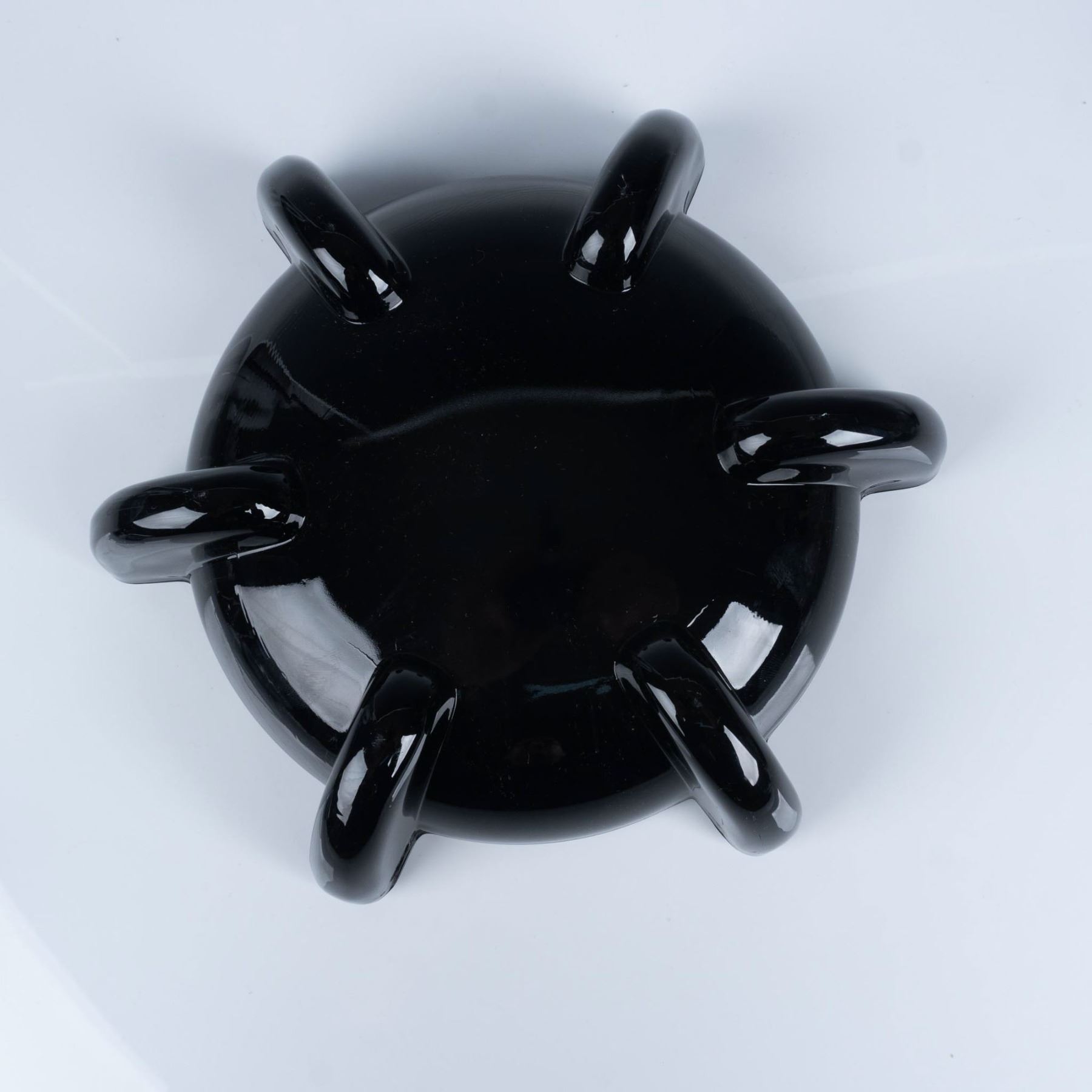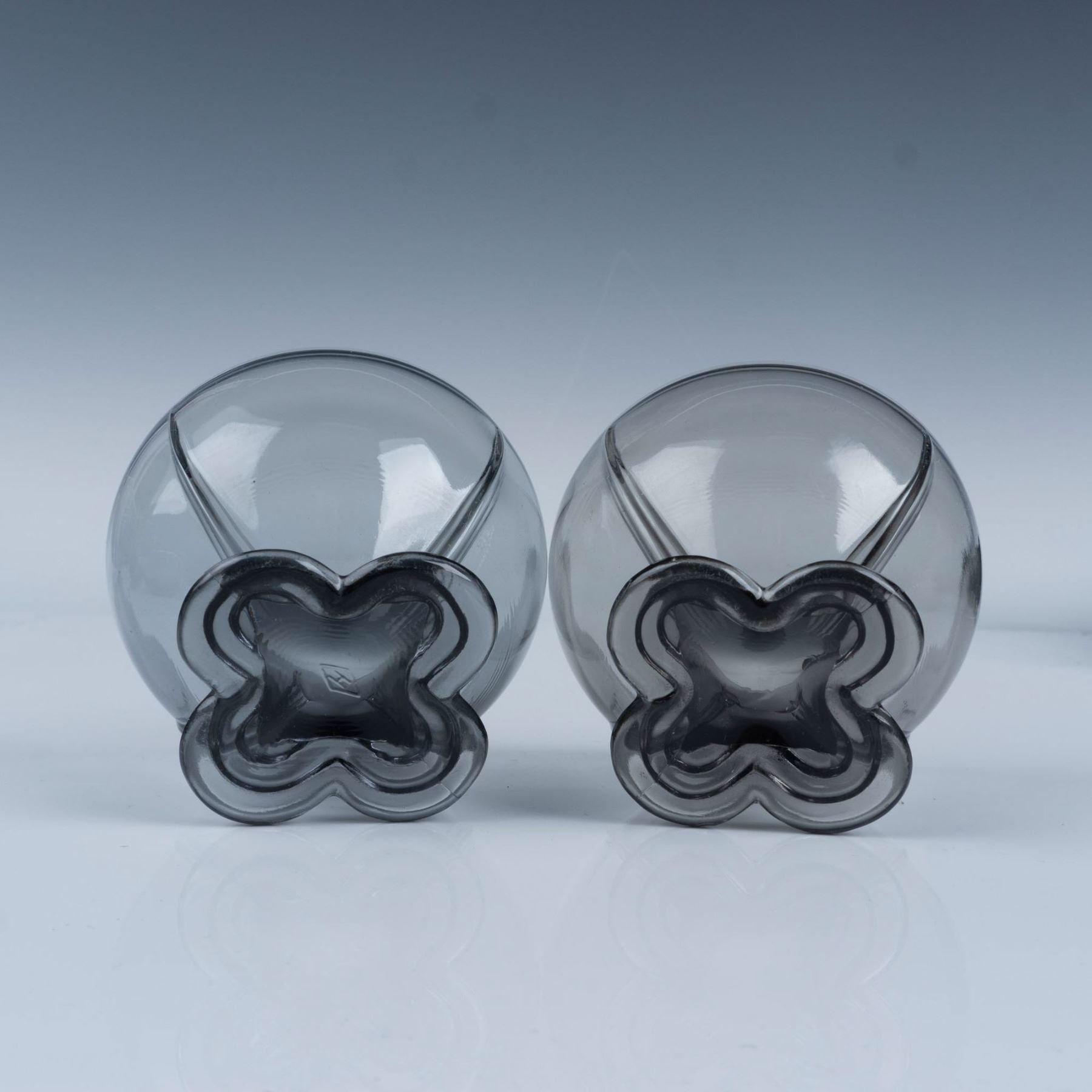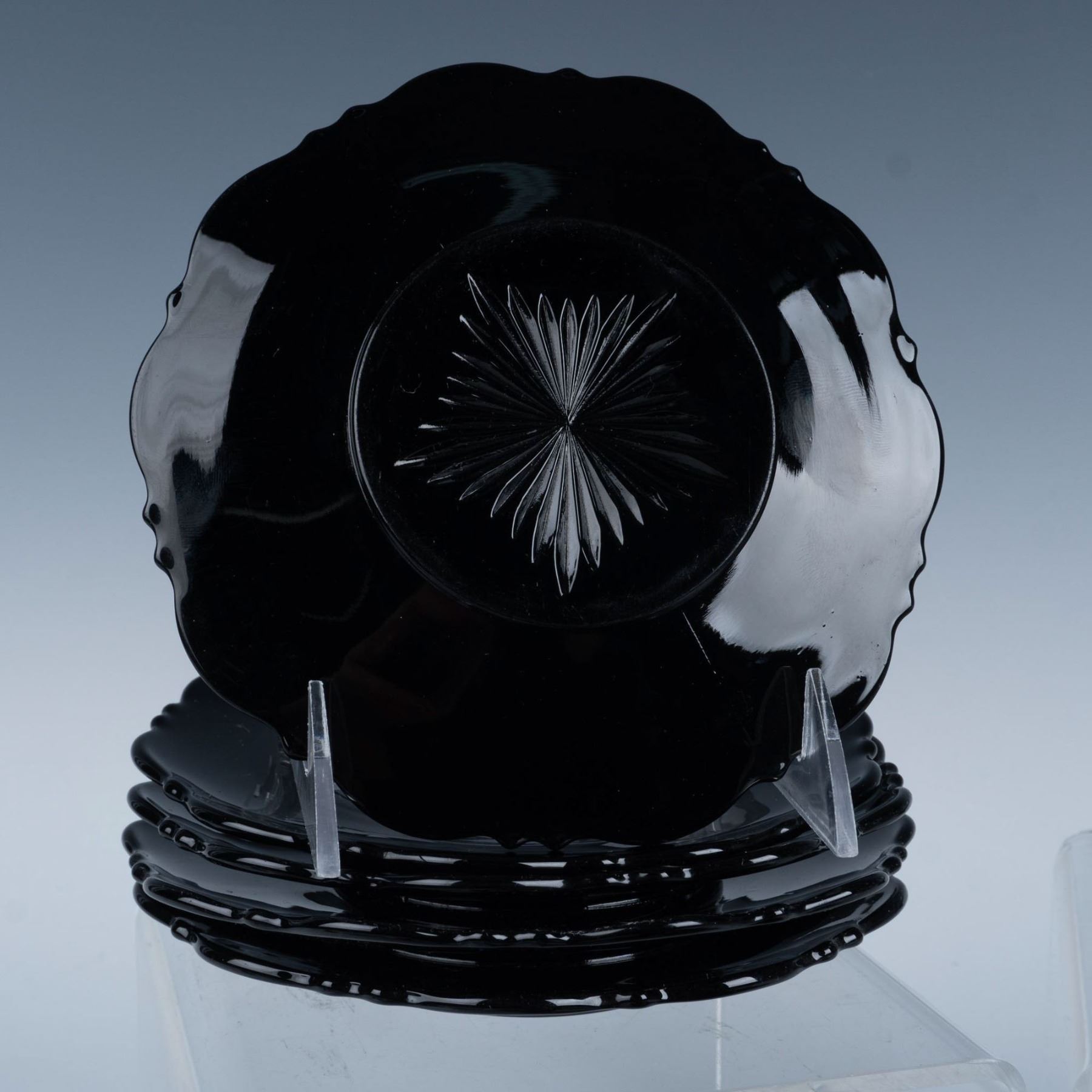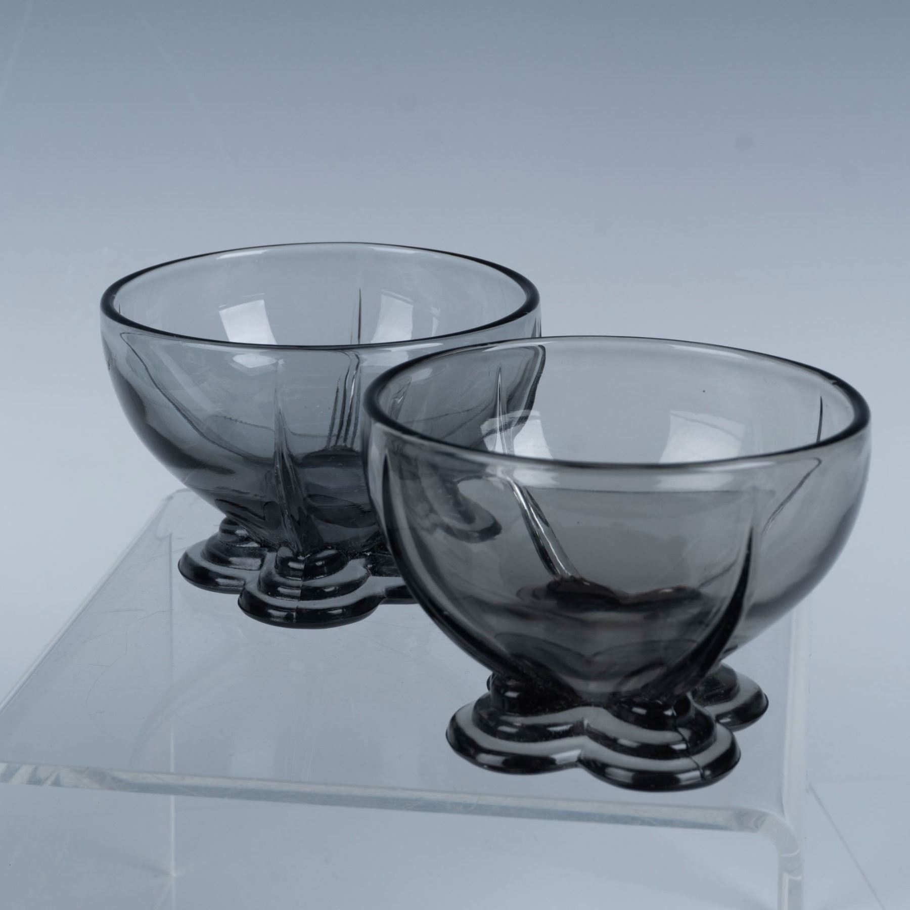 Art deco glassware with black and smokey coloring that consists of a Heisey leaf relish dish, a pair of Heisey smokey flower footed sherbets, a New Martinsville pilot black ashtray, five Smith Glass luncheon plates, and a Houze Glass Company black rocking elephant. Heisey H backstamp. Largest item measures 2.25"H x 10" dia.