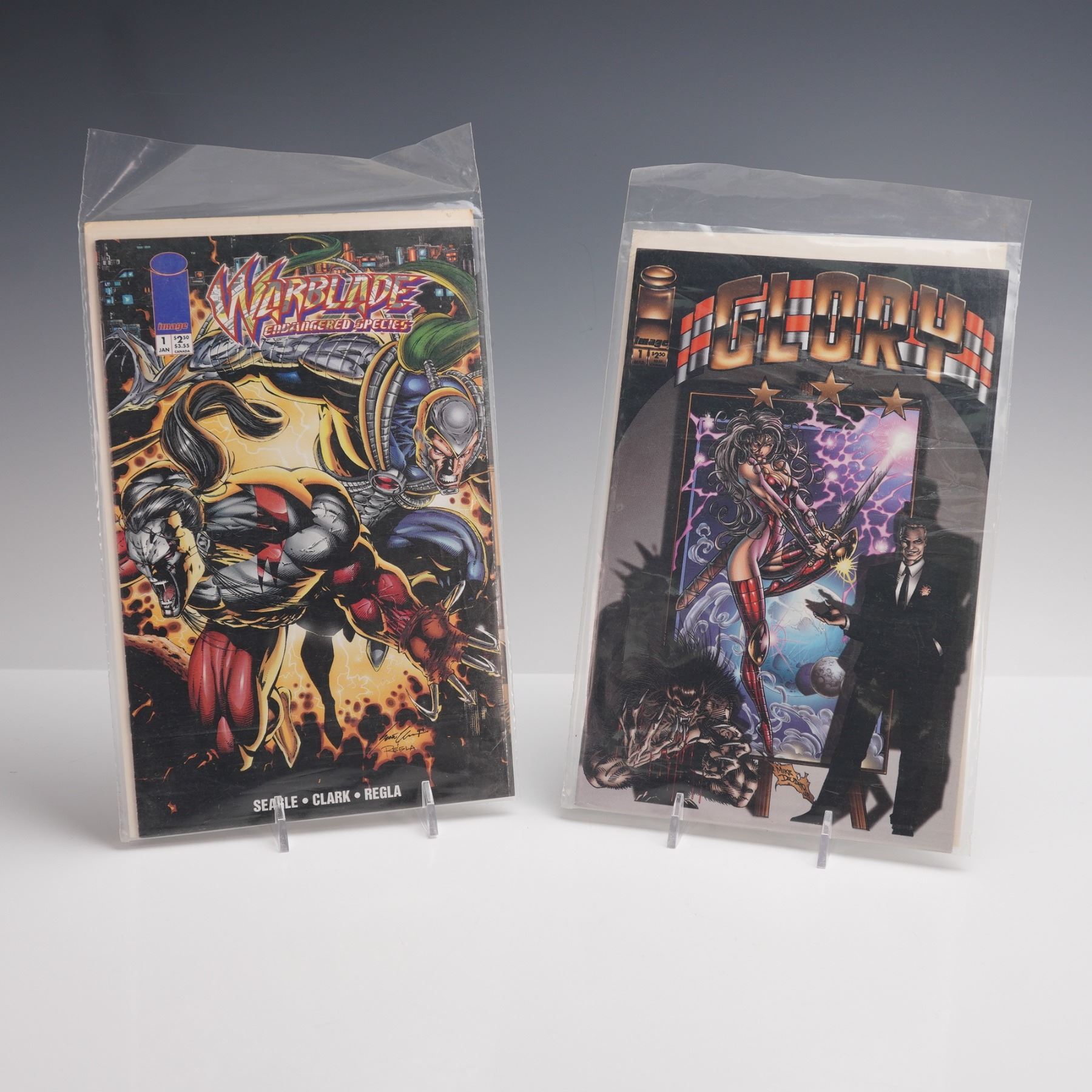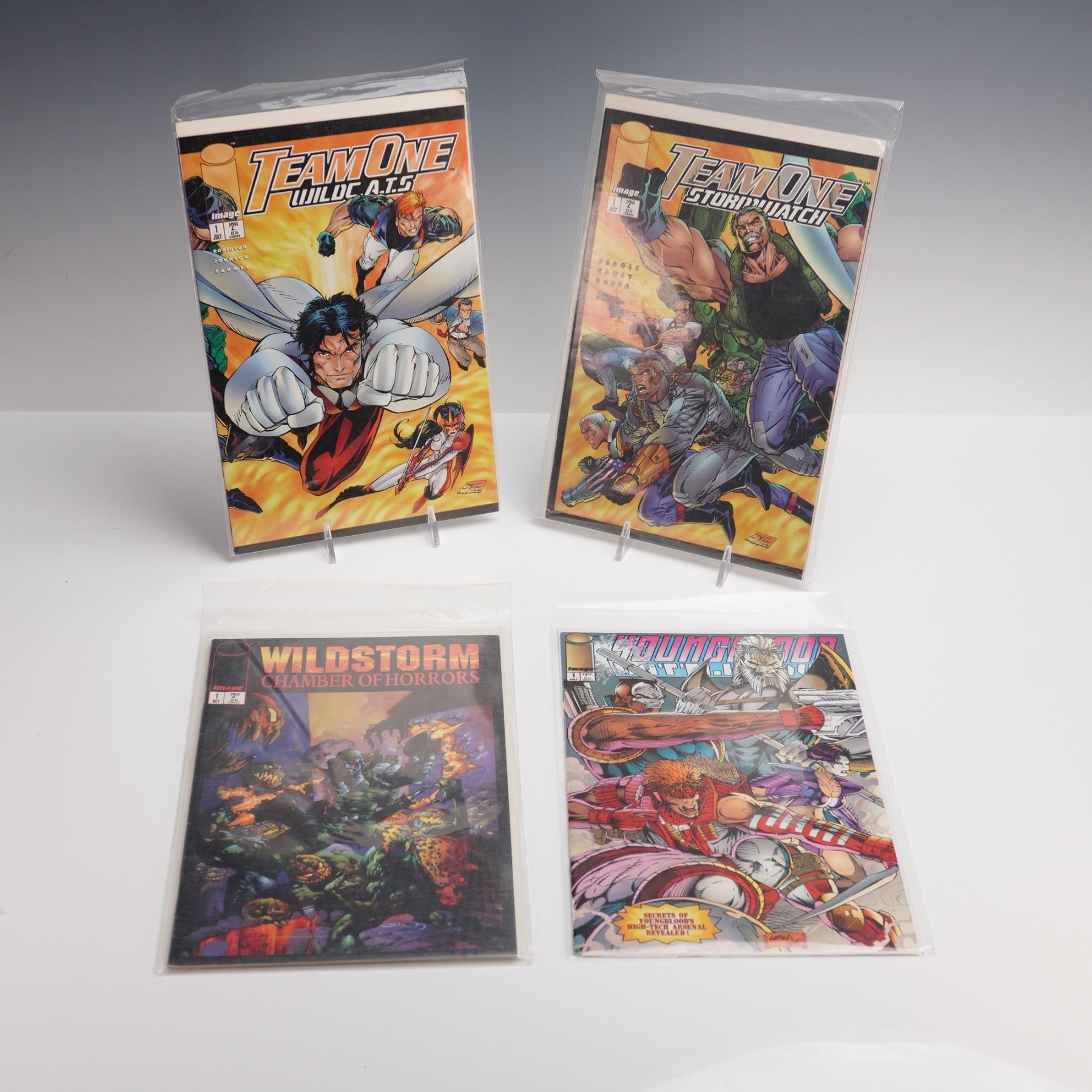 Titles include "Youngblood," "Cyberforce," "Warblade: Endangered Species," "Glory," "Team One: WildC.A.T.s," "Team One: Stormwatch," and "Wildstorm: Chamber of Horrors," featuring superhero teams and characters from the early 1990s Image Comics era. Also included is a "Metal" series print featuring Marvel's Mr. Sinister.