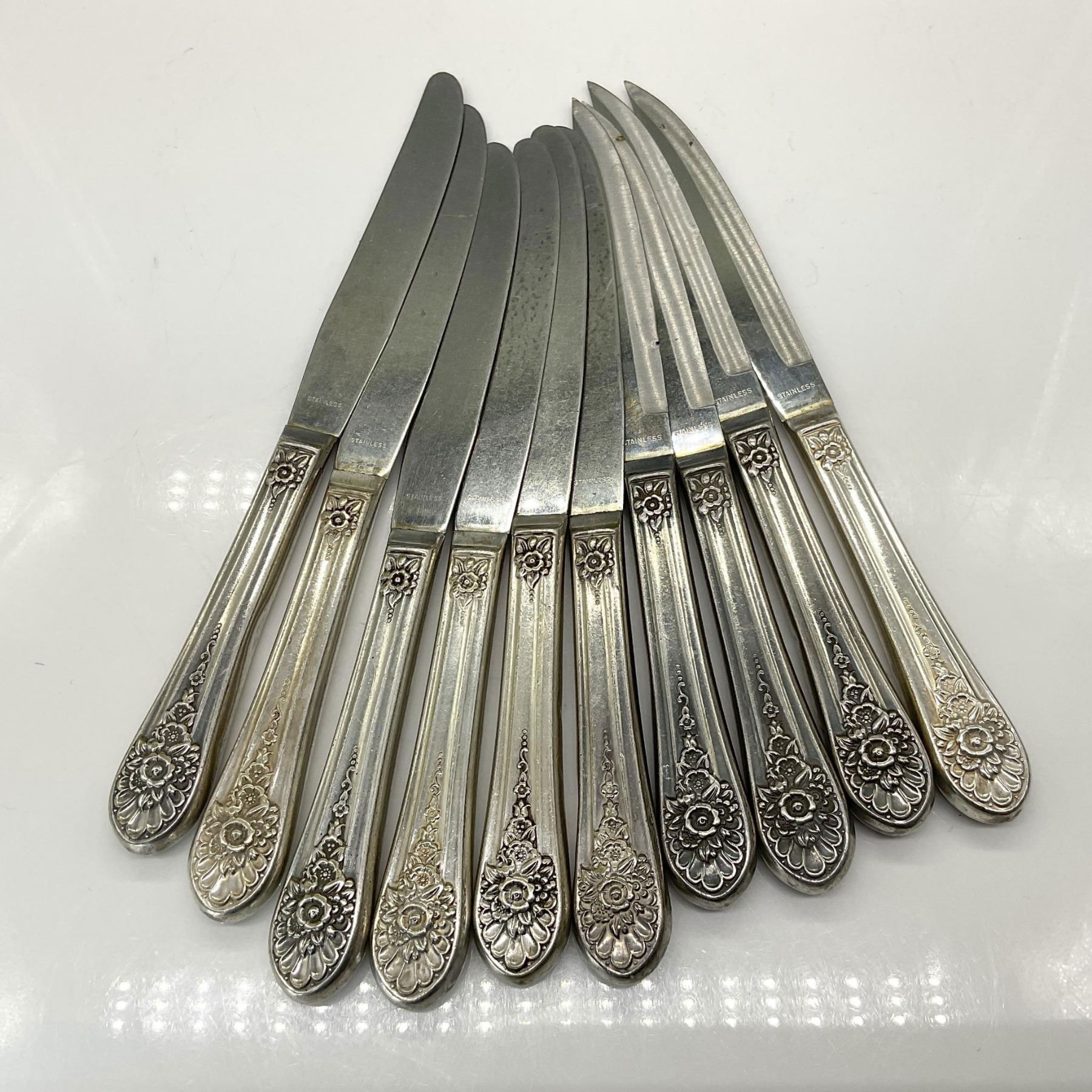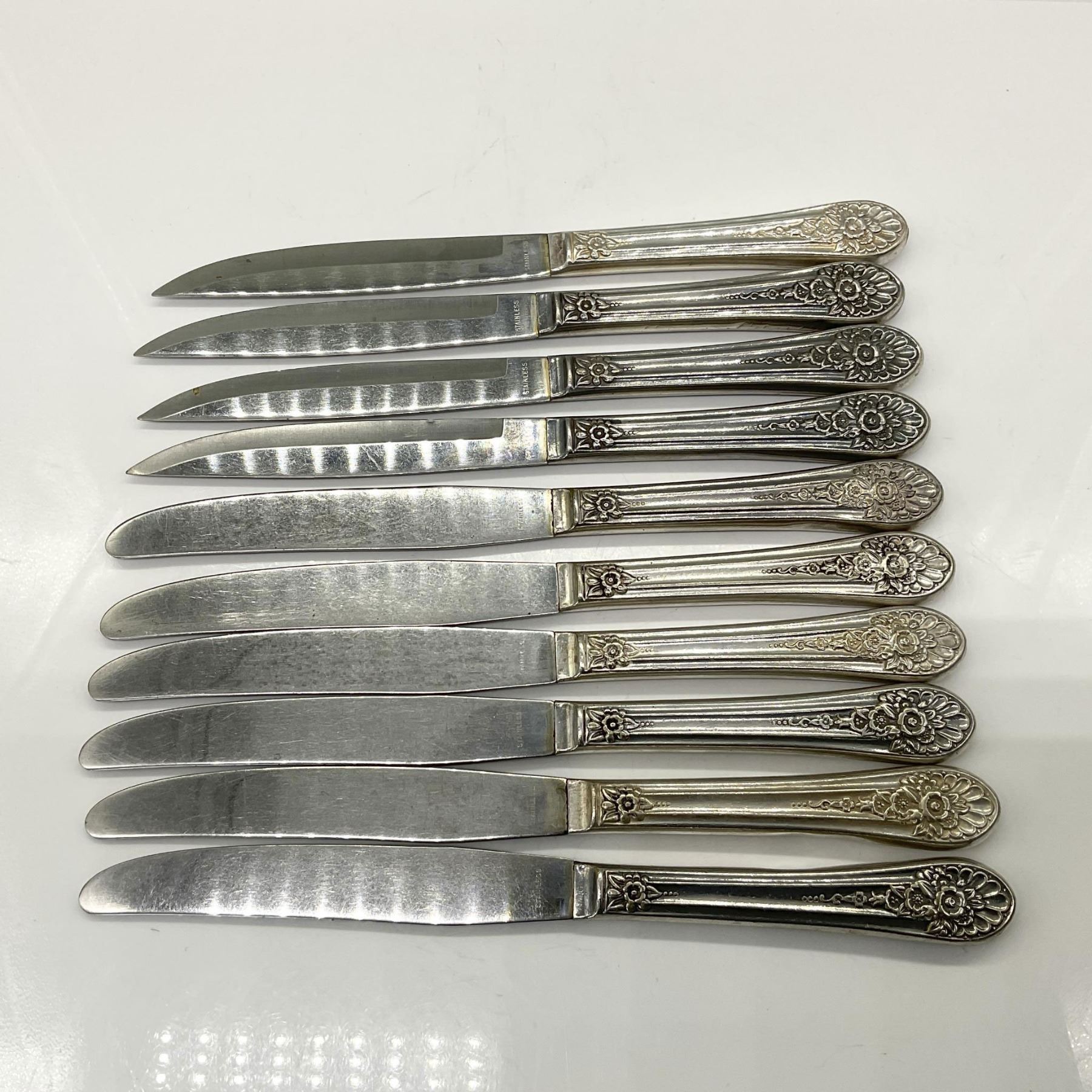 This silverplate grouping includes four sharp steak knives and six dinner knives, all in the same floral Jubilee pattern. Each knife is marked Stainless on the blade. The steak knives measure 9"L, the dinner knives measure 9.25"L. Issued: 20th century