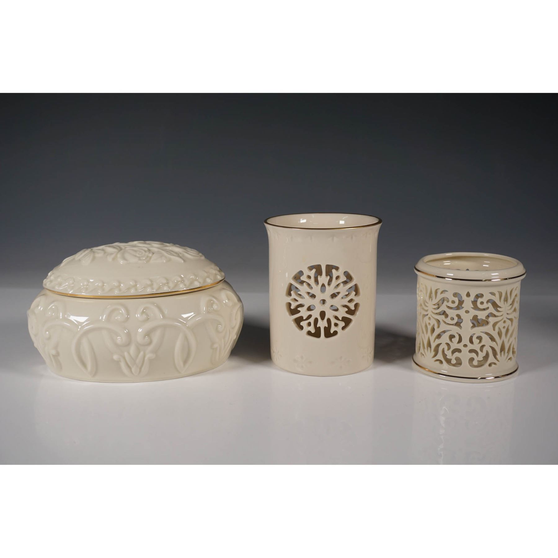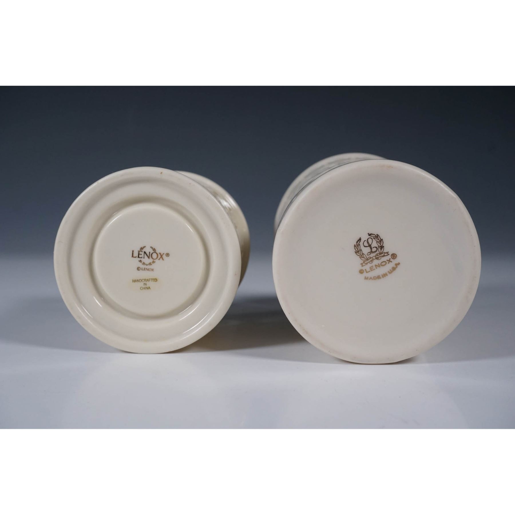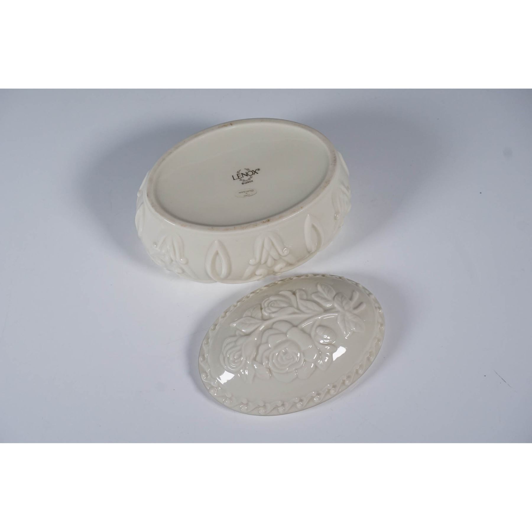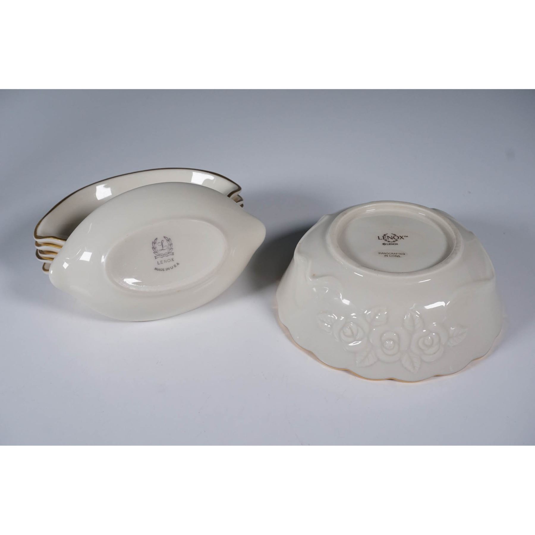 A beautifully curated collection of Lenox porcelain and crystal pieces featuring intricate embossed floral patterns, pierced designs, and elegant gold trim. This set includes a Lenox Firelight Collection crystal vase with an etched feathered motif and original label, along with one covered bowl, six nut dishes, one open bowl, and two pierced porcelain candleholders, all showcasing signature craftsmanship. A stunning representation of timeless elegance, this collection is perfect for collectors or those looking to add sophisticated decorative accents to their home.