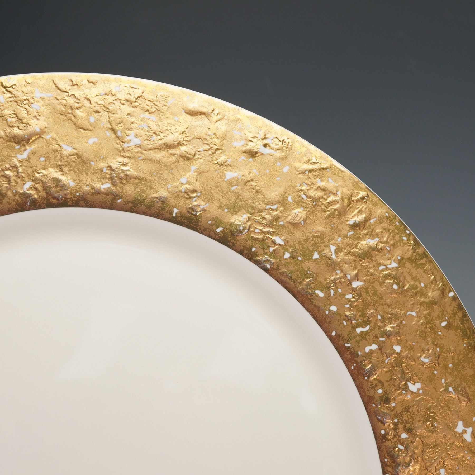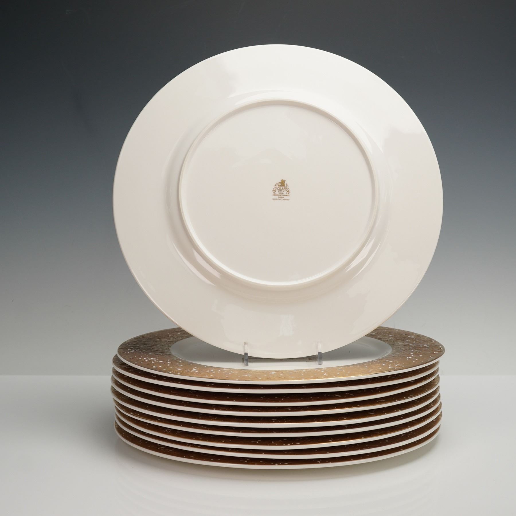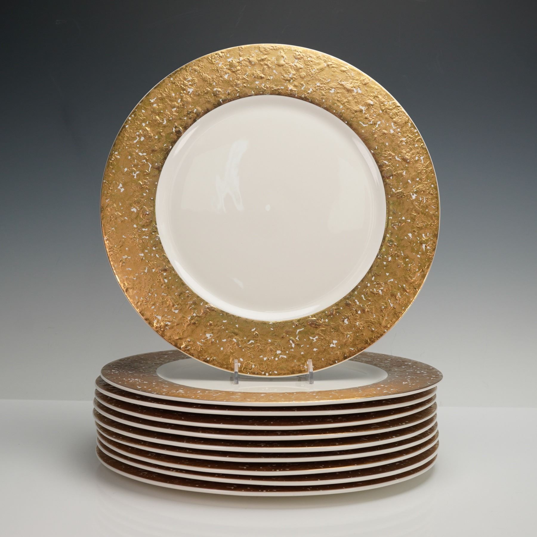 A set of ten round charger plates with wide gilded borders featuring an irregular textured pattern in gold and white. Each piece has a smooth white center that contrasts with the metallic rim. Pickard backstamp.