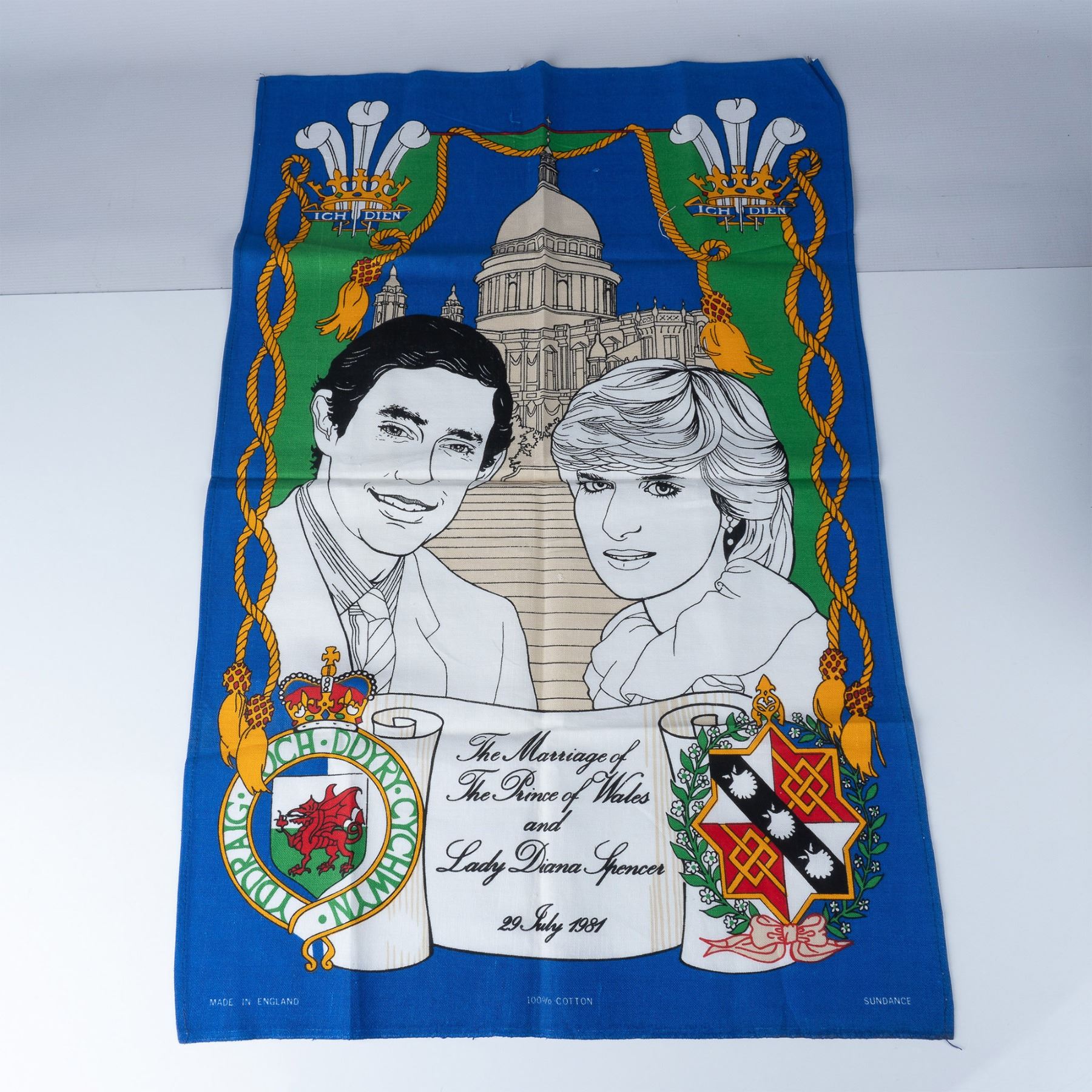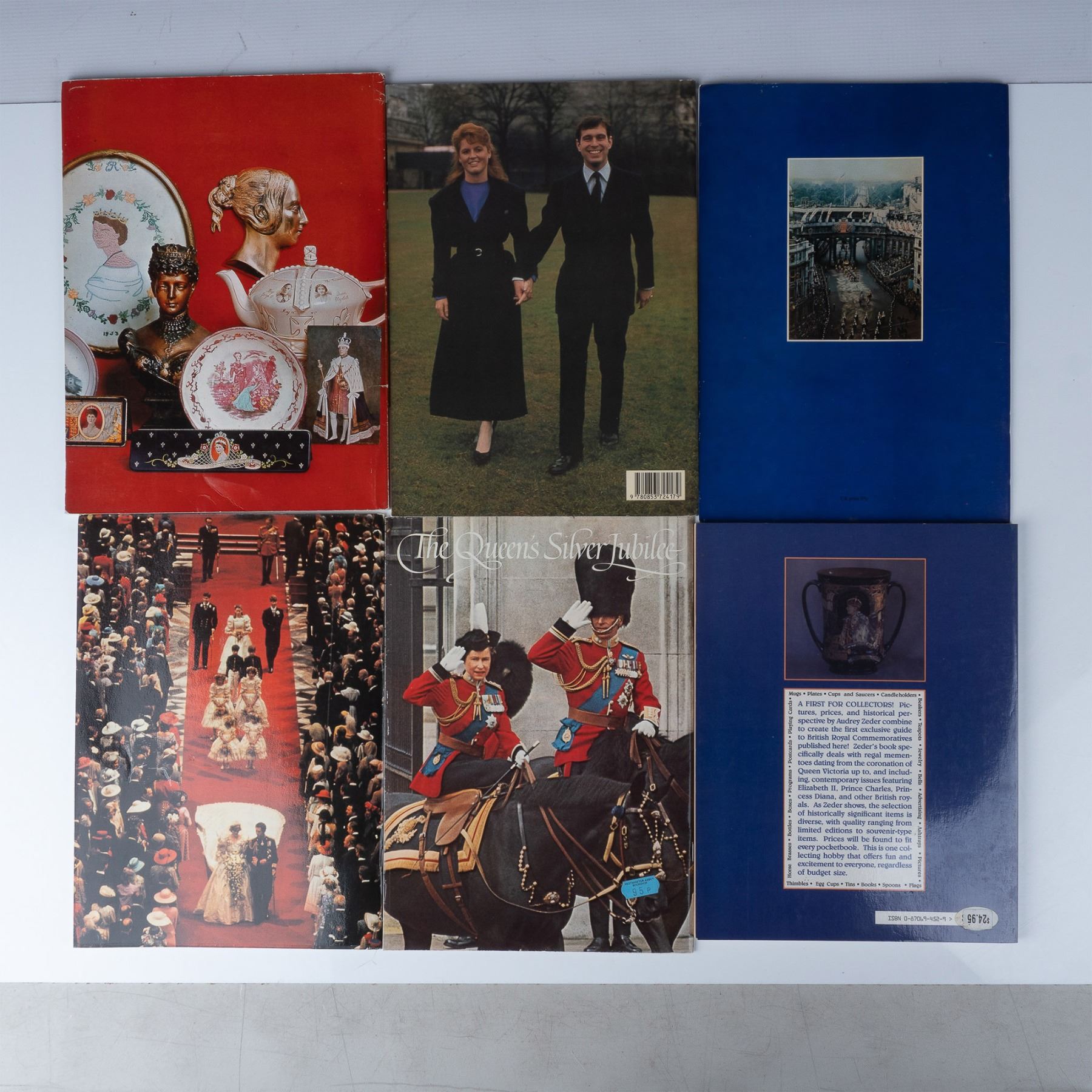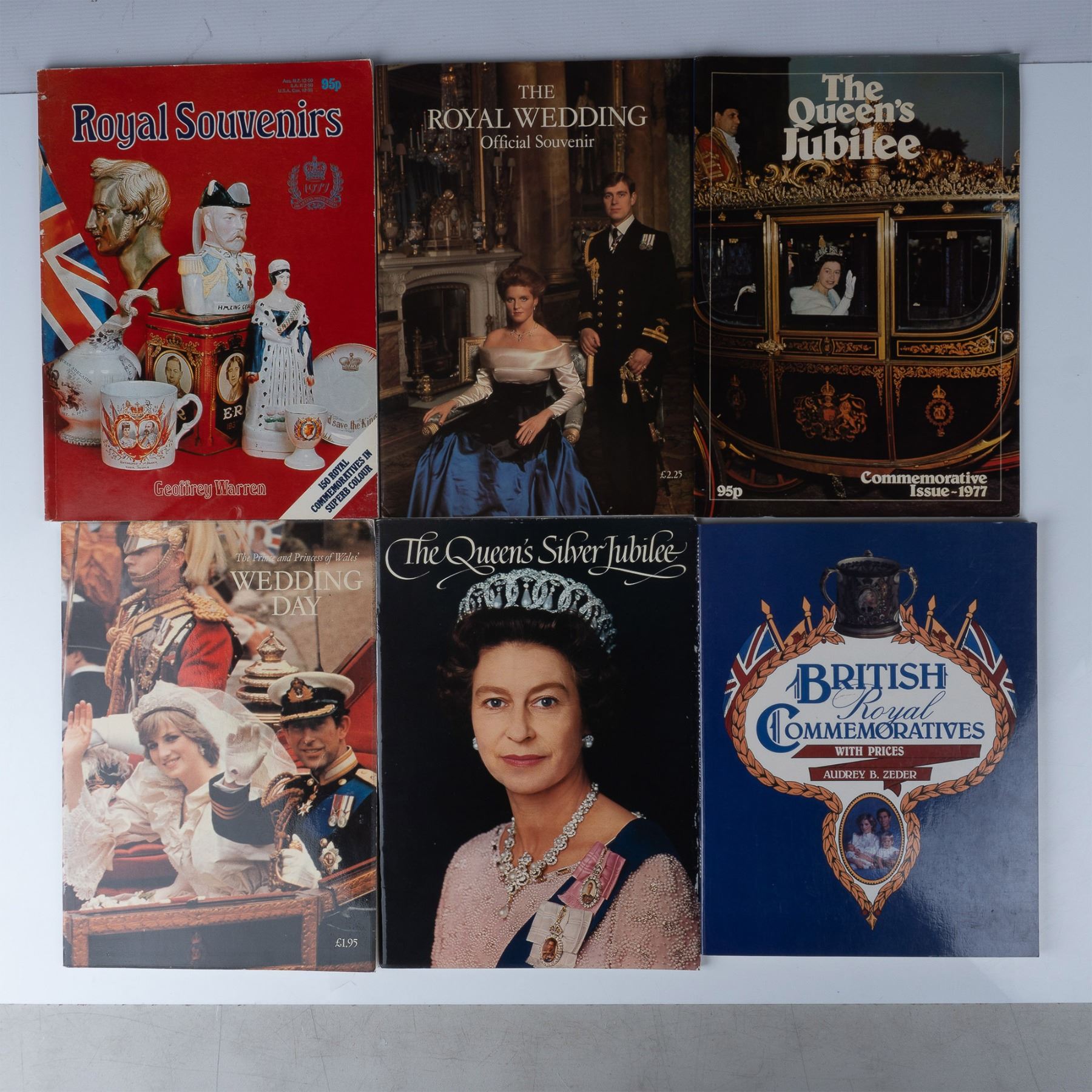 Titles including: The Prince and Princess of Wales' Wedding Day (1981) by Audrey B. Zeder, The Queen's Jubilee (1977), Royal Souvenirs (1977) by Geoffrey Warren and many more. This collection features 3 commemorative cotton textiles, showcasing Prince Charles and Lady Diana, a London scene and a festive Crown with Trooping the Colour motif. Dimension of largest book: 8.75"L x 11.75"H. Dimension of largest textile: 20"L x 30"H.
