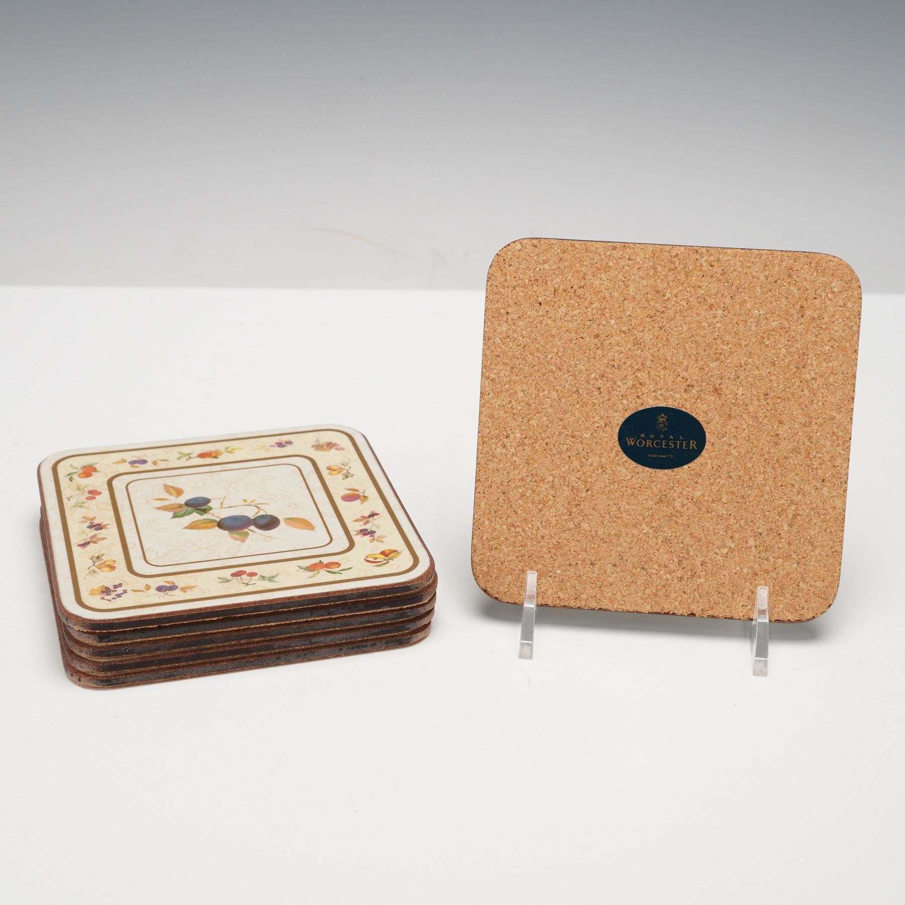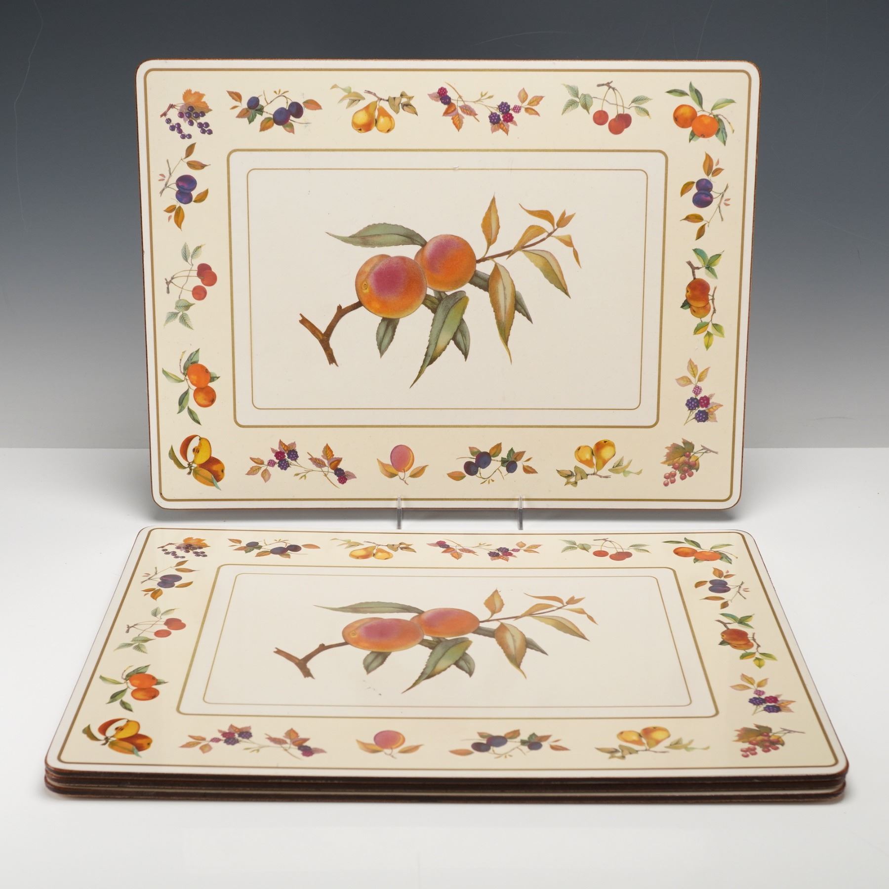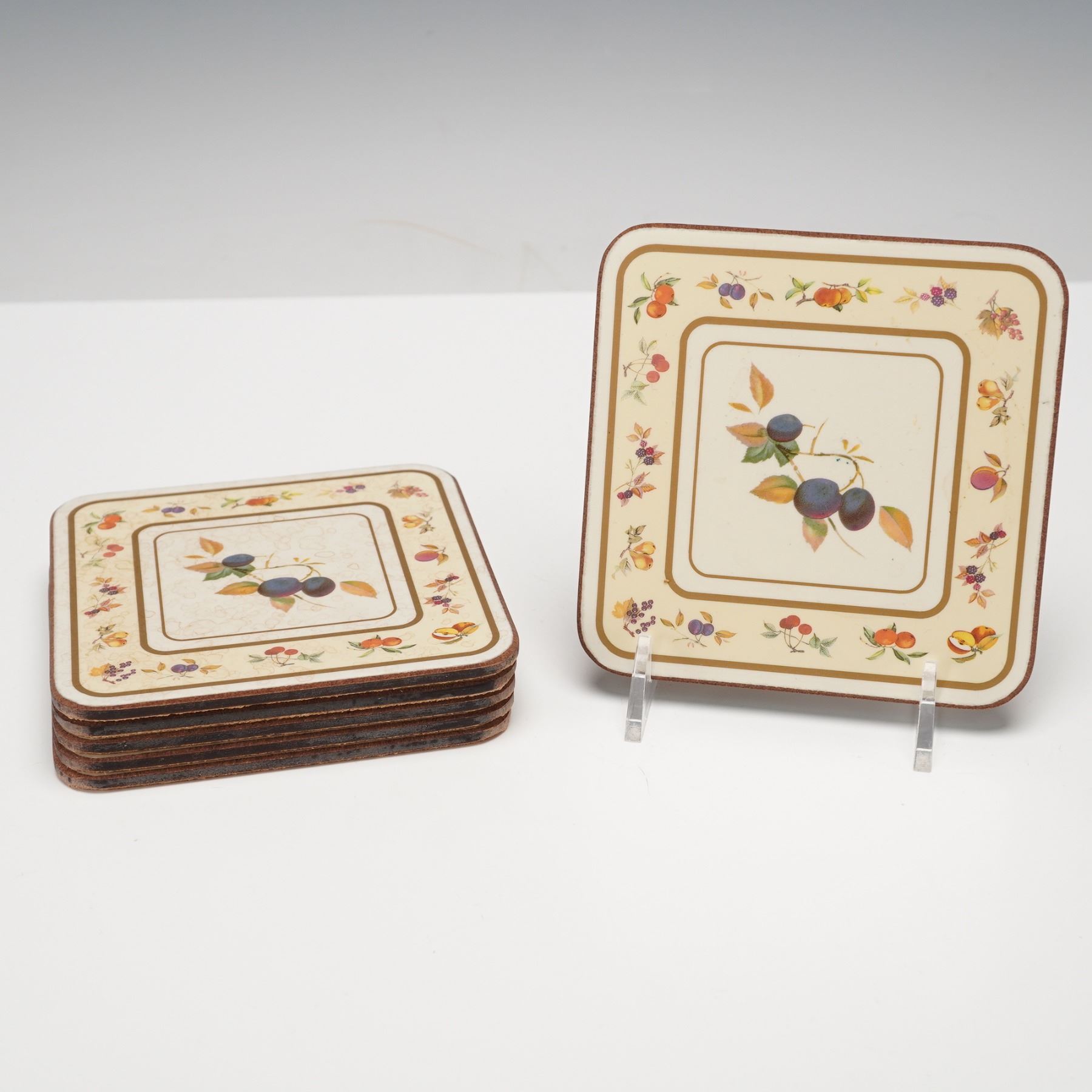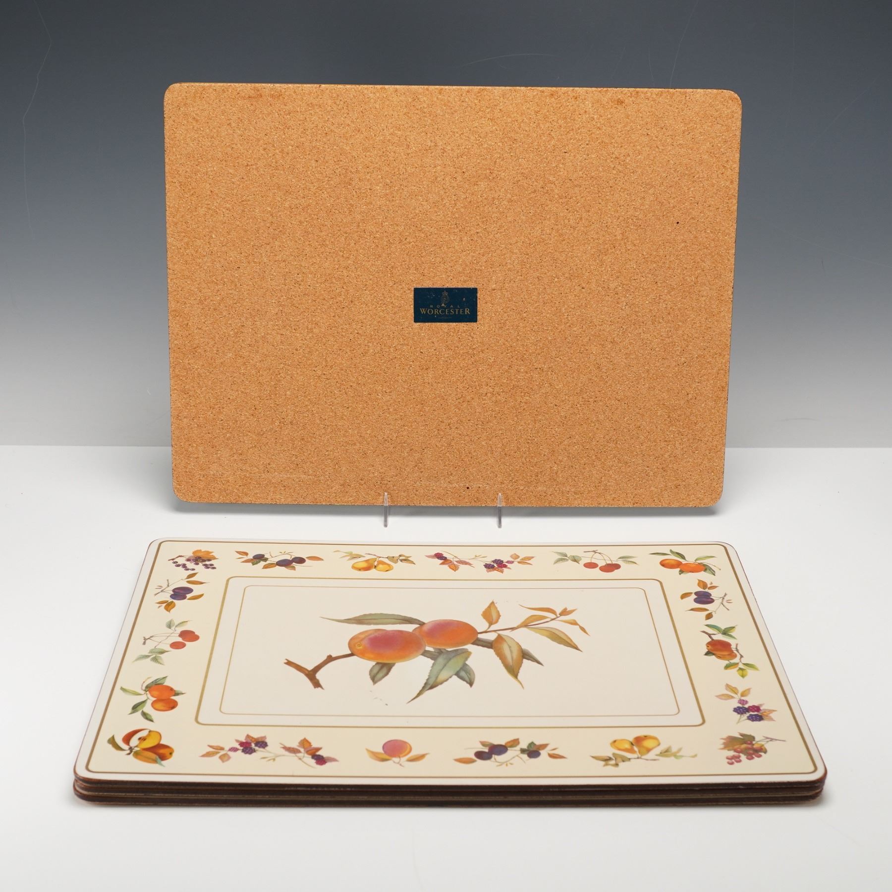 This 10-piece Worcester set includes four placemats and six coasters, all featuring the Evesham fruit and floral pattern. The placemats highlight a central peach design surrounded by colorful fruits and leaves, while the coasters showcase a similar design with plums. The set comes with a blue Worcester box for the coasters.