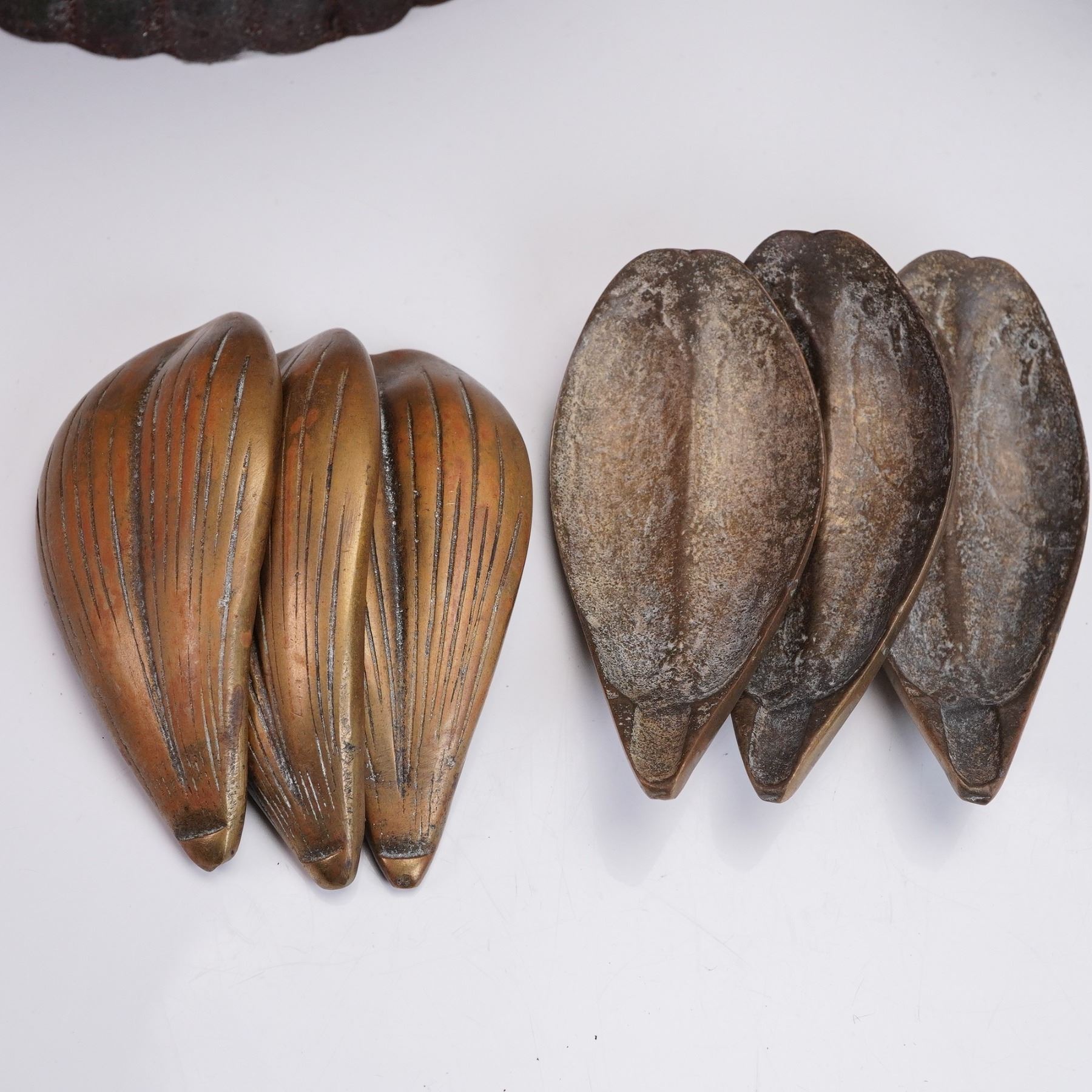A 10-piece collection of vintage Asian-style mixed metal decor, including a cast iron hanging garden lantern with a domed top and open vertical frame, showing heavy surface oxidation and patina. The lot also features two shallow engraved dishes, one with gold-tone floral decoration, and a small etched brass bowl. Completing the group are six curved petal-form brass dishes with raised ridged detailing.