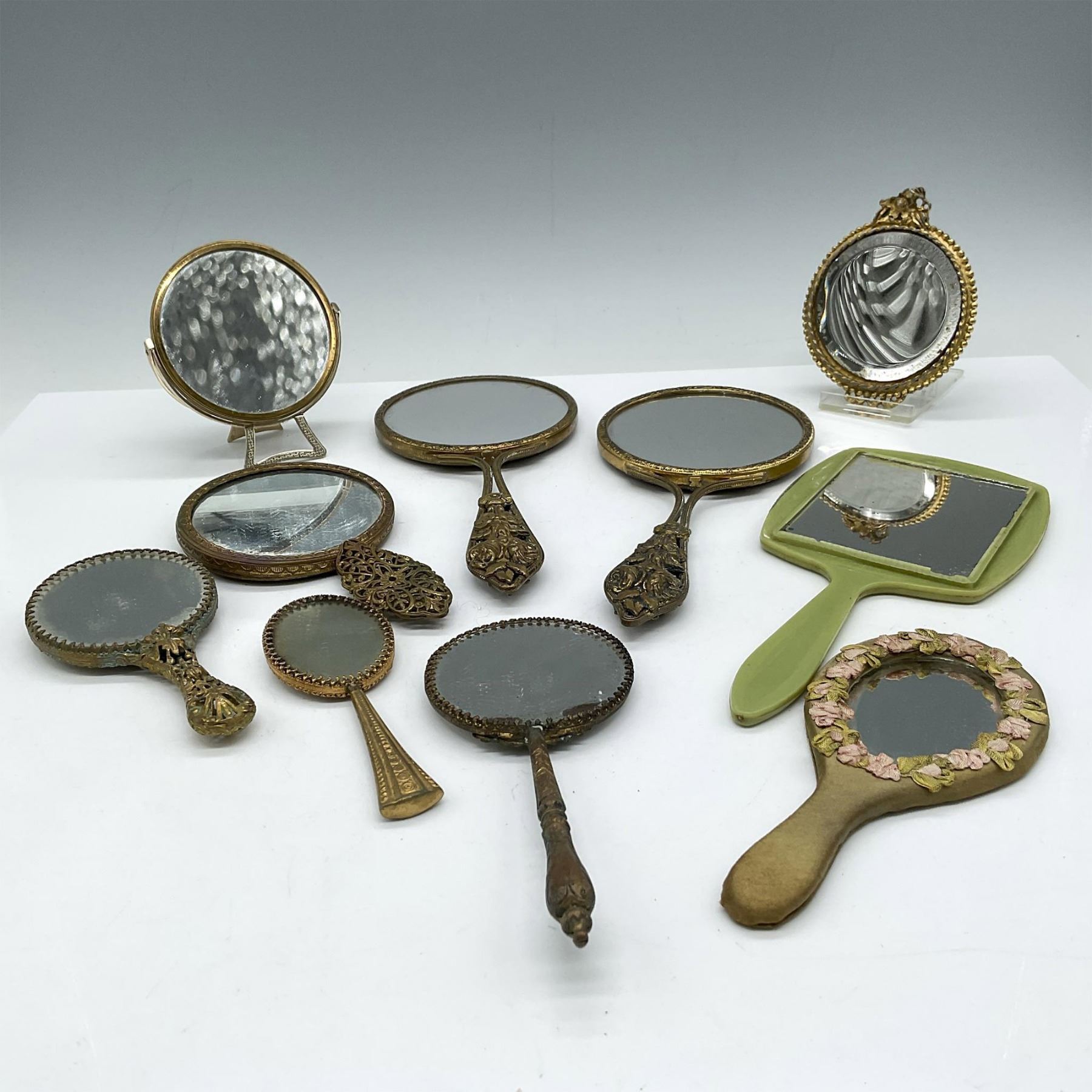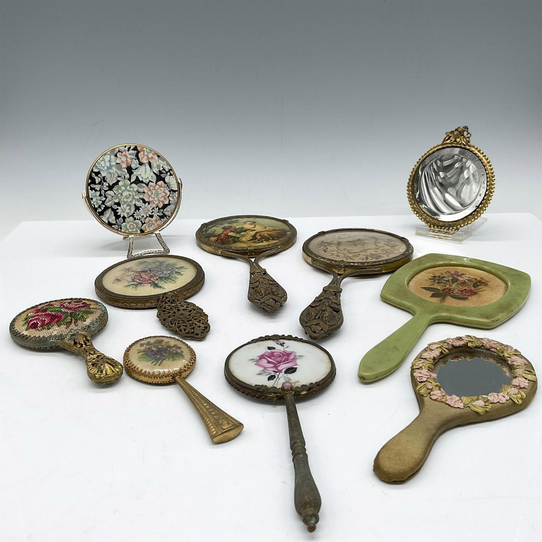 Assortment of decorative purse accessories that include mirrors made with porcelain, needlepoint and enamel over bronze metal work. Largest piece - 7.25"L x 3.25"W.