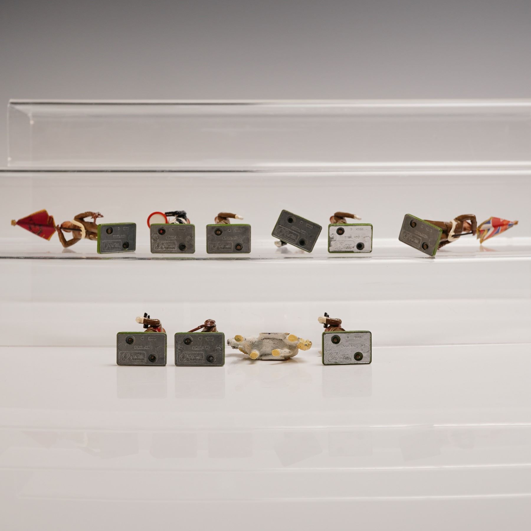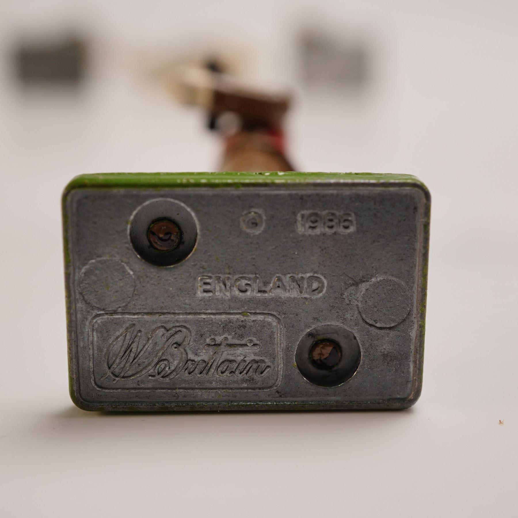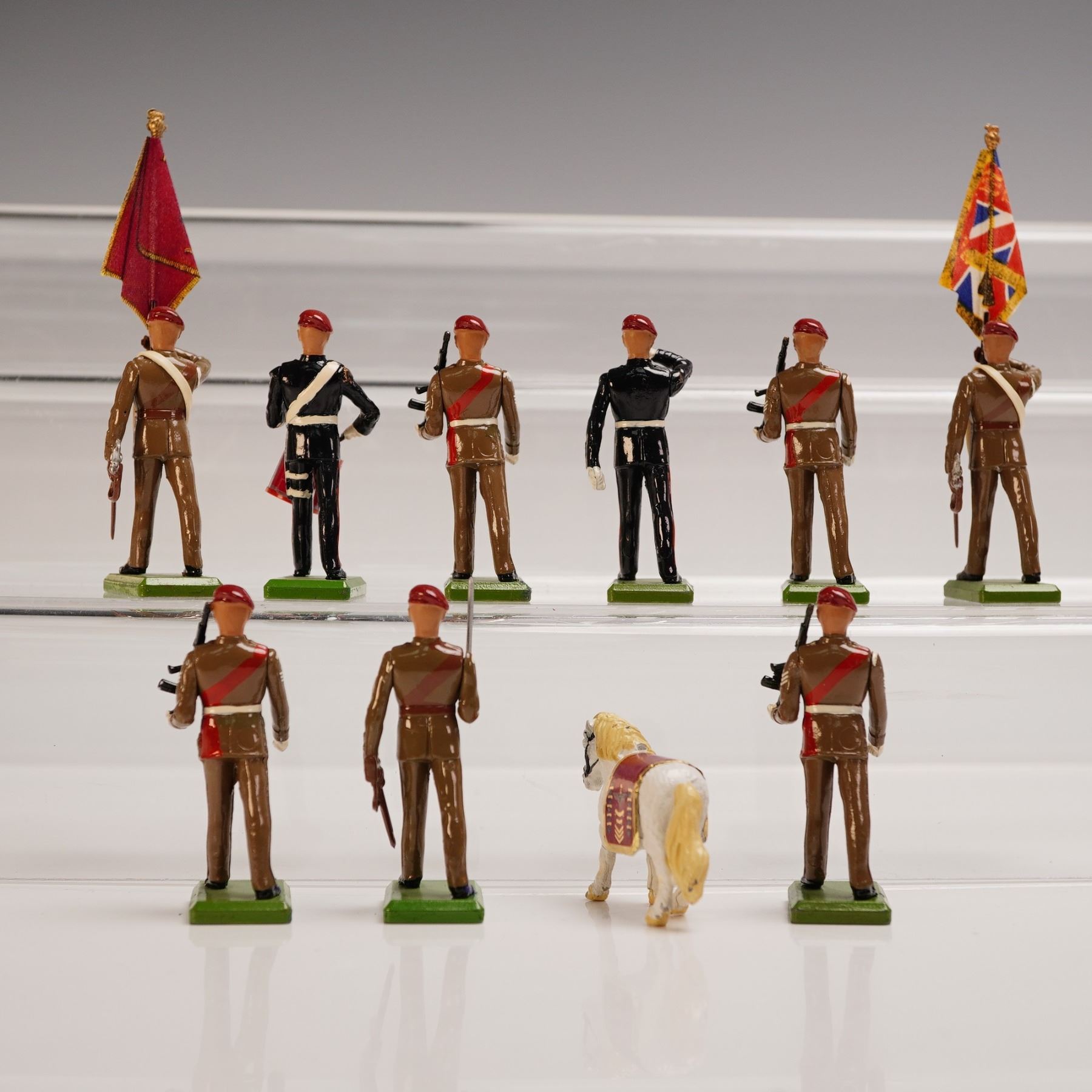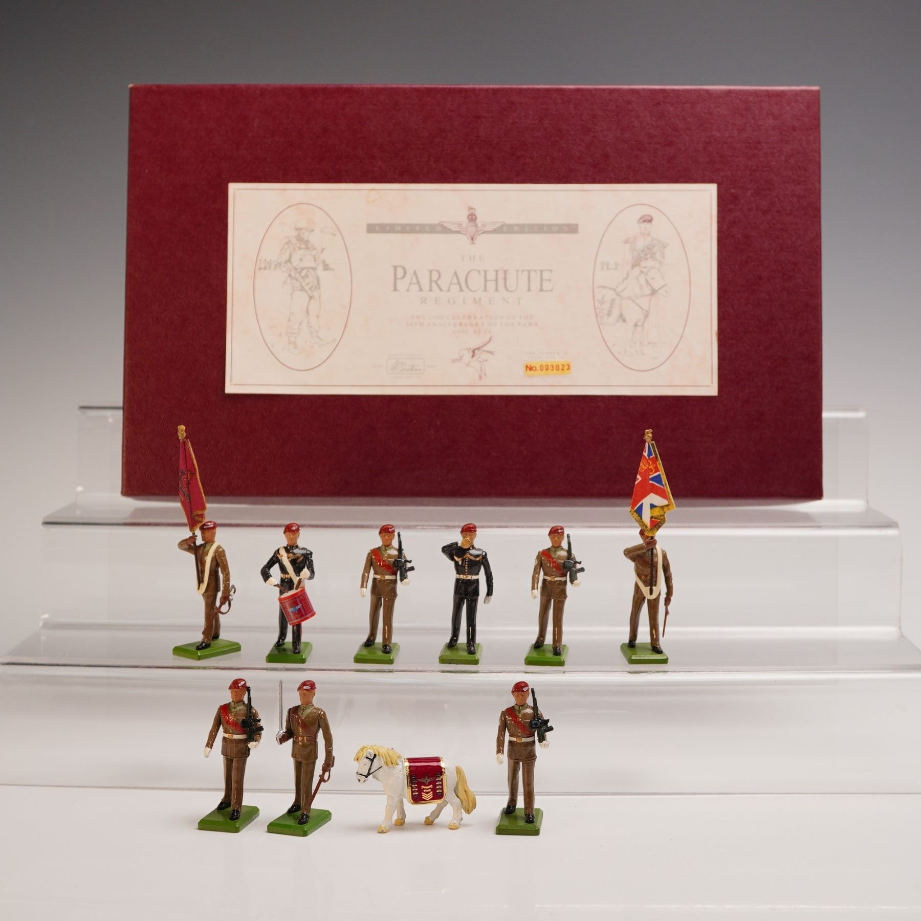 A boxed 10-piece set of hand-painted British Parachute Regiment military figurines by W. Britain, issued in 1990 to commemorate the 50th anniversary of the Paras. This limited edition set features two flag bearers, a drummer, officers in ceremonial black dress, riflemen in brown uniforms, and a white ceremonial horse with red and gold regimental covering. Each figure is finished with detailed painting, including distinctive maroon berets and era-specific attire. Includes the original maroon presentation box. Numbered 3023 of a 6000-set limited run.