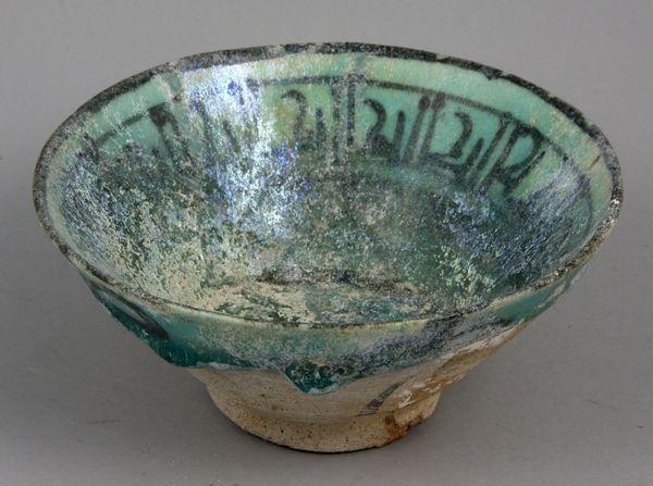10th-13th Century Persian footed grey terracotta bowl having turquoise glaze with mother-of-pearl iridescence and incised foliate forms, 2 1/4" h. x 5 1/4" diam. Property of the late Robert O. Peterson, San Diego, CA.