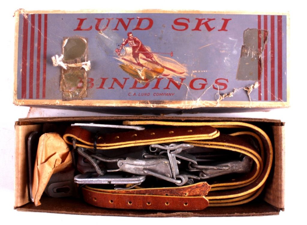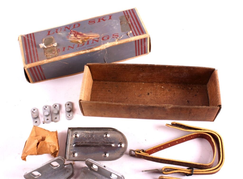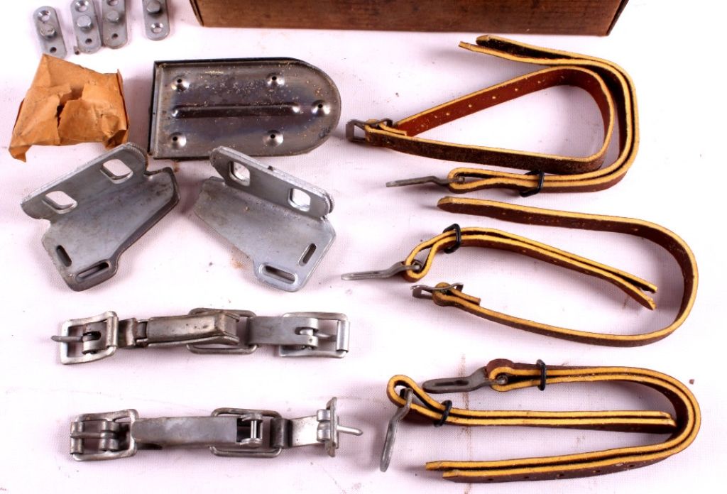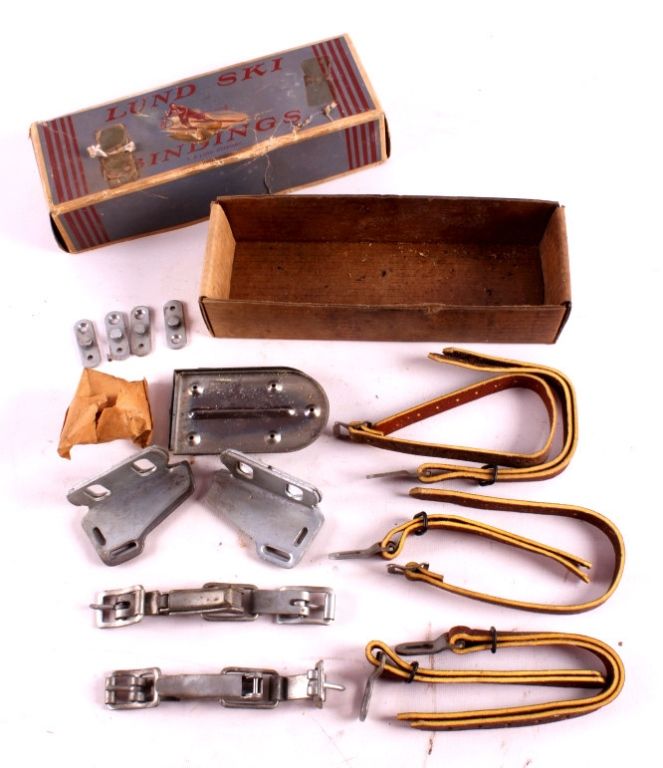 This is a pair of ski bindings from the U.S. Army 10th Mountain Division. The 10th Mountain Division is specially trained to operate in arctic and alpine conditions. These bindings are new in the box, never used. They are in excellent condition. The box measures 4" x 11".