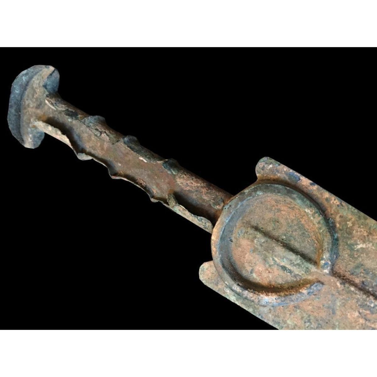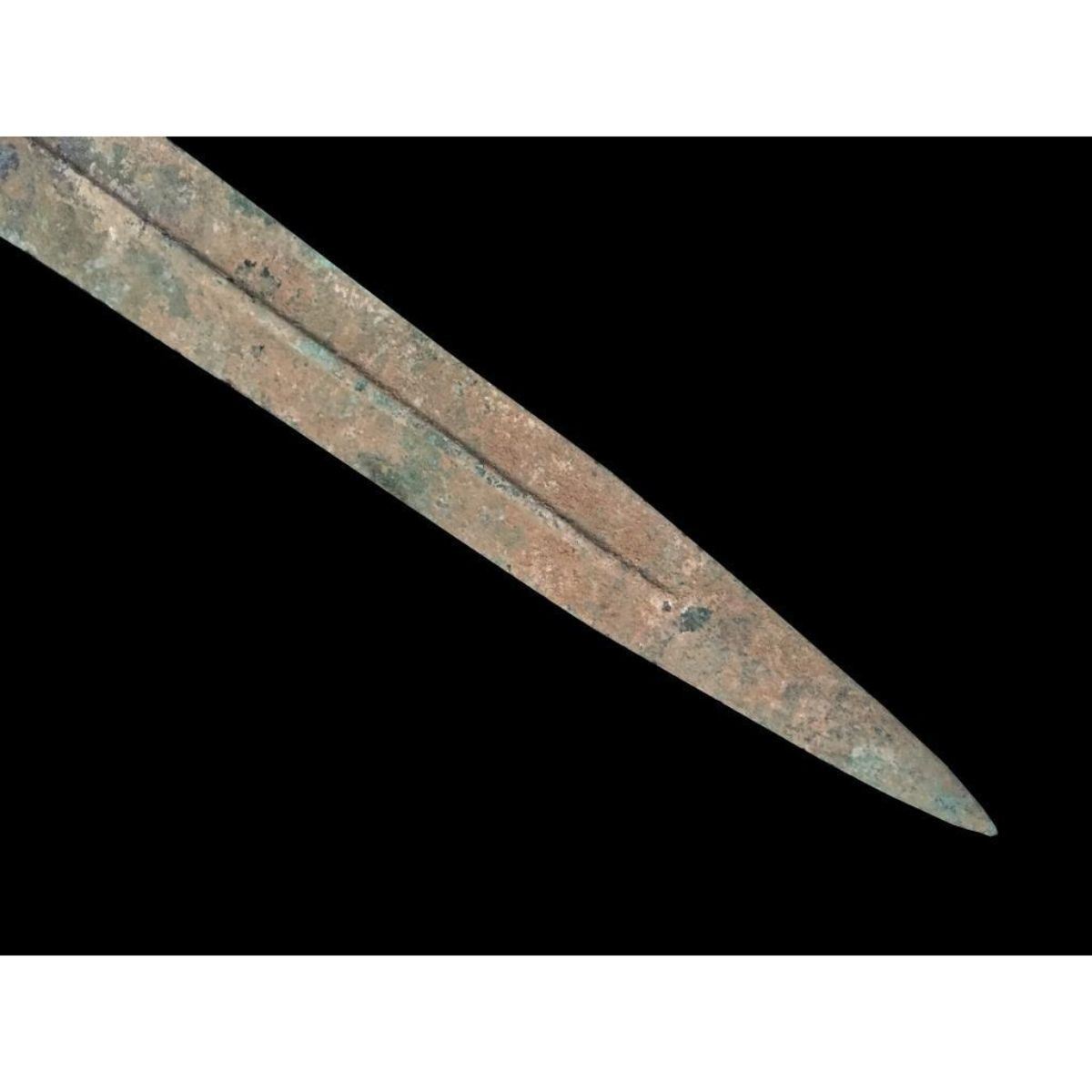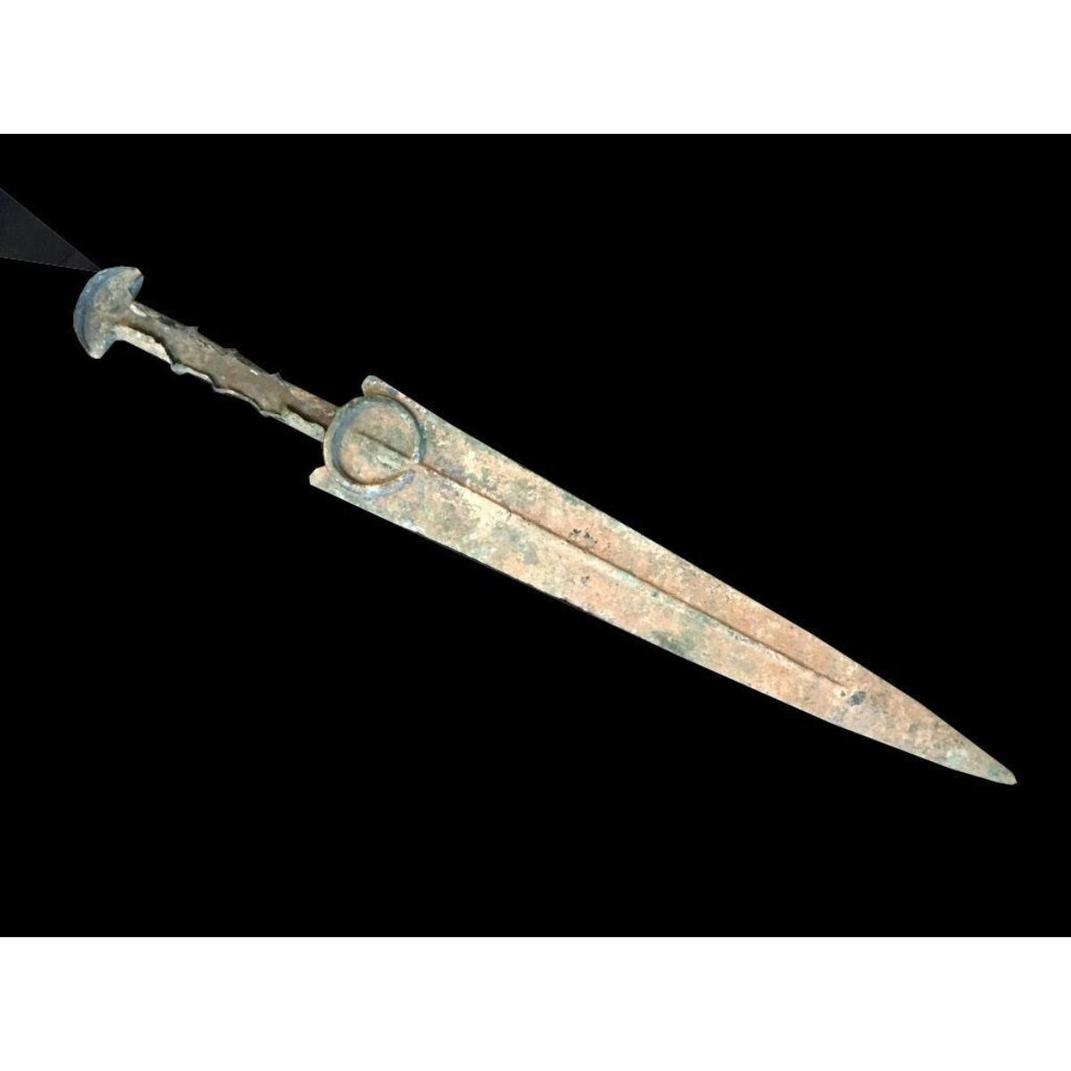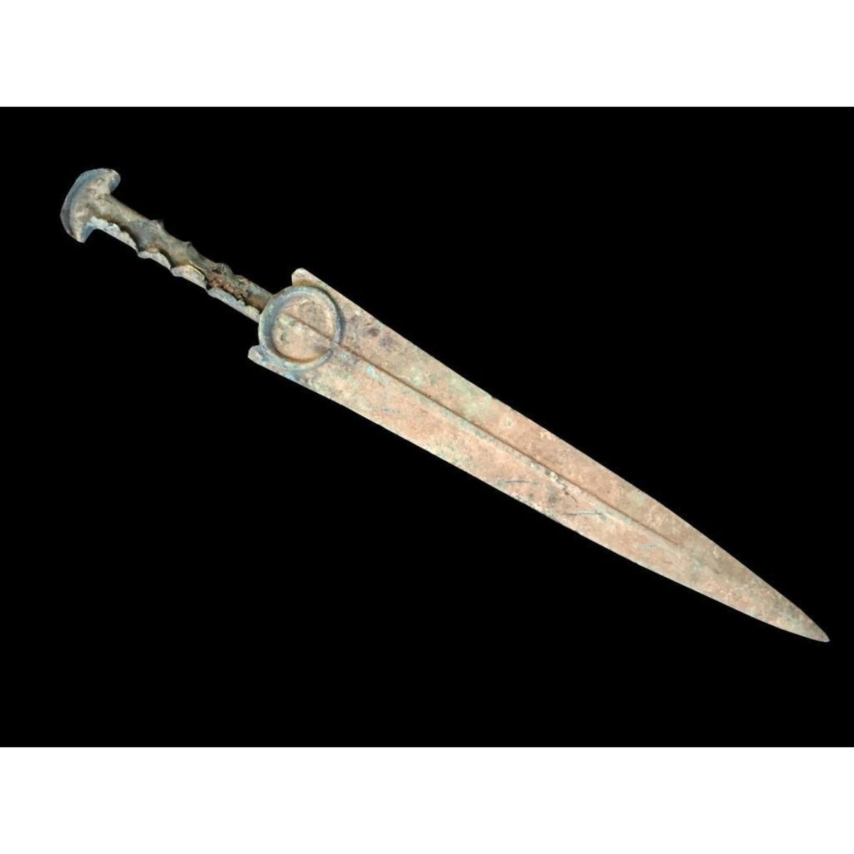 10th Century AD, short sword or dagger, with triangular tapering blade, round-section midrib, raised crescentric rib to each face, D-shaped pommel & ribbed grip with lateral flanges to accept an organic insert. Finecondition. Provenance - From a specialist collector of weaponry, London, UK ; formed in the 1970's. 17 3/4" L. Literature - Cf. Khorasani, M.M. Arms & Armour from Iran. The bronze Age to the End of the Qajar Period,Tubingen, 2006, fig. 20.