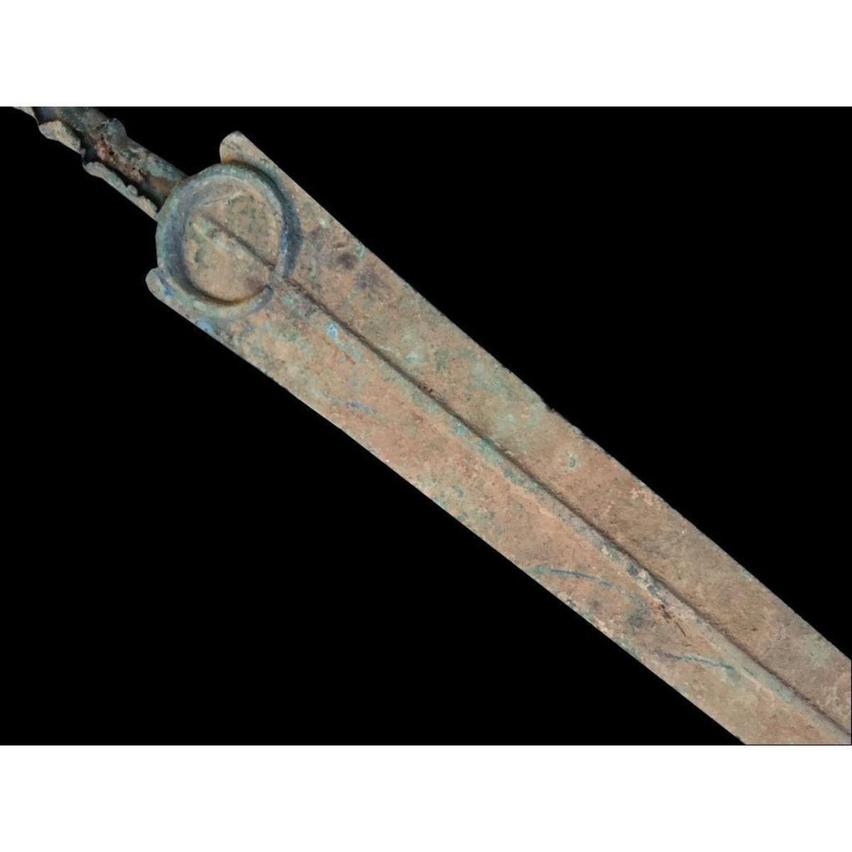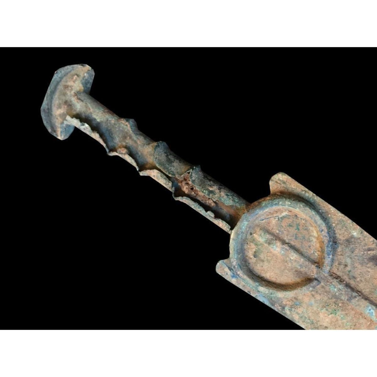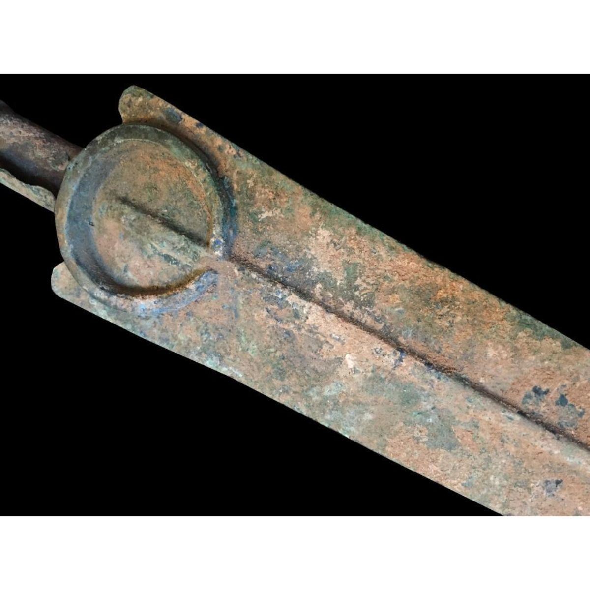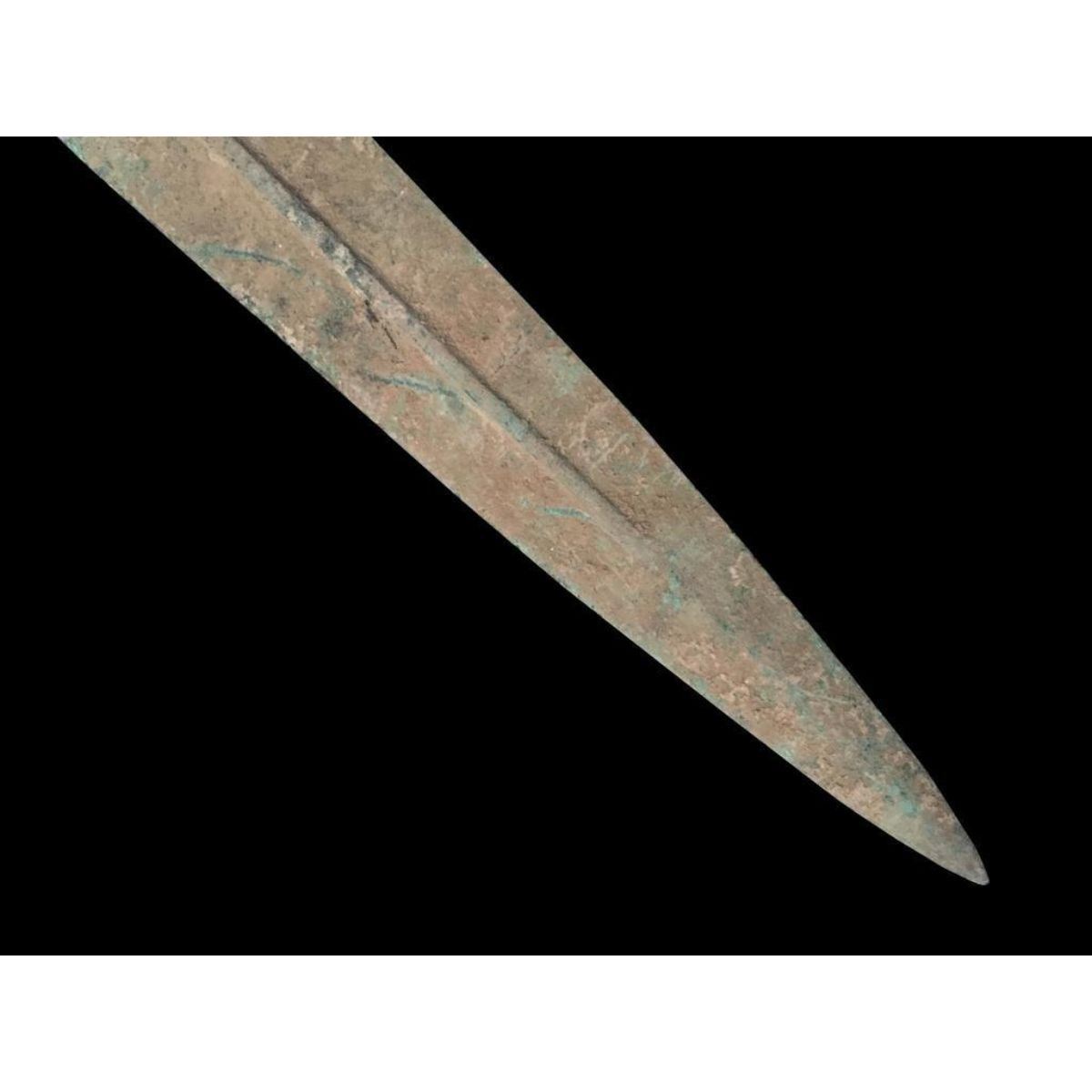 10th Century AD, short sword or dagger, with triangular tapering blade, round-section midrib, raised crescentric rib to each face, D-shaped pommel & ribbed grip with lateral flanges to accept an organic insert. Finecondition. Provenance - From a specialist collector of weaponry, London, UK ; formed in the 1970's. 17 3/4" L. Literature - Cf. Khorasani, M.M. Arms & Armour from Iran. The bronze Age to the End of the Qajar Period,Tubingen, 2006, fig. 20.