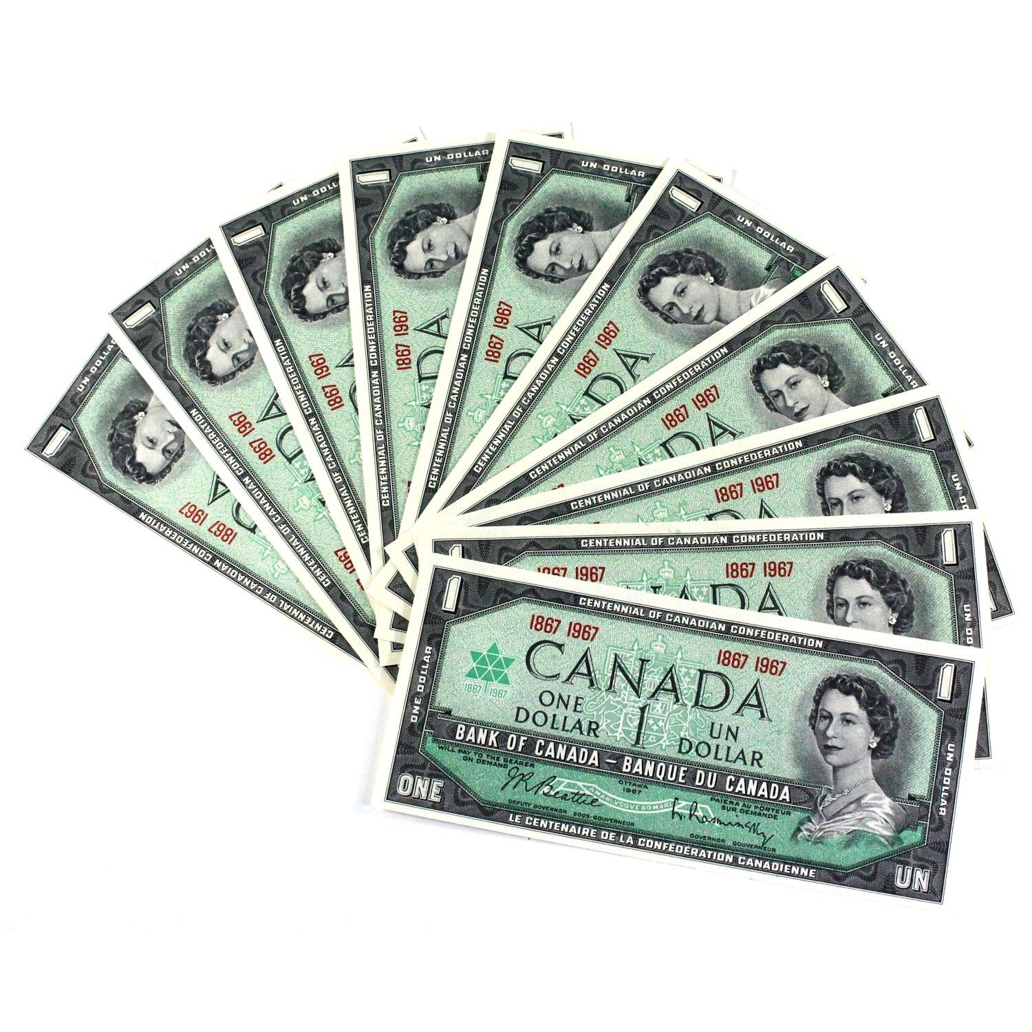 10x 1867-1967 Canada Centennial $1 Bank of Canada notes. 10pcs