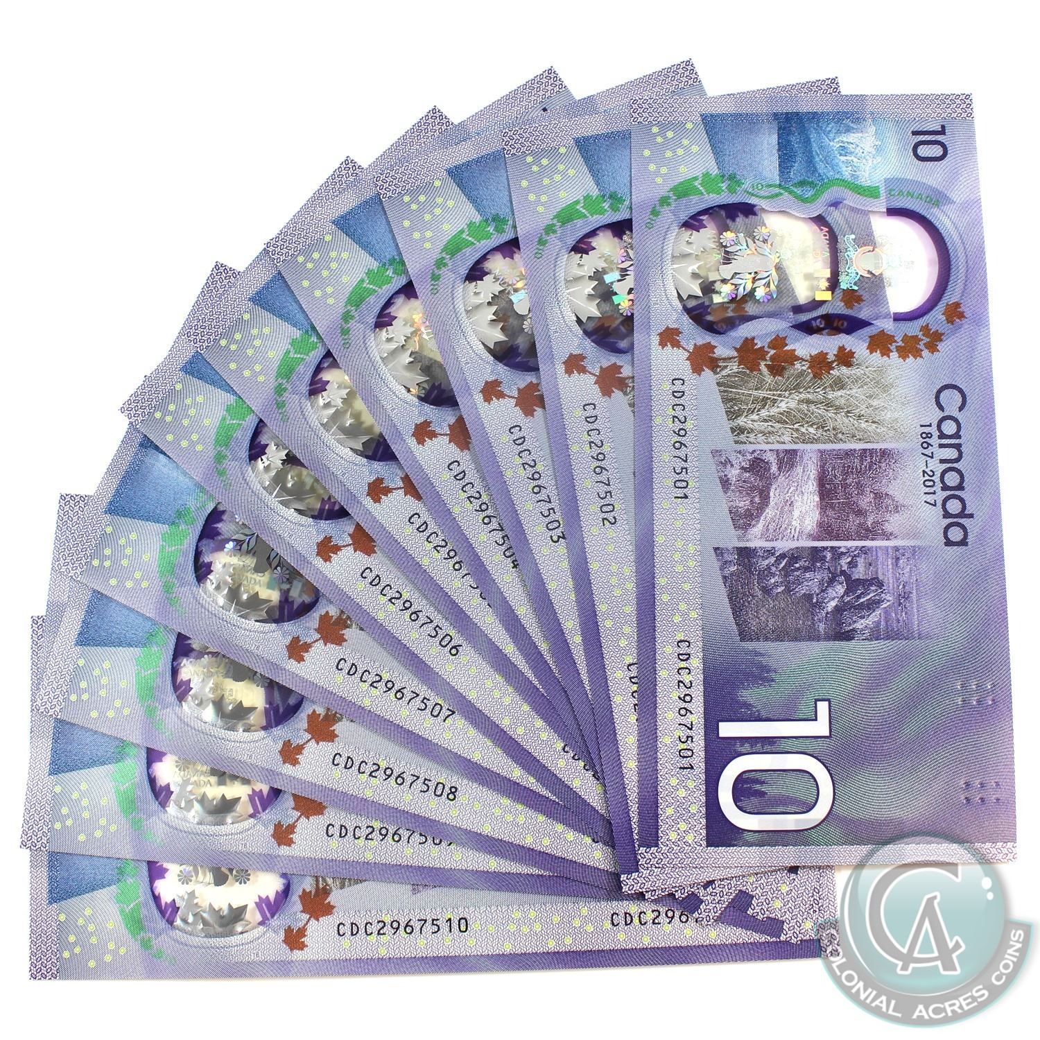 10x 1867-2017 $10 Bank of Canada Commemorative Notes with Consecutive Serial Numbers - CDC2967501-10. 10pcs