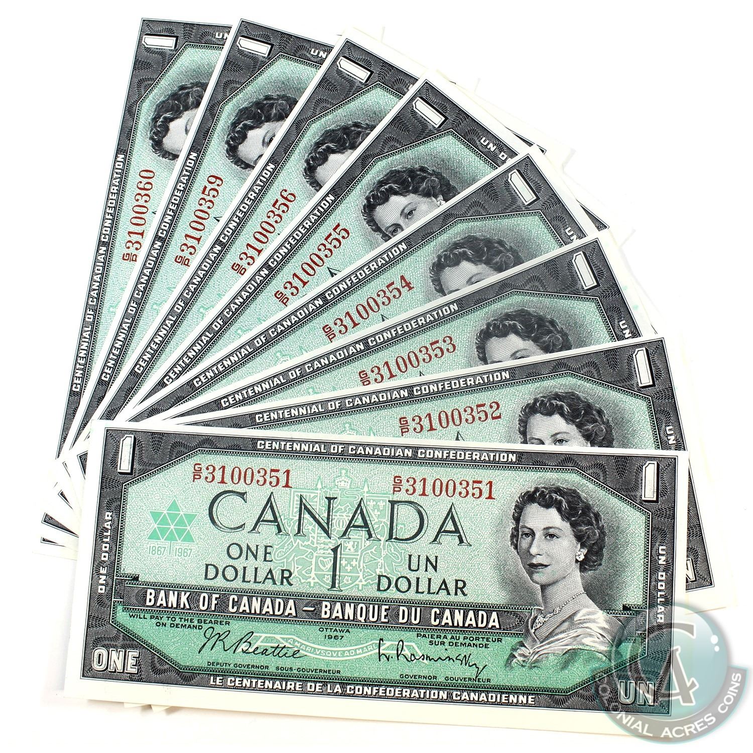 10x 1967 $1 BC-45b-i Bank of Canada Notes with Consecutive Serial Numbers UNC Condition - G/P3100351-60. 10pcs