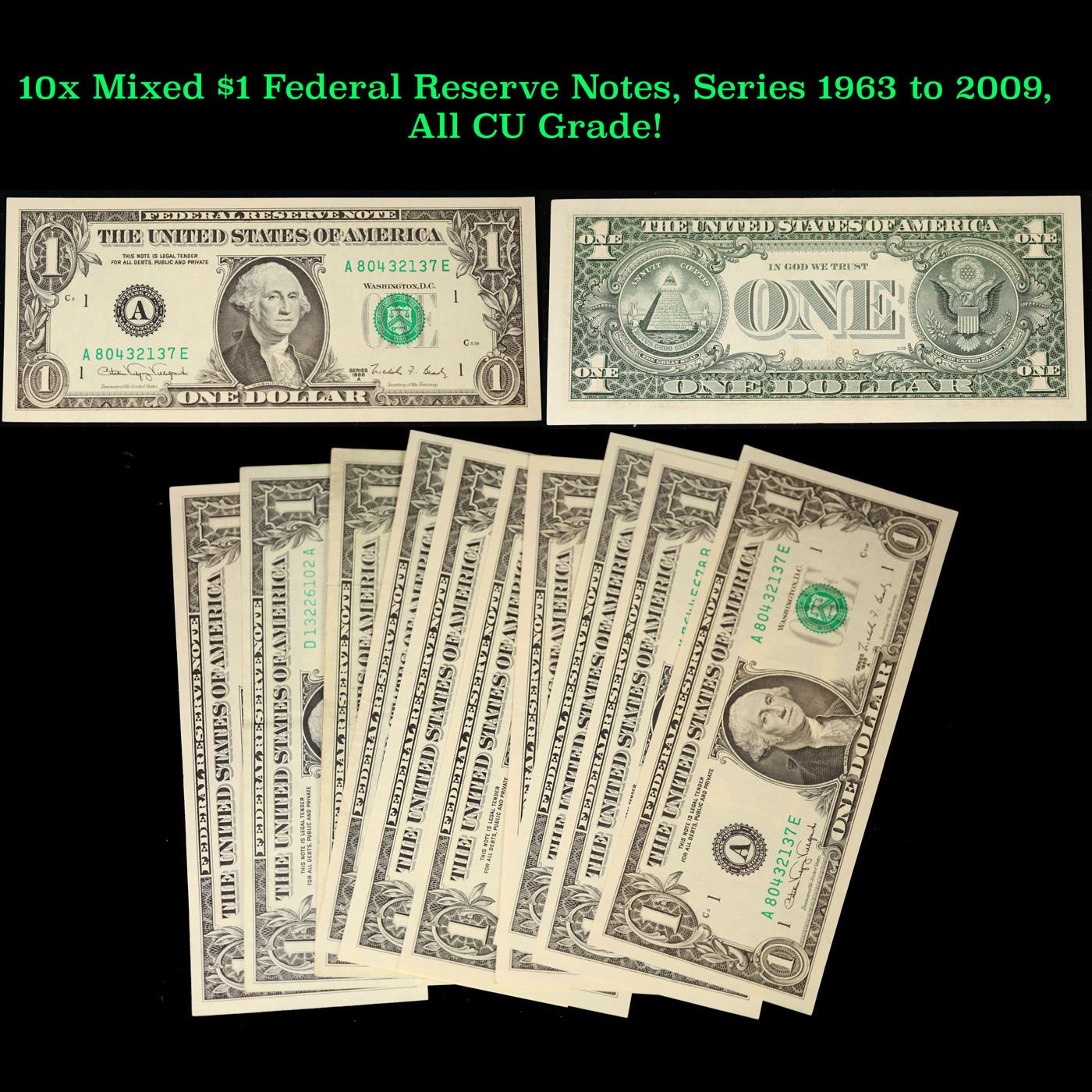 10x Mixed $1 Federal Reserve Notes, Series 1963 to 2009, All CU Grade! Grades Brilliant Uncirculated.