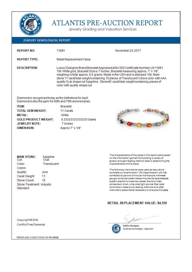 11681 - REF-69W3H ---- 11.0 CTW Multi-Color Sapphire Bracelet 10K White Gold ---- Luxury Designer Brand Bracelet Appraised at $4,550 Certificate Number US11681 10k White gold, Bracelet Size is 7 Inches, Bracelet measuring approx. 7" x 1/8", weighing in total approx. 6.5 grams. Made in the USA and is stamped 10k, Main stone 11 carat total weight containing 15 pieces of Translucent Colors color with AAA quality Oval shape cut Sapphire , Stone #2 carat total weight containing pieces of color with quality shape cut