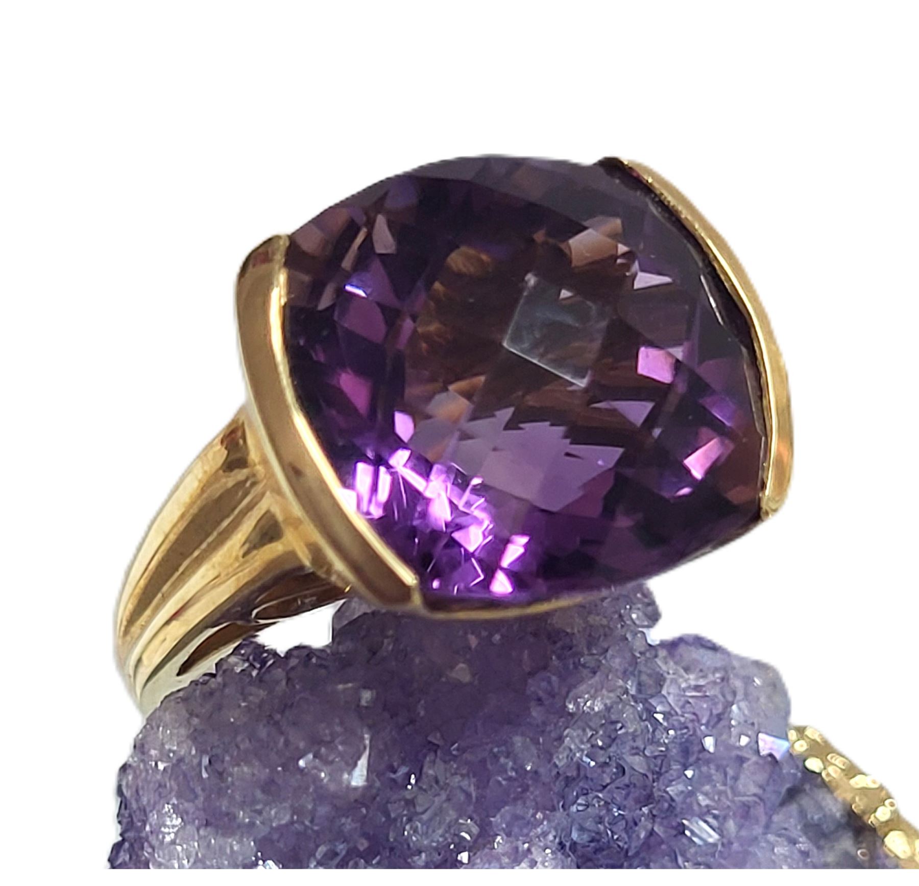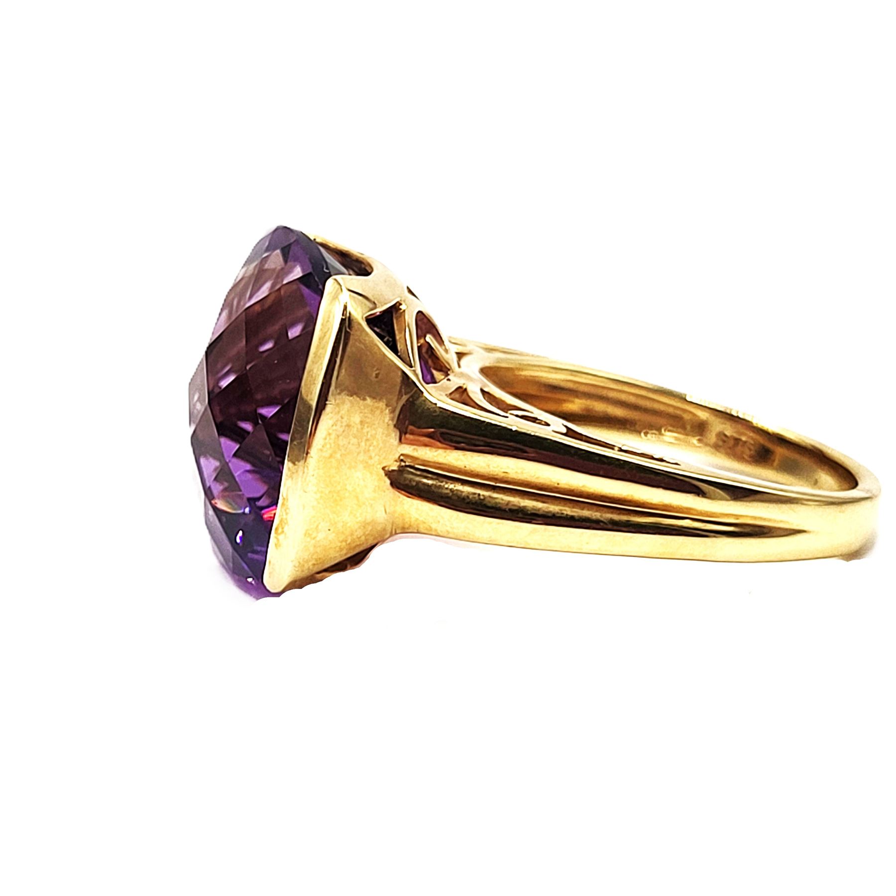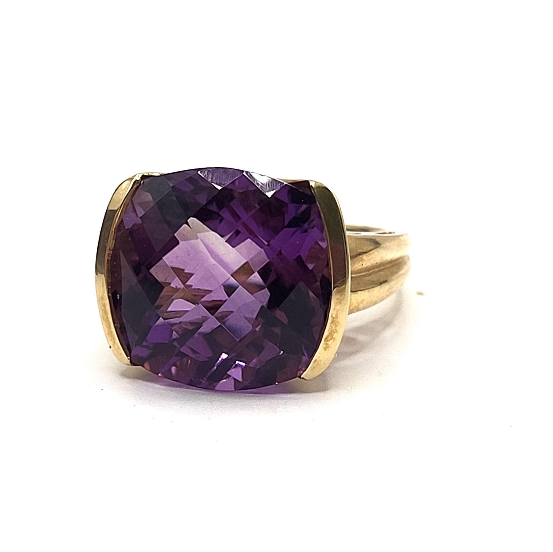 An approximate 11.00 carat, cushion-cut, top-faceted, genuine deep purple amethyst is semi-bezel set in this 14 karat yellow gold ring with a glamorous swirled bridge and solid, ribbed cathedral shoulders, which taper to an approximate 2.5mm shank. This ring is US size 7. See below for sizing details and additional information.& nbsp; Admin: 33109/19nbl