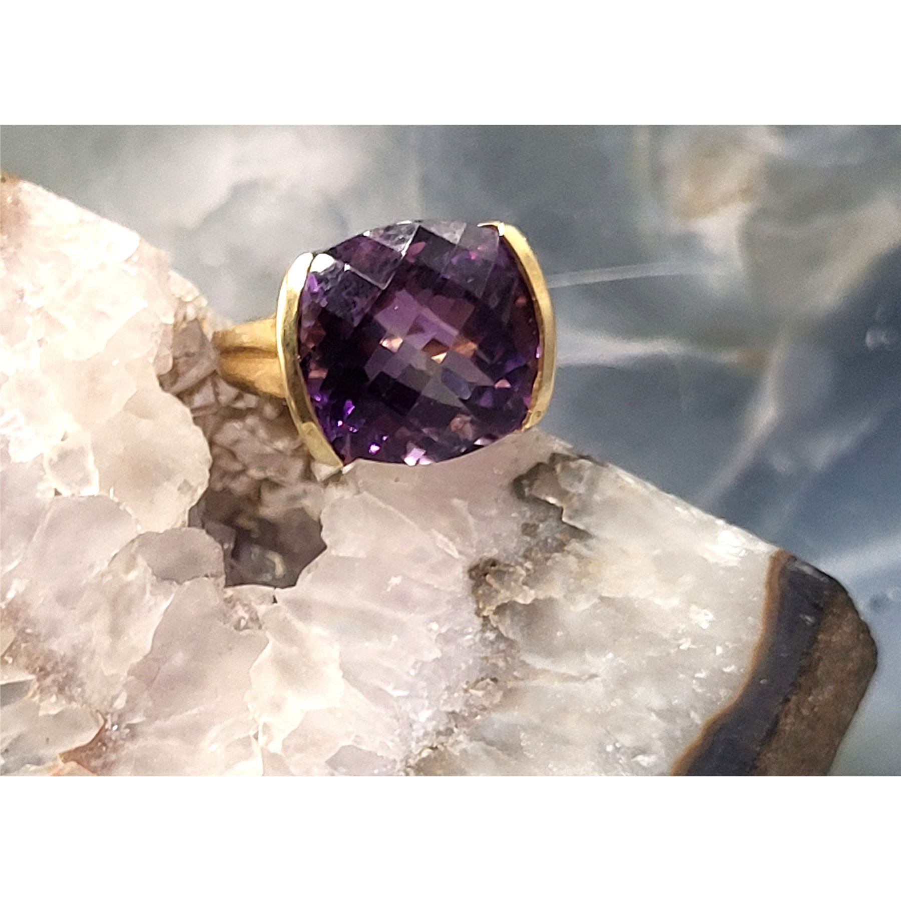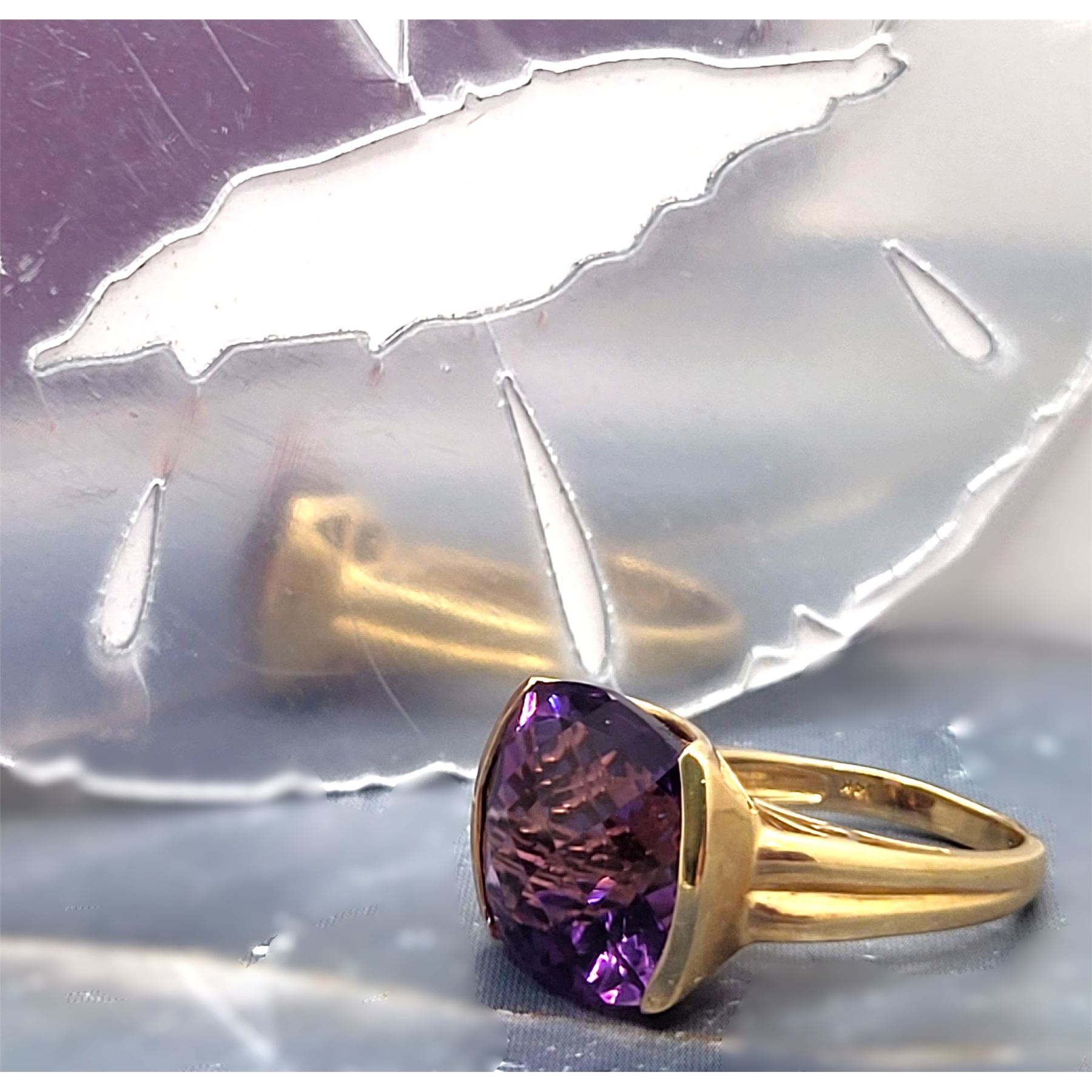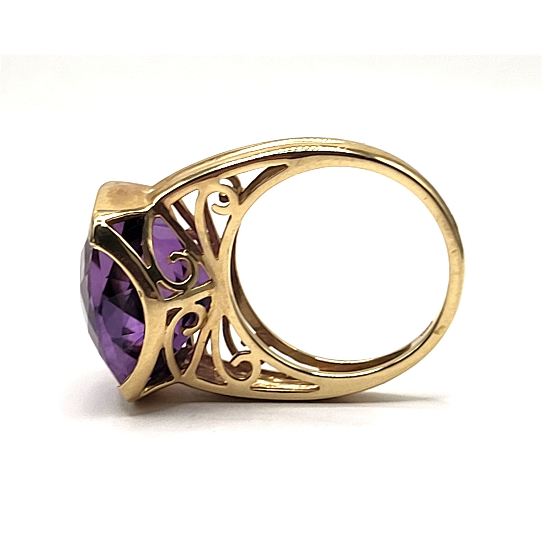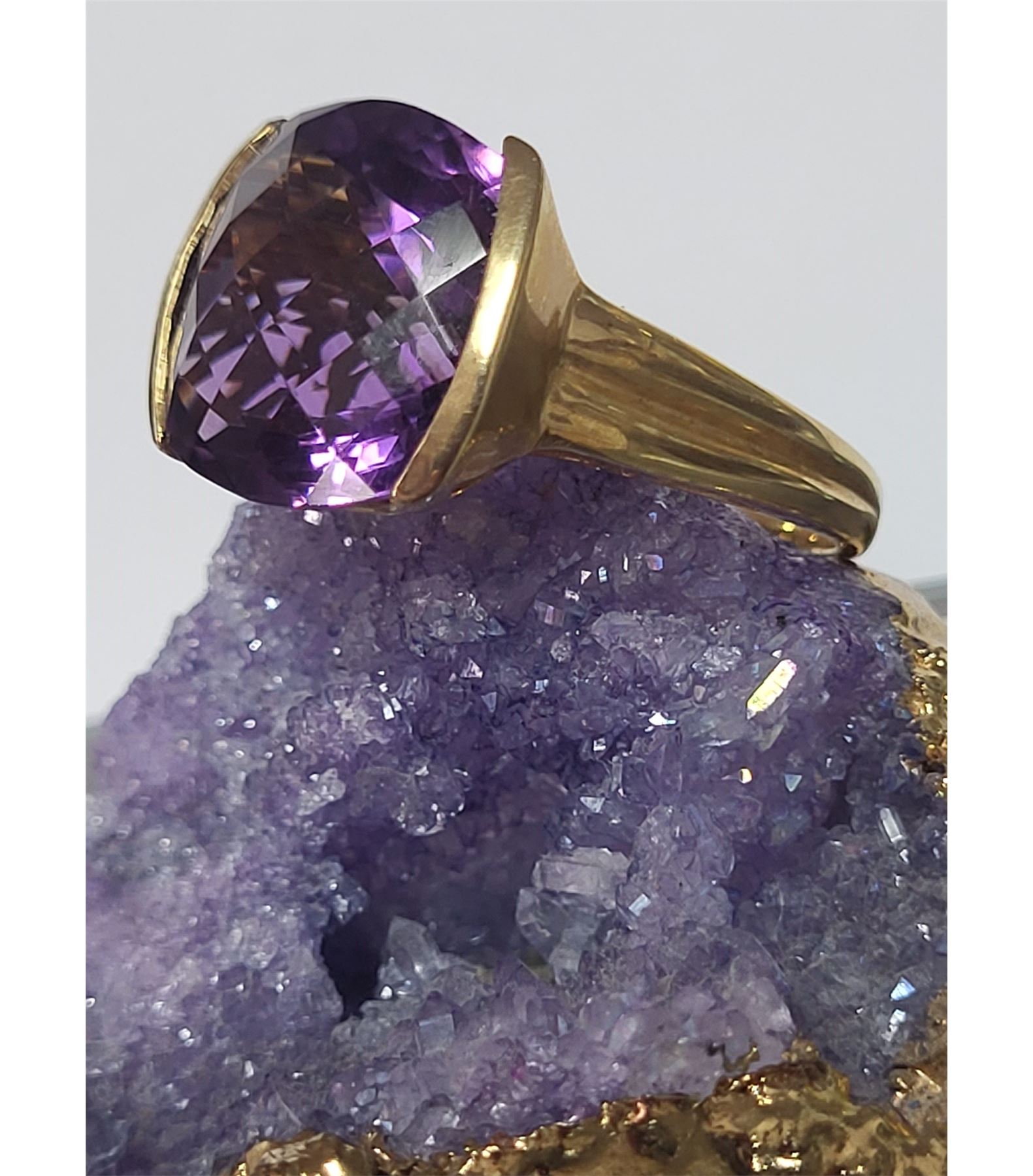 An approximate 11.00 carat, cushion-cut, top-faceted, genuine deep purple amethyst is semi-bezel set in this 14 karat yellow gold ring with a glamorous swirled bridge and solid, ribbed cathedral shoulders, which taper to an approximate 2.5mm shank. This ring is US size 7. See below for sizing details and additional information.& nbsp; Admin: 33109/19nbl