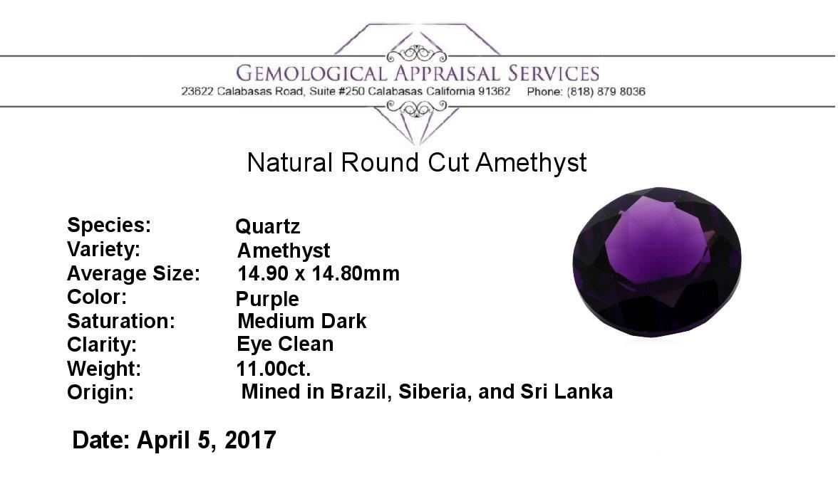 One natural round cut amethyst with an exact weight of 11.00ct., clarity is eye clean, purple, medium dark. Gemological Appraisals Services estimates the retail value at $330 GAS Appraised.