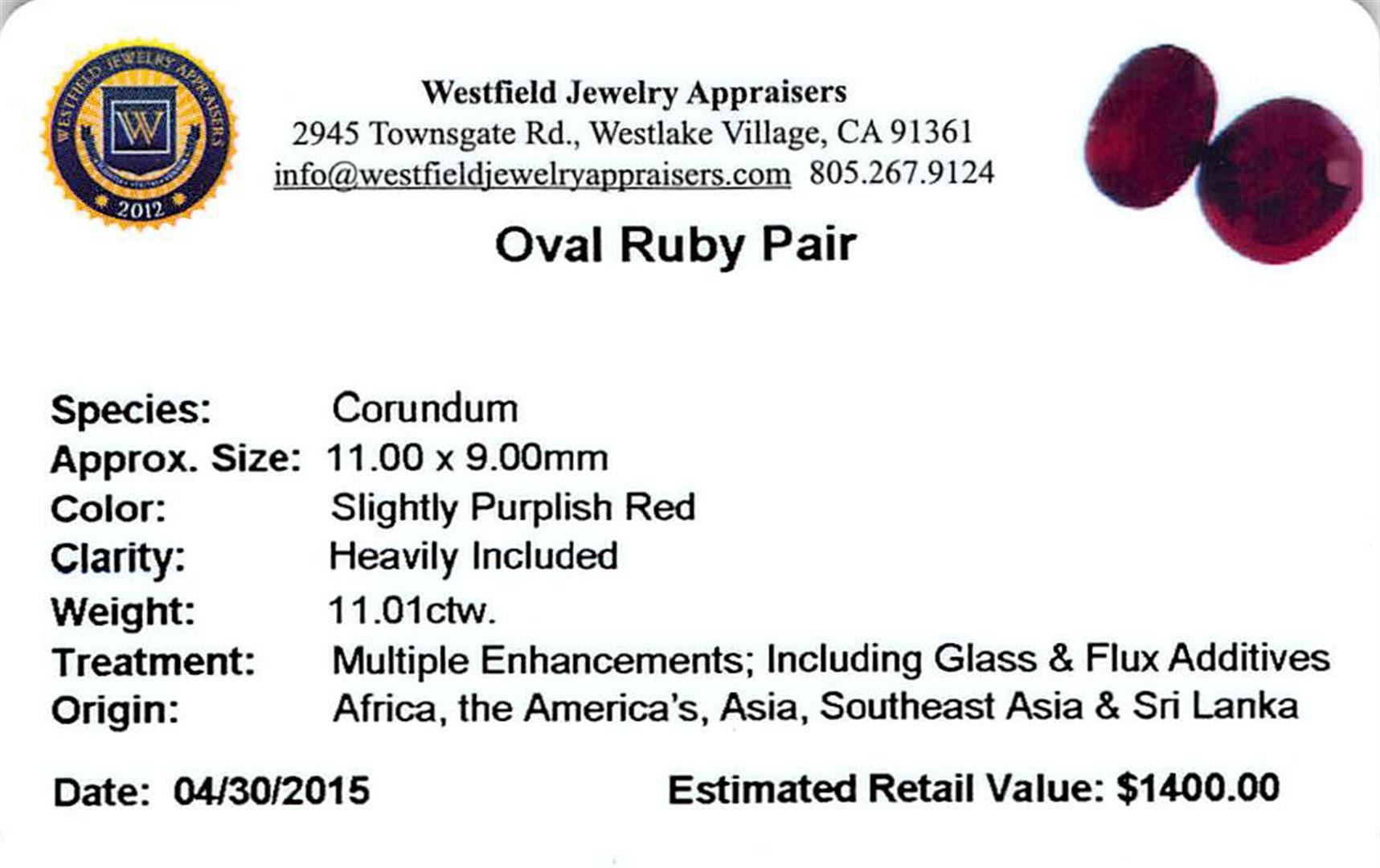 Two oval mixed cut natural rubies exact total weight 11.01ct., clarity is heavily included, type II, dark, very slightly brownish, slightly purplish red color, (GIA slpR 7/3), cut is good. Westfield Appraised at $1,400.00.