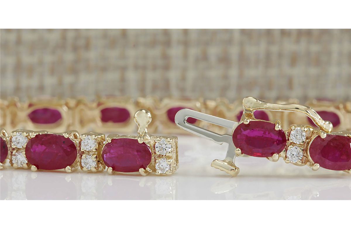 Stamped: 14K Total Bracelet Weight: 12 Grams Diamond Weight: Total natural diamond weight is 1.00carat. SI1-SI2 clarity / G-H color Gemstone Weight: Total Natural Ruby Weight is 10.01ctw (Measures: 4.00x6.00mm) Width: 4.65mm Main stone color: Red [SKU:703190]