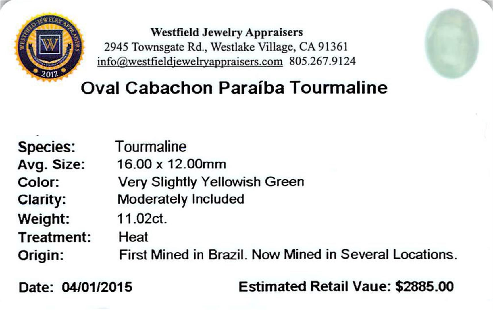 One oval cabochon cut Paraiba tourmaline exact weight 11.02ct., clarity is moderately included, cut is good. Westfield Appraised at $2,885.00.