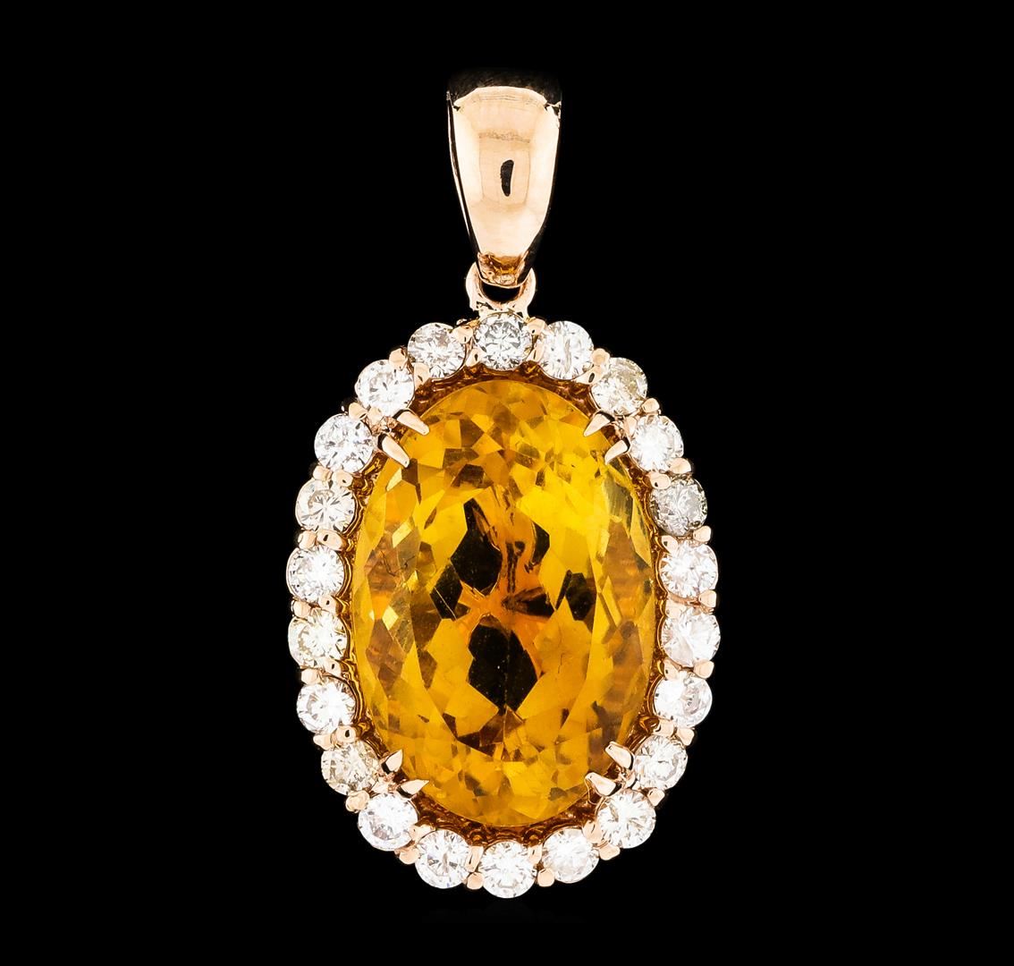 One Citrine and Diamond Pendant featuring: 14KT Rose Gold with a total weight of 6.00 grams, Citrine with a total weight of 11.03ct, and side diamonds with a total weight of 1.10ctw.