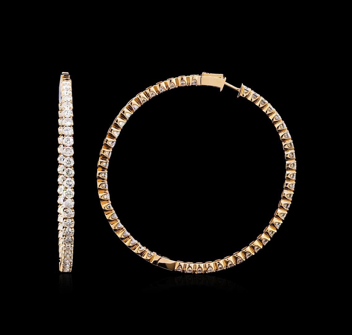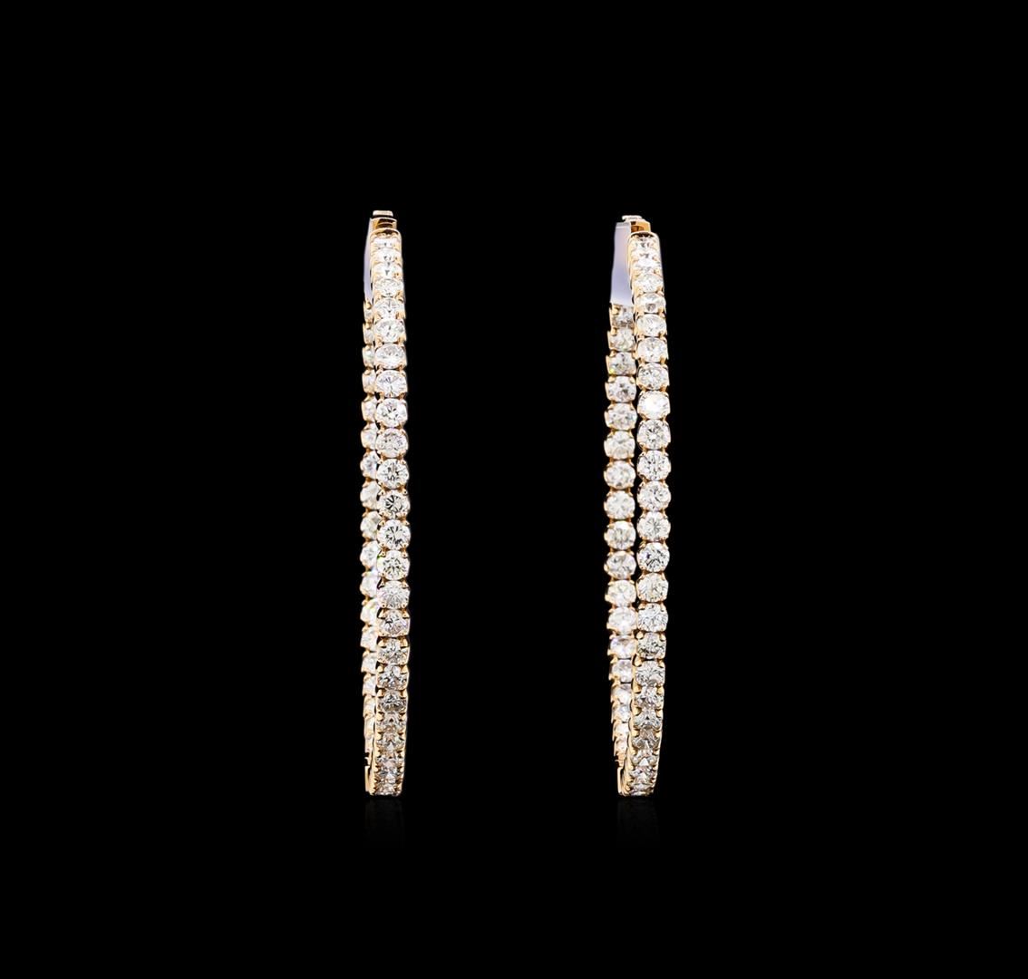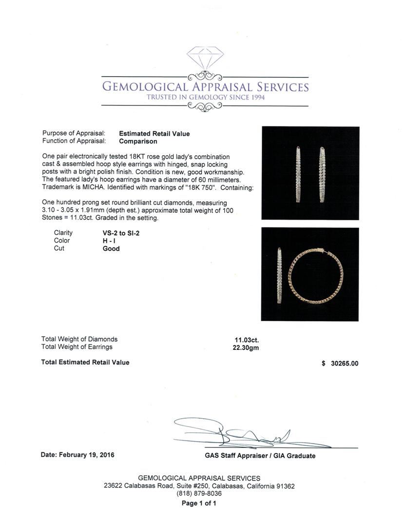 One pair electronically tested 18KT rose gold lady's combination cast & assembled hoop style earrings with hinged, snap locking posts with a bright polish finish. The featured lady's hoop earrings have a diameter of 60 millimeters. Trademark is MICHA. Identified with markings of "18K 750". Condition is new, good workmanship. Containing: One Hundred prong set round brilliant cut diamonds, measuring 3.10 - 3.05 x 1.91mm (depth est.) approximate total weight of 100 Stones = 11.03ct. Graded in the setting. Clarity: VS-2 to SI-2. Color: H - I. Cut Good. Total Weight of Diamonds 11.03ct. Total Weight of Earrings 22.30gm. GAS Appraised at $30,265.00.