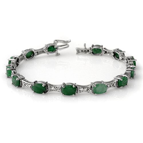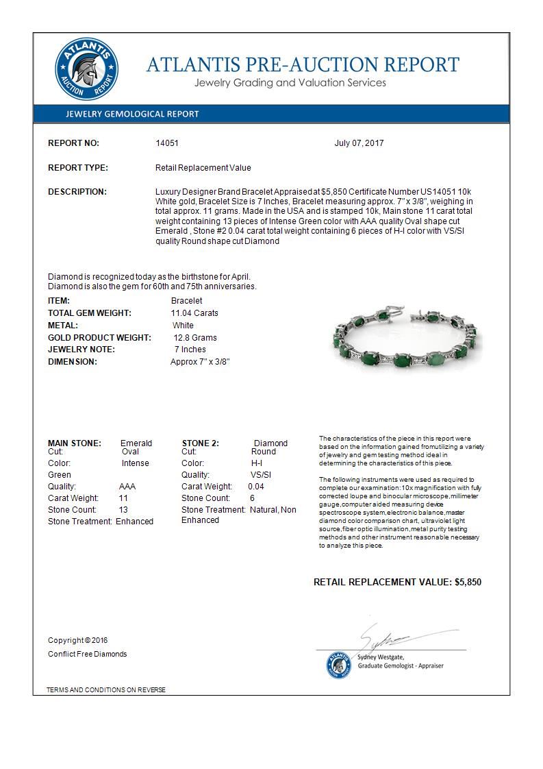 11.04 CTW Emerald & Diamond Bracelet 10K White Gold ---- Luxury Designer Brand Bracelet Appraised Retail Price at $5,850 ---- SKU Number US14051 10k White gold Bracelet Size is 7 Inches, Bracelet measuring approx. 7" x 3/8", weighing in total approx. 11 grams. Made in the USA and is stamped 10k, Main stone 11 carat total weight containing 13 pieces of Intense Green color with AAA quality Oval shape cut Emerald , Stone #2 0.04 carat total weight containing 6 pieces of H-I color with VS/SI quality Round shape cut