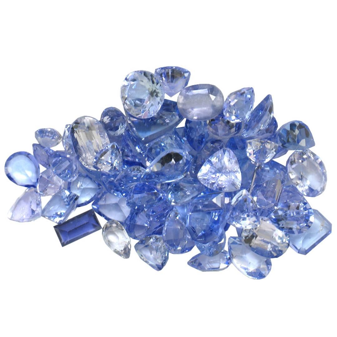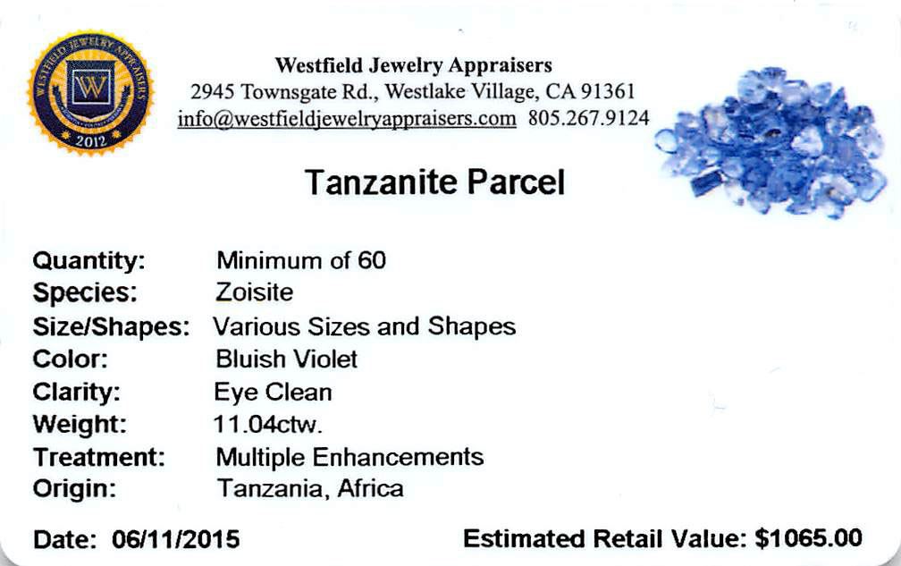 Sixty mixed cut natural tanzanites exact total weight 11.04ct., clarity is eye clean, type I, medium dark, very slightly grayish, bluish violet color, (GIA bV 6/3), cut is good. Transmitting light with no distortion, transparent. Color grade is an average for the group. Graded in the setting. Tanzanite is a very rare gemstone that is only found in the country of Tanzania. Originally discovered in 1967. Tiffany & Company, named the stone Tanzanite. It is found in the Usumburu Mountains that border the Umba Valley of northern Tanzania. Tanzanite occurs in gray, brown, violet, blue, reddish-purple, & green. The gem is interesting because of its exceptional pleochroism. Rotated in different directions a tanzanite will exhibit multiple changes of color. Tanzanite has a low tolerance to ultrasonic cleaning, and should not be cleaned using this method. Westfield Appraised at $1,065.00.