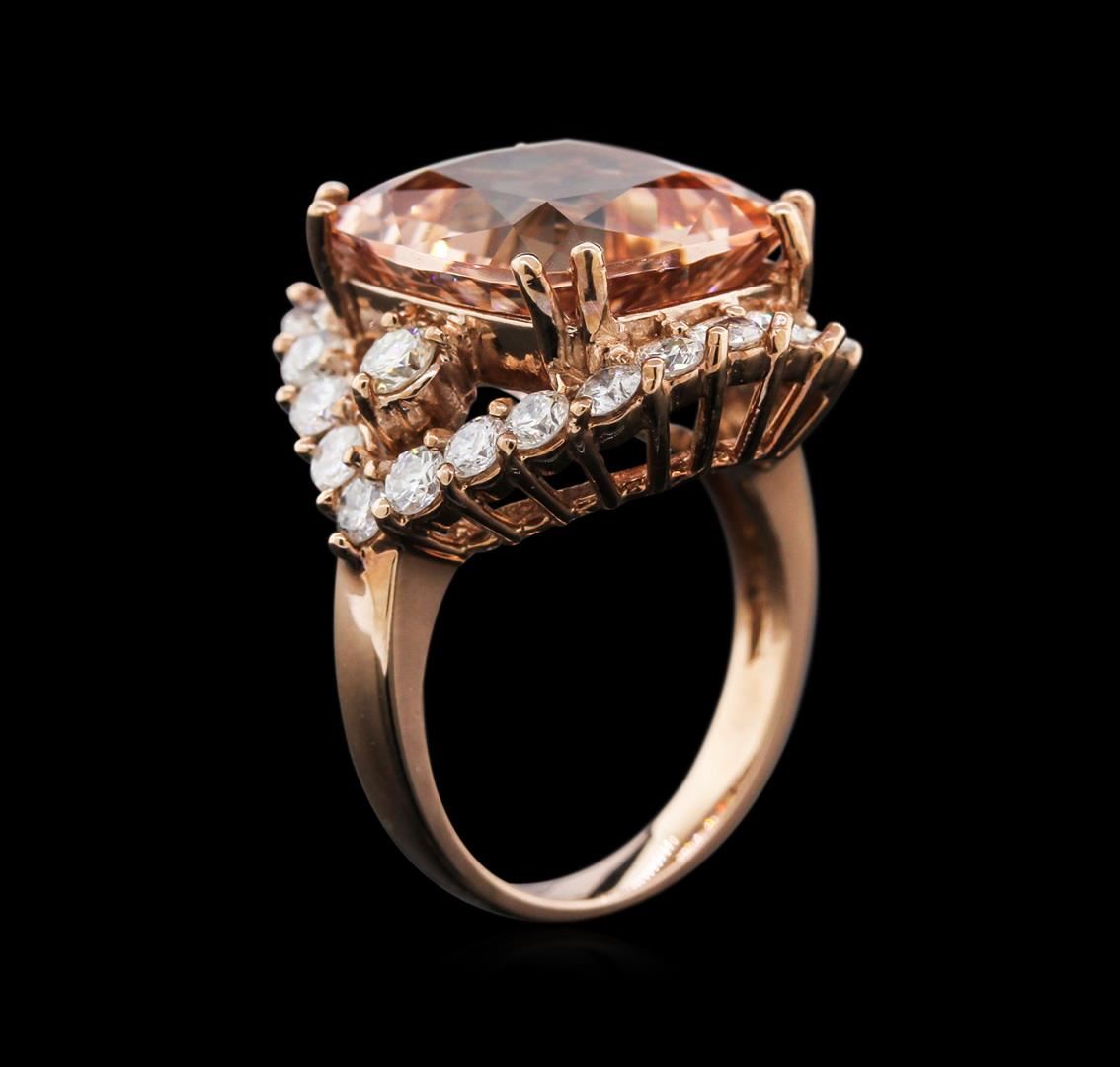 One electronically tested 14KT rose gold lady's cast fashion ring with a basket halo with a bright polish finish. The featured lady's ring has a shank measuring 2.95 millimeters wide. Identified with markings of "K14". Condition is new, good workmanship. Containing: One prong set square cushion modified brilliant cut natural morganite, measuring 14.13 x 14.13 x 9.36mm, approximate weight of 11.05ct., clarity is eye clean, type I, light, very slightly brownish, reddish orange color, (GIA rO 3/3), cut is very good. Transmitting light with no distortion, transparent. Colored gemstones are presumed to have been subjected to commonly used enhancement processes. Graded in the setting. Two prong set round brilliant cut diamonds, measuring 3.15 - 3.10 x 2.03mm (depth est.) approximate total weight of 2 Stones = 0.25ct. Graded in the setting. Clarity: SI-1 to SI-2. Color: H - I. Cut Good Twenty-Four prong set round brilliant cut diamonds, measuring 2.70 - 2.60 x 1.59mm (depth est.) approximate total weight of 24 Stones = 1.56ct. Graded in the setting. Clarity: SI-2 to I-1. Color: H - I. Cut Good. Total Weight of Colored Stones 11.05ct. Total Weight of Diamonds 1.81ct. Total Weight of Ring 10.50gm. GAS Appraised at $8,310.00.