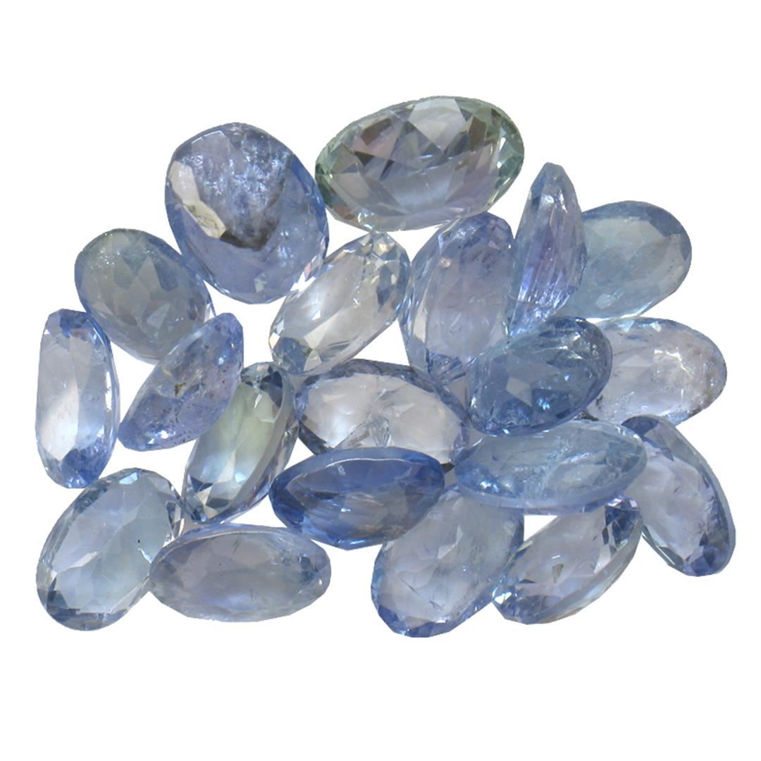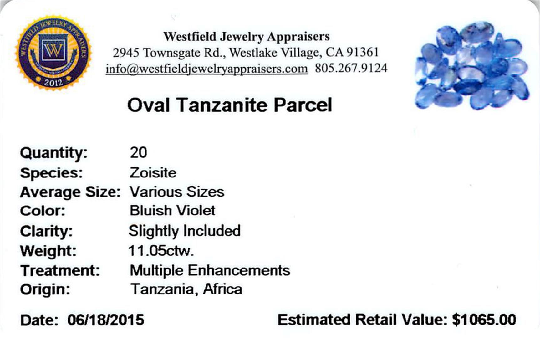 Twenty oval mixed cut natural tanzanites exact total weight 11.05ct., clarity is slightly included, type I, medium dark, very slightly grayish, bluish violet color, (GIA bV 6/3), cut is good. Transmitting light with a minimum of distortion, transparent. Naturally occurring internal & external characteristics are present. Color grade is an average for the group. Tanzanite is a very rare gemstone that is only found in the country of Tanzania. Originally discovered in 1967. Tiffany & Company, named the stone Tanzanite. It is found in the Usumburu Mountains that border the Umba Valley of northern Tanzania. Tanzanite occurs in gray, brown, violet, blue, reddish-purple, & green. The gem is interesting because of its exceptional pleochroism. Rotated in different directions a tanzanite will exhibit multiple changes of color. Tanzanite has a low tolerance to ultrasonic cleaning, and should not be cleaned using this method. Westfield Appraised at $1,065.00.