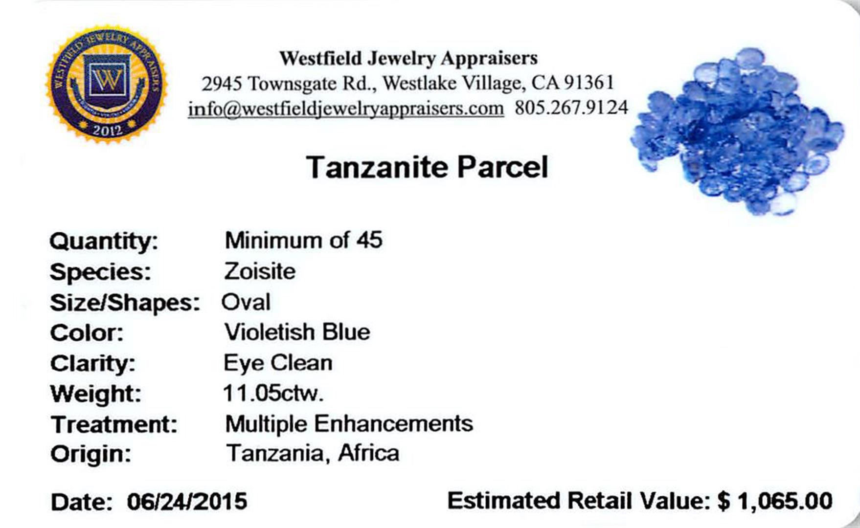 Forty-five oval mixed cut natural tanzanites, measuring 4.00 x 3.00 x 2.00mm, exact total weight 11.05ct., clarity is slightly included, type I, medium dark, very slightly grayish, violetish blue color, (GIA vB 6/3), cut is good. Measurements & the color grade are an average for the group, Color grade is an average for the group, Transmitting light with no distortion, transparent, Naturally occurring internal & external characteristics are present, Indications of multiple laboratory enhancements, including high temperature heat treatment. Westfield Appraised at $1,065.00.