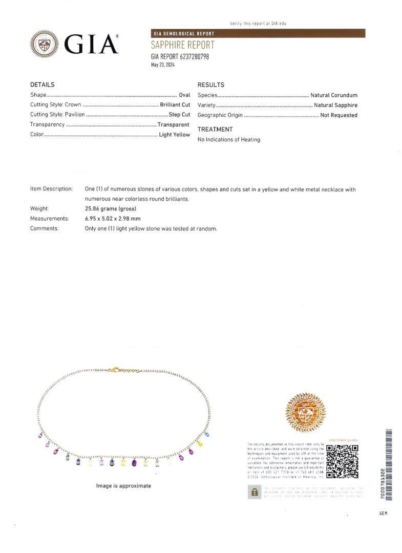 Eighteen karat (18K) yellow gold natural multi color unheated sapphire corundum and diamond necklace. Oval brilliant, heart brilliant, and octagonal step cut natural multi color unheated sapphire corundum gemstones are mounted in the center of the necklace. Round brilliant cut diamonds accent the necklace on top of the center gemstones. The necklace has a gross weight of 25.9 Grams. Reference: GIA Sapphire Report 6237280798 #NATURAL GEMSTONE# GEMSTONE: Sapphire Corundum NATURE: Natural (No Indications of Heating) SHAPE: Oval/Heart/Octagonal Step, Faceted Cut WEIGHT: 11.05 carat total (17pcs.) DIMENSIONS: 7.0 x 3.1mm CLARITY: Type 2 COLOR: Multi Color (5/5) SYMMETRY: Excellent COLOR INTENSITY: Intense TRANSPARENCY: Transparent TONE: Light-Dark #NATURAL DIAMOND# SHAPE: Round Brilliant Cut WEIGHT: 4.52 carat total (177pcs.) DIMENSIONS: 2.0 x 1.8mm AVERAGE CLARITY: SI1-SI2 AVERAGE COLOR: G-H SYMMETRY: Excellent POLISH: Excellent #METAL# METAL: Gold PURITY: 18K (750) COLOR: Yellow CONDITION: Excellent FINISH: High Polish Size: 17