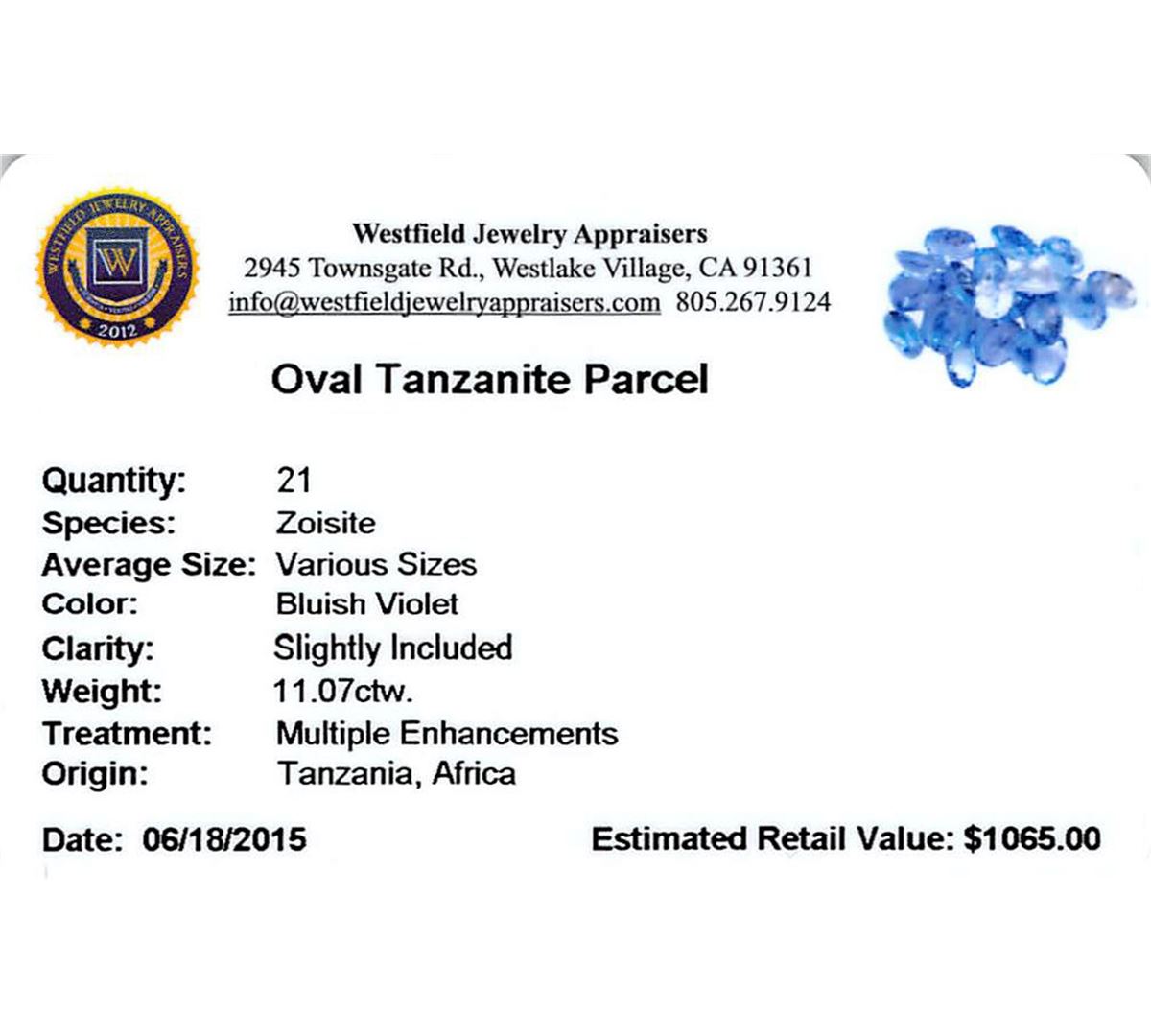Twenty-one oval mixed cut natural tanzanites exact total weight 11.07ct., clarity is slightly included, type I, medium dark, very slightly grayish, bluish violet color, (GIA bV 6/3), cut is good. Transmitting light with a minimum of distortion, transparent. Naturally occurring internal & external characteristics are present. Color grade is an average for the group. Tanzanite is a very rare gemstone that is only found in the country of Tanzania. Originally discovered in 1967. Tiffany & Company, named the stone Tanzanite. It is found in the Usumburu Mountains that border the Umba Valley of northern Tanzania. Tanzanite occurs in gray, brown, violet, blue, reddish-purple, & green. The gem is interesting because of its exceptional pleochroism. Rotated in different directions a tanzanite will exhibit multiple changes of color. Tanzanite has a low tolerance to ultrasonic cleaning, and should not be cleaned using this method. Westfield Appraised at $1,065.00.