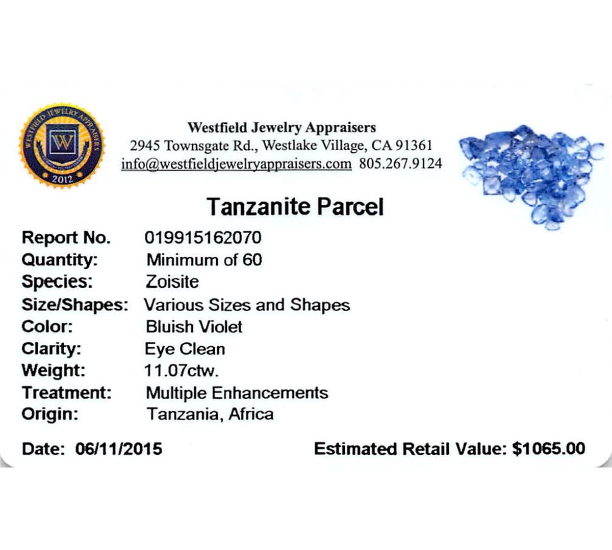 Sixty mixed cut natural tanzanites exact total weight 11.07ct., clarity is eye clean, type I, medium dark, very slightly grayish, bluish violet color, (GIA bV 6/3), cut is good. Transmitting light with no distortion, transparent. Color grade is an average for the group. Graded in the setting. Tanzanite is a very rare gemstone that is only found in the country of Tanzania. Originally discovered in 1967. Tiffany & Company, named the stone Tanzanite. It is found in the Usumburu Mountains that border the Umba Valley of northern Tanzania. Tanzanite occurs in gray, brown, violet, blue, reddish-purple, & green. The gem is interesting because of its exceptional pleochroism. Rotated in different directions a tanzanite will exhibit multiple changes of color. Tanzanite has a low tolerance to ultrasonic cleaning, and should not be cleaned using this method. Westfield Appraised at $1,065.00.