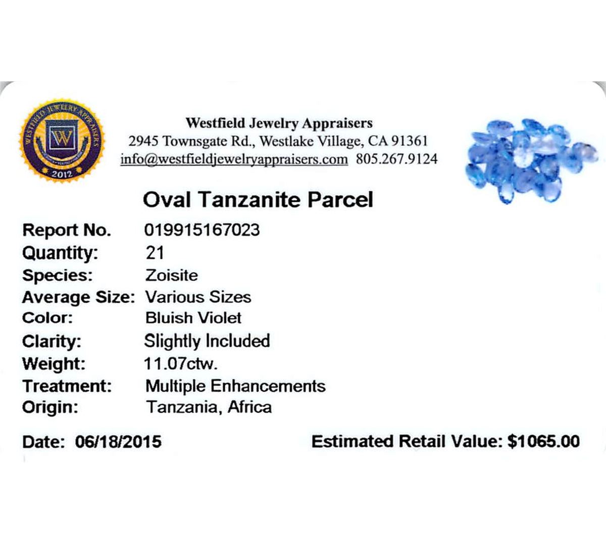 Twenty-one oval mixed cut natural tanzanites exact total weight 11.07ct., clarity is slightly included, type I, medium dark, very slightly grayish, bluish violet color, (GIA bV 6/3), cut is good. Transmitting light with a minimum of distortion, transparent. Naturally occurring internal & external characteristics are present. Color grade is an average for the group. Tanzanite is a very rare gemstone that is only found in the country of Tanzania. Originally discovered in 1967. Tiffany & Company, named the stone Tanzanite. It is found in the Usumburu Mountains that border the Umba Valley of northern Tanzania. Tanzanite occurs in gray, brown, violet, blue, reddish-purple, & green. The gem is interesting because of its exceptional pleochroism. Rotated in different directions a tanzanite will exhibit multiple changes of color. Tanzanite has a low tolerance to ultrasonic cleaning, and should not be cleaned using this method. Westfield Appraised at $1,065.00.