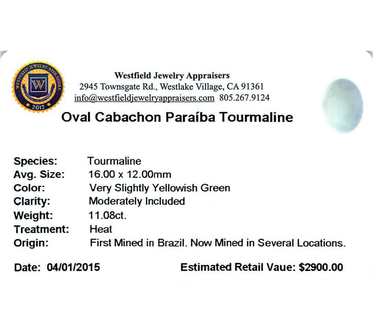 One oval cabochon cut natural Paraiba tourmaline exact weight 11.08ct., clarity is moderately included, cut is good. Westfield Appraised at $2,900.00.