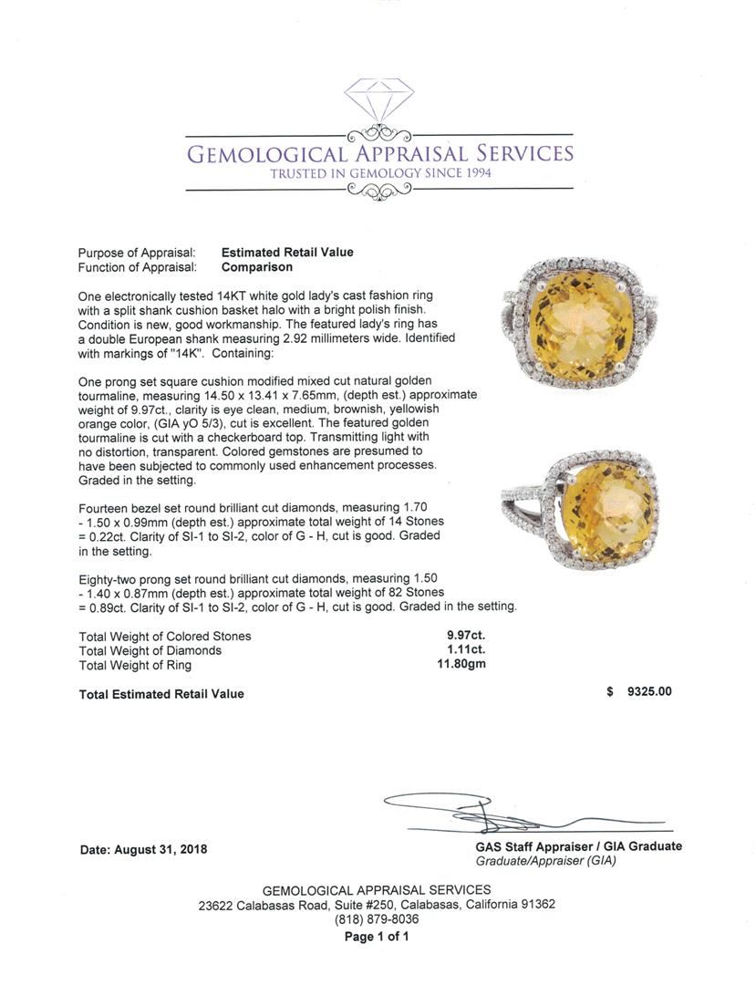 One electronically tested 14KT white gold lady's cast fashion ring with a split shank cushion basket halo with a bright polish finish. The featured lady's ring has a double European shank measuring 2.92 millimeters wide. Identified with markings of '14K'. Condition is new, good workmanship. Containing: One prong set square cushion modified mixed cut natural golden tourmaline, measuring 14.50 x 13.41 x 7.65mm, (depth est.) approximate weight of 9.97ct., clarity is eye clean, medium, brownish, yellowish orange color, (GIA yO 5/3), cut is excellent. The featured golden tourmaline is cut with a checkerboard top. Transmitting light with no distortion, transparent. Colored gemstones are presumed to have been subjected to commonly used enhancement processes. Graded in the setting. Fourteen bezel set round brilliant cut diamonds, measuring 1.70 - 1.50 x 0.99mm (depth est.) approximate total weight of 14 Stones = 0.22ct. Graded in the setting. Color G - H Clarity SI-1 to SI-2 Cut Good Eighty-Two prong set round brilliant cut diamonds, measuring 1.50 - 1.40 x 0.87mm (depth est.) approximate total weight of 82 Stones = 0.89ct. Graded in the setting. Color G - H Clarity SI-1 to SI-2 Cut Good. Total Weight of Colored Stones 9.97ct.. Total Weight of Diamonds 1.11ct.. Total Weight of Ring 11.80gm GAS Appraised at $9325.00. GAS Appraised at $9,325.00.