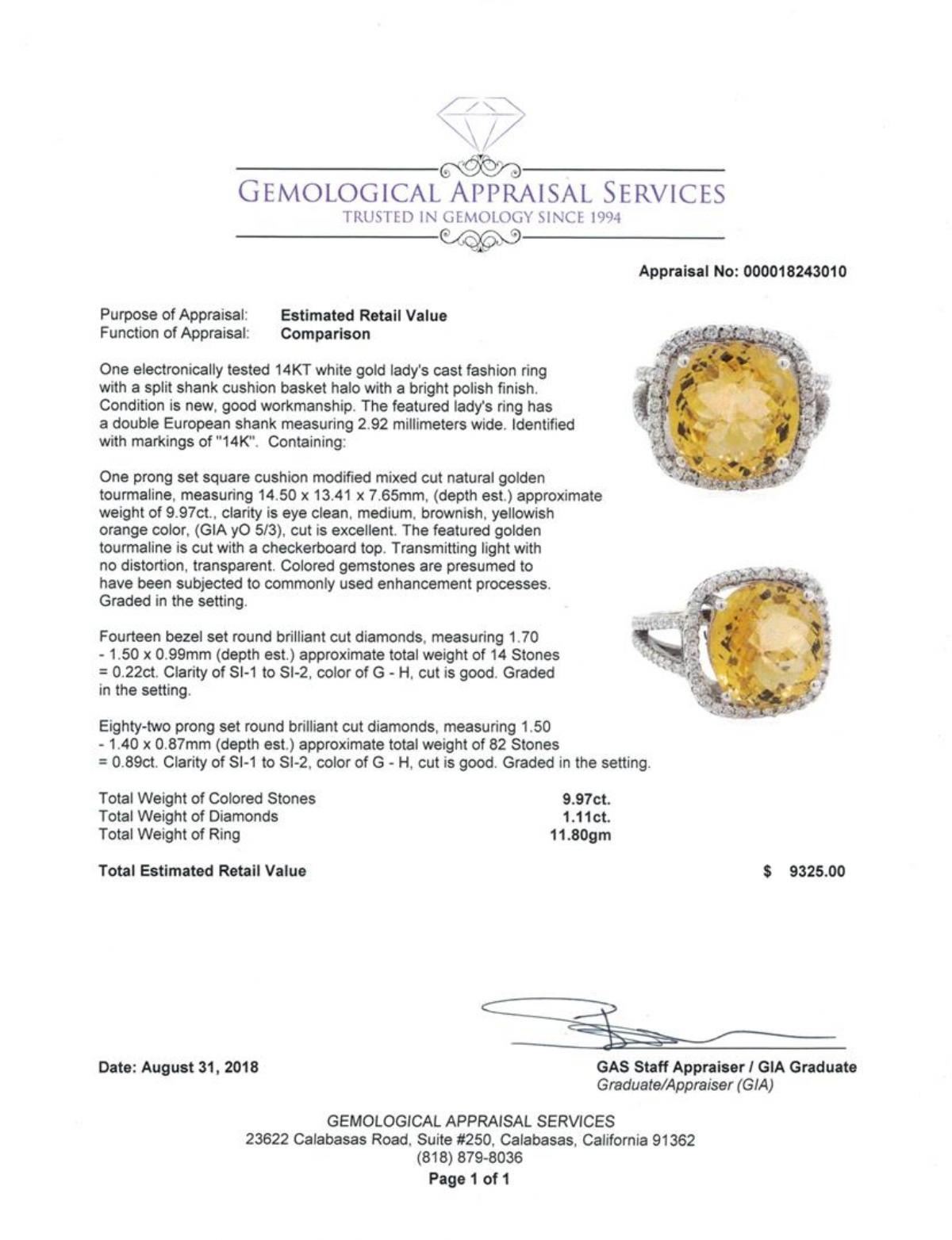 One electronically tested 14KT white gold lady's cast fashion ring with a split shank cushion basket halo with a bright polish finish. The featured lady's ring has a double European shank measuring 2.92 millimeters wide. Identified with markings of '14K'. Condition is new, good workmanship. Containing: One prong set square cushion modified mixed cut natural golden tourmaline, measuring 14.50 x 13.41 x 7.65mm, (depth est.) approximate weight of 9.97ct., clarity is eye clean, medium, brownish, yellowish orange color, (GIA yO 5/3), cut is excellent. The featured golden tourmaline is cut with a checkerboard top. Transmitting light with no distortion, transparent. Colored gemstones are presumed to have been subjected to commonly used enhancement processes. Graded in the setting. Fourteen bezel set round brilliant cut diamonds, measuring 1.70 - 1.50 x 0.99mm (depth est.) approximate total weight of 14 Stones = 0.22ct. Graded in the setting. Color G - H Clarity SI-1 to SI-2 Cut Good Eighty-Two prong set round brilliant cut diamonds, measuring 1.50 - 1.40 x 0.87mm (depth est.) approximate total weight of 82 Stones = 0.89ct. Graded in the setting. Color G - H Clarity SI-1 to SI-2 Cut Good. Total Weight of Colored Stones 9.97ct.. Total Weight of Diamonds 1.11ct.. Total Weight of Ring 11.80gm GAS Appraised at $9325.00. GAS Appraised.