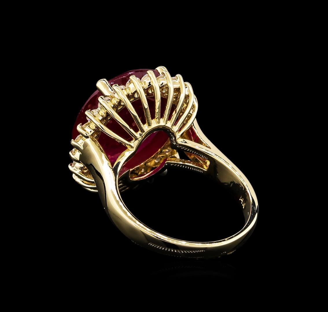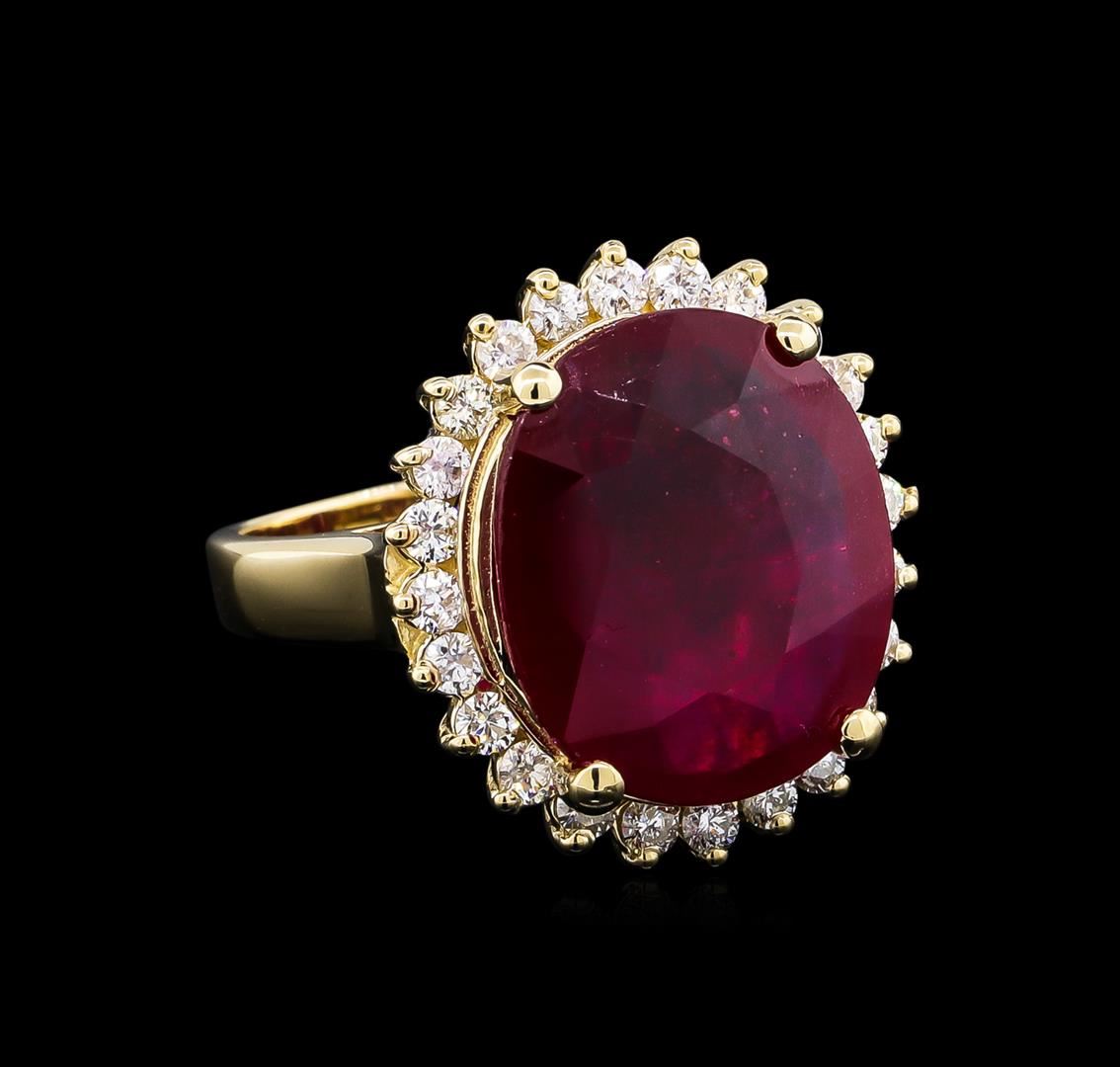 One electronically tested 14KT yellow gold lady's cast fashion ring with a basket halo with a bright polish finish. The featured lady's ring has a shank measuring 2.72 millimeters wide. Identified with markings of "14K". Condition is new, good workmanship. Containing: One prong set oval modified brilliant cut natural ruby, measuring 16.00 x 13.68 x 5.10mm, 10%. bulge factor, approximate weight of 11.08ct., clarity is heavily included, type II, medium dark, very slightly brownish, slightly purplish red color, (GIA slpR 6/3), cut is good. Transmitting light somewhat diffusely, transparent to translucent. Naturally occurring internal & external characteristics are present. Indications of laboratory high temperature heat treatment, with glass & flux additives. Graded in the setting. Twenty-Four prong set round brilliant cut diamonds, measuring 2.10 - 2.00 x 1.27mm (depth est.) approximate total weight of 24 Stones = 0.78ct. Graded in the setting. Clarity: VS-2 to SI-2. Color: I - Good. Total Weight of Colored Stones 11.08ct. Total Weight of Diamonds 0.78ct. Total Weight of Ring 9.00gm. GAS Appraised at $6,795.00.