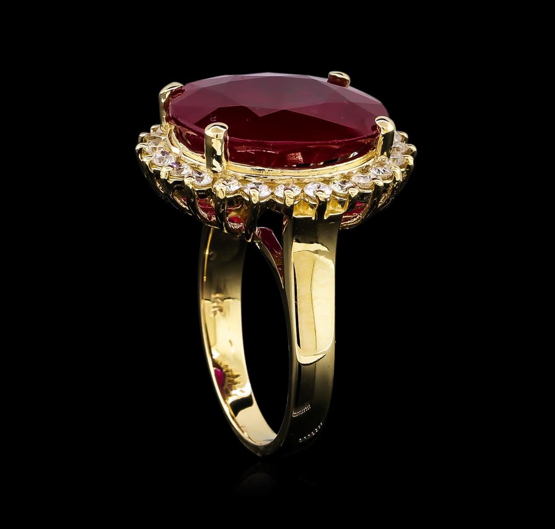 One electronically tested 14KT yellow gold lady's cast fashion ring with a basket halo with a bright polish finish. The featured lady's ring has a shank measuring 2.72 millimeters wide. Identified with markings of "14K". Condition is new, good workmanship. Containing: One prong set oval modified brilliant cut natural ruby, measuring 16.00 x 13.68 x 5.10mm, 10%. bulge factor, approximate weight of 11.08ct., clarity is heavily included, type II, medium dark, very slightly brownish, slightly purplish red color, (GIA slpR 6/3), cut is good. Transmitting light somewhat diffusely, transparent to translucent. Naturally occurring internal & external characteristics are present. Indications of laboratory high temperature heat treatment, with glass & flux additives. Graded in the setting. Twenty-Four prong set round brilliant cut diamonds, measuring 2.10 - 2.00 x 1.27mm (depth est.) approximate total weight of 24 Stones = 0.78ct. Graded in the setting. Clarity: VS-2 to SI-2. Color: I - Good. Total Weight of Colored Stones 11.08ct. Total Weight of Diamonds 0.78ct. Total Weight of Ring 9.00gm. GAS Appraised at $6,795.00.