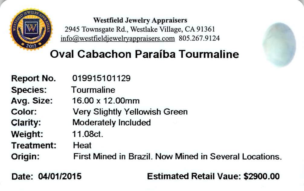 One oval cabochon cut natural Paraiba tourmaline exact weight 11.08ct., clarity is moderately included, cut is good. Westfield Appraised at $2,900.00.