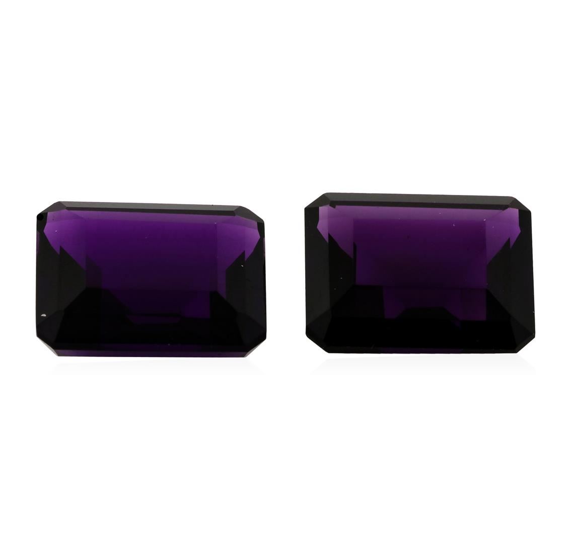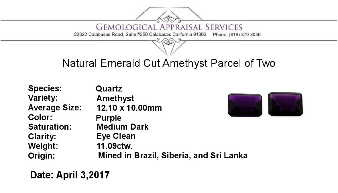 One natural emerald cut amethyst parcel of two with an exact weight of 11.09ctw., clarity is eye clean, purple, medium dark. Gemological Appraisals Services estimates the retail value at $377.06 GAS Appraised.